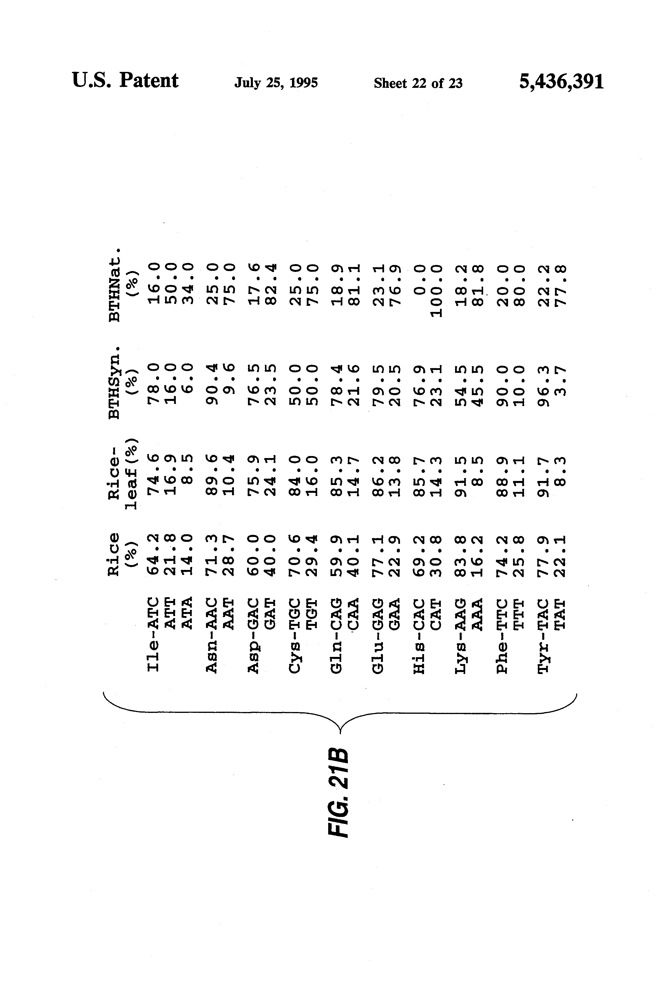 FIG. 21: An alignment of codon usages for individual amino acids observed in: Oryza gene; genes which appear to be expressed highly in leaves of rice plant; synthetic gene having a base sequence of SEQ ID NO:1; and native genes encoding individual amino acid in B.t. toxin.