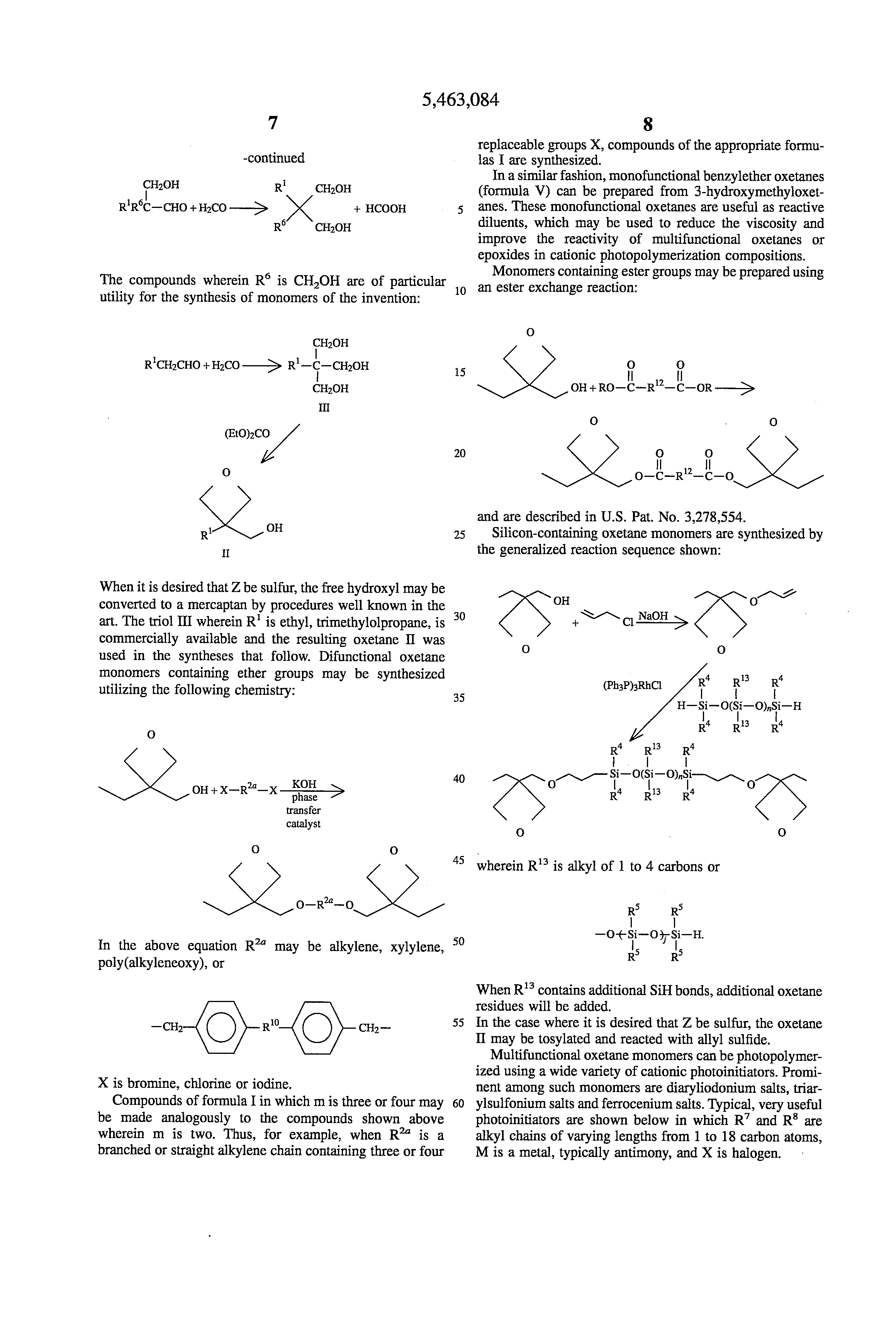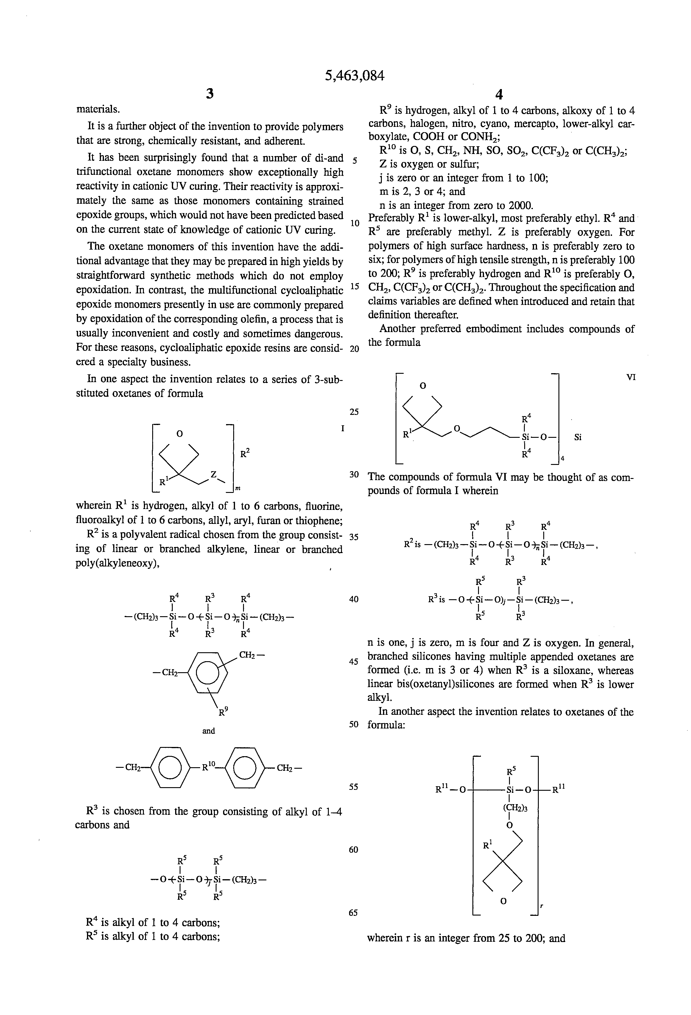 The oxetane monomers of this invention have the additional advantage that they may be prepared in high yields by straightforward synthetic methods which do not employ epoxidation. In contrast, the multifunctional cycloaliphatic epoxide monomers presently in use are commonly prepared by epoxidation of the corresponding olefin, a process that is usually inconvenient and costly and sometimes dangerous. For these reasons, cycloaliphatic epoxide resins are considered a specialty business.