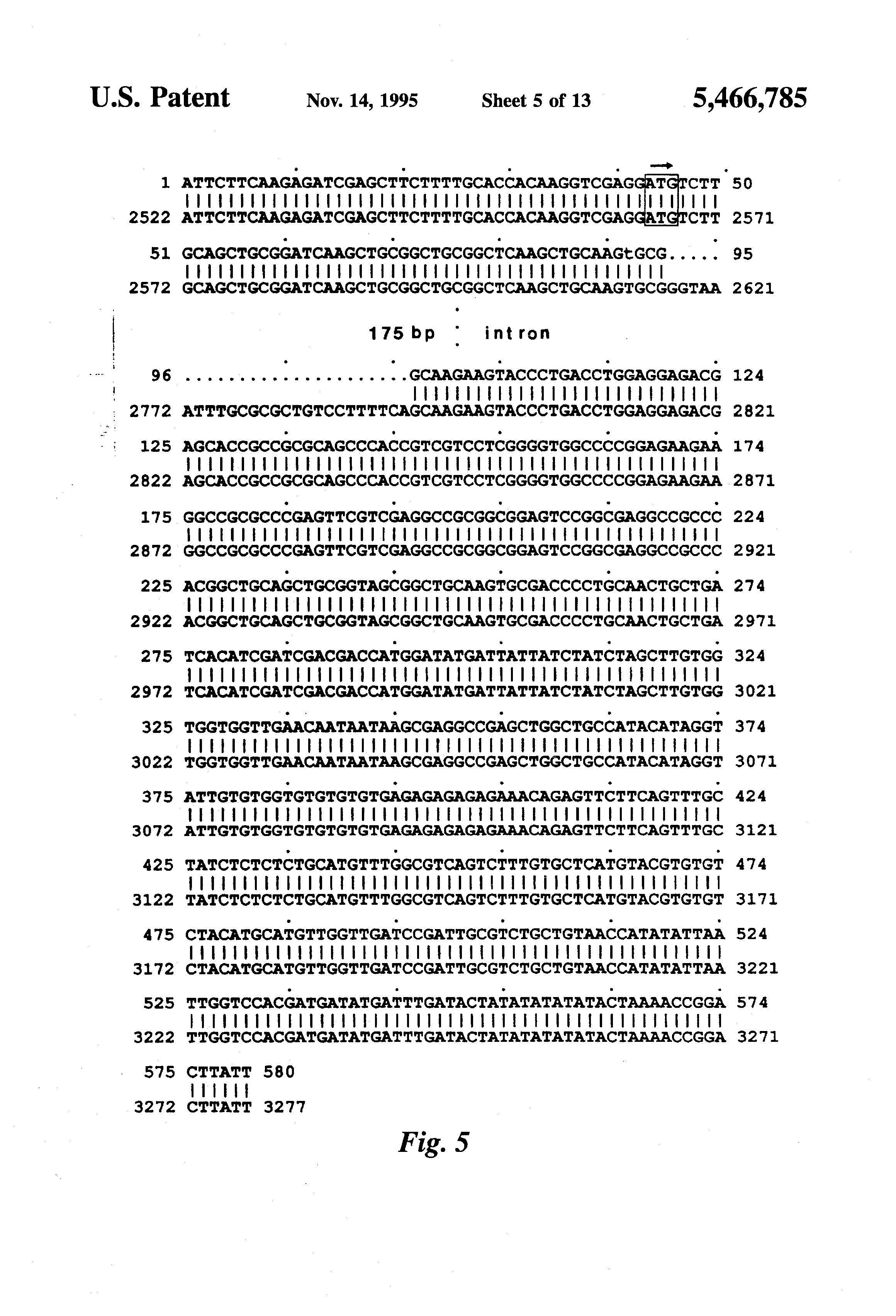 FIG. 5 shows the sequence of the tissue-preferential cDNA isolated from maize inbred line 211D (top sequence; SEQ ID NO:5) and of the genomic clone (bottom sequence; SEQ ID NO:1). Only part of the intron sequence is shown in this figure. The complete intron sequence is shown in FIG. 9. The start of translation is boxed and topped with an arrow.