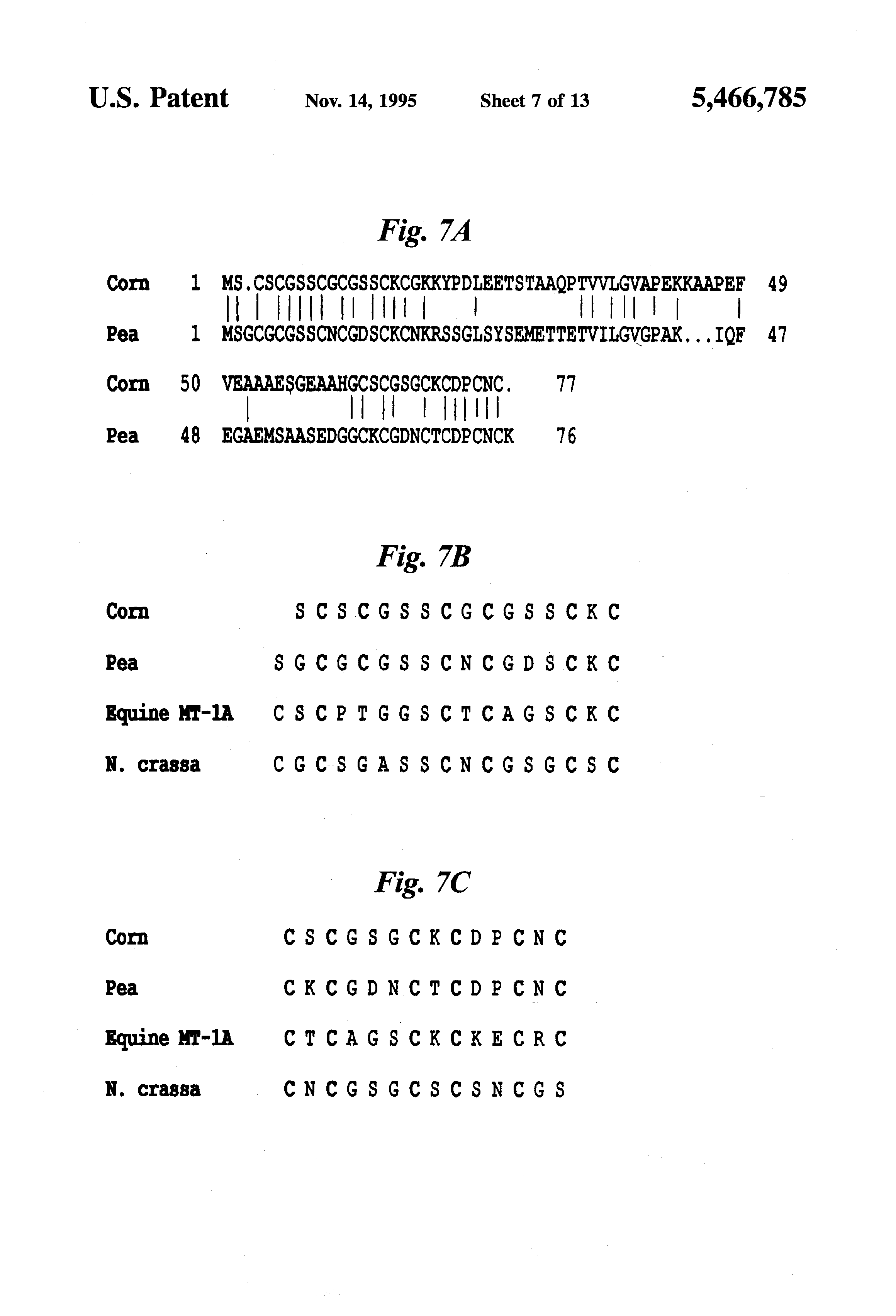 FIG. 7A: Alignment of the tissue-preferential gene product (SEQ ID NO:4) with that of the pea metallothionein reported by Evans et al. (SEQ ID NO:5) The vertical lines indicate matching amino acids.