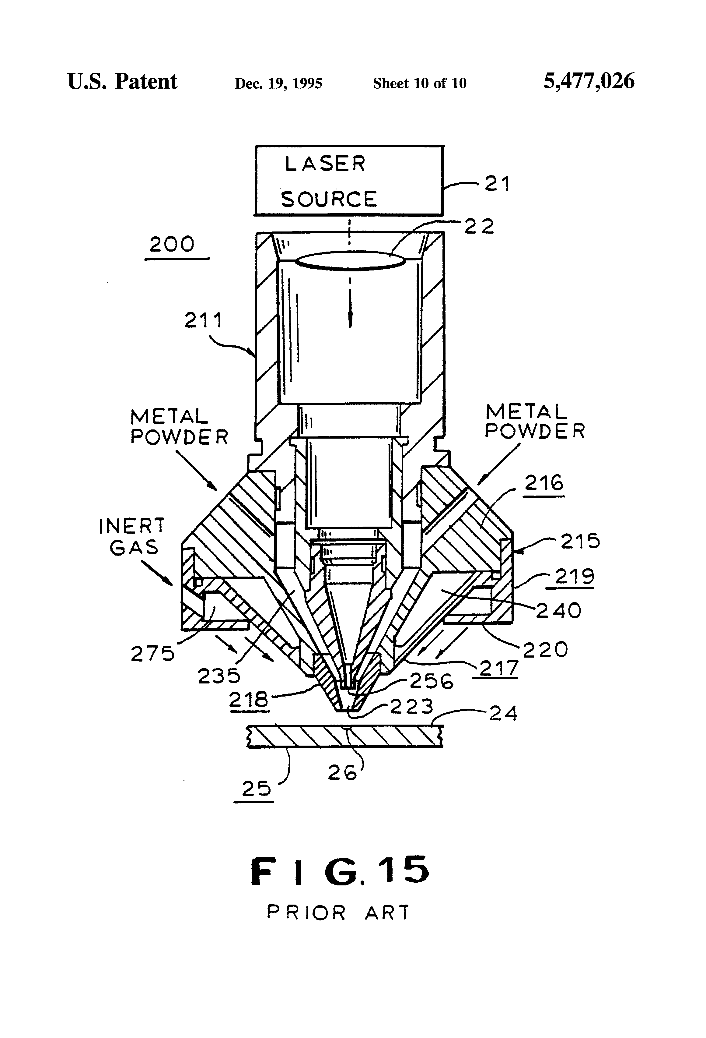 FIG. 15 is a longitudinal cross-section of a prior art construction for laser powered metal cladding apparatus in which inert shielding gas is introduced through a gas distributor that is outside of and surrounds the apparatus to the rear of the exit for the laser beam and metal particles that are used for welding.