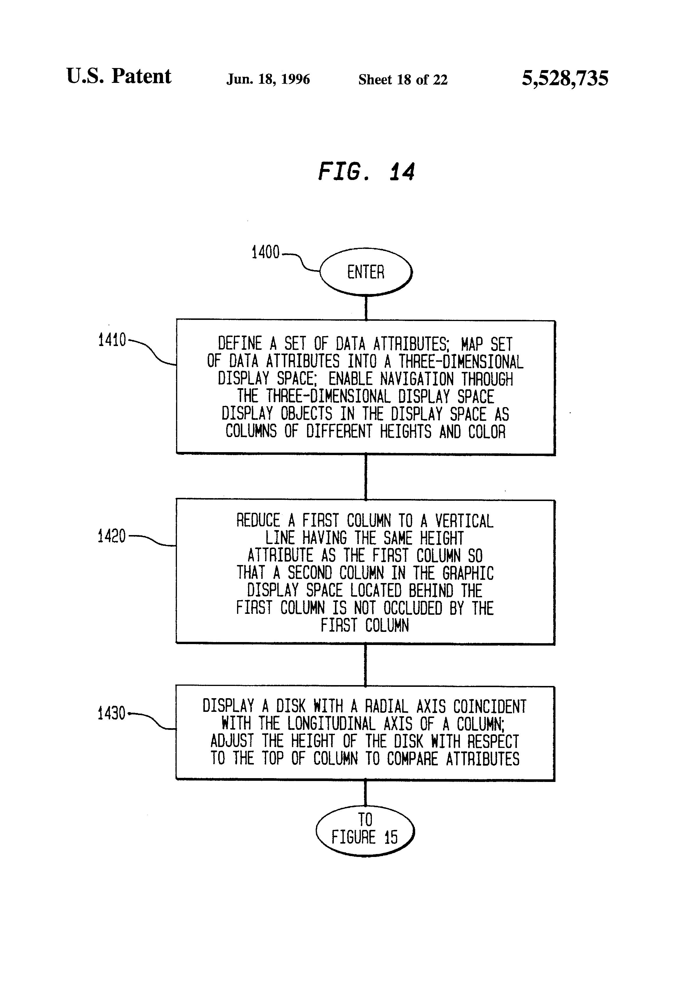 For example, in the sales data base example, at the individual level, a row of sales persons are presented as data objects. The sales person with the largest sales volume is represented as the largest object in the data representation. The size of the objects that represent the rest of the sales persons are shown relative to the size of the object representing the sales person with the largest sales volume. The next level in the sales data base is the department data base. The department level represent the sum of all the sales volumes for sales persons in the department, thus these cumulative sales figures are much larger than the sales volume for any one sales person. The heights for the departments are normalized so that their sizes are relative to the size of the object representing the department with the largest cumulative sales volume. Thus the object sizes on each level are normalized with each other in this example. Sizes between levels are not related in size.