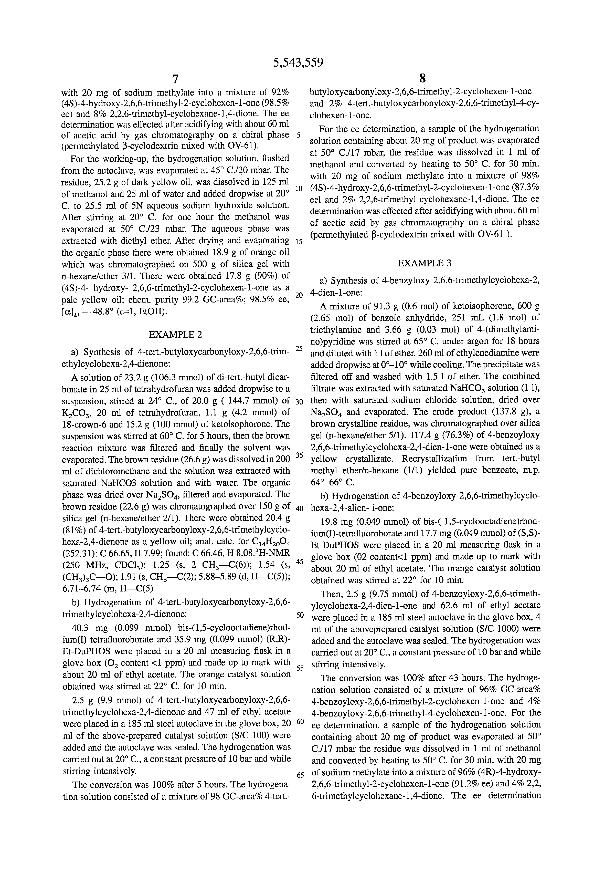 TABLE 1__________________________________________________________________________ ##STR13## ##STR14## ##STR15## ##STR16## ##STR17## ##STR18## ##STR19## ##STR20## ##STR21## ##STR22## ##STR23## ##STR24##__________________________________________________________________________ 4 (R,R)-EtDuPHOS CF3 SO3 100 Ethyl acetate 4 10 20 100 77 92.7 4a (R,R)-MeDuPHOS BF4 15000 Methyl acetate 48 10 20 100 93 97.5 5 (R,R)-EtDuPHOS PF6 100 Ethyl acetate 4 10 20 100 84 92.0 6 (R,R)-MeDuPHOS BF4 10000 Ethyl acetate 48 10 20 100 95 98.5 7 (R,R)-EtDuPHOS CF3 SO3 200 Ethyl acetate 4 5 20 99 78 90.7 8 (R,R)-EtDuPHOS BF4 10000 Ethyl acetate 80 10 20 100 91 98.3 9 (R,R)-EtDuPHOS BF4 10000 Ethyl acetate 24 50 20 99 92 96.410 (R,R)-EtDuPHOS BF4 10000 Ethyl acetate 24 10 60 96 89 96.911 (R,R)-EtDuPHOS BF4 10000 Ethyl acetate 24 50 60 94 91 97.112 (R,R)-EtDuPHOS BF4 10000 Ethyl acetate 12 10 100 99 85 89.213 (R,R)-EtDuPHOS BF4 500 Tetrahydrofuran 12 10 20 100 83 97.514 (R,R)-EtDuPHOS BF4 500 Toluene 12 10 60 99 80 83.815 (R,S)-PPFPCy2 BF4 100 Ethyl acetate 8 10 20 100 222) 79.616 (R,S)-PPFP(tBu)2 BF4 100 Ethyl acetate 8 10 20 100 123) 94.216a (R,S)-PPFP(tBu)2 BF4 5000 Ethyl acetate 12 10 20 78 97 83.916b (R,S)-PPFP(o-An)2 BF4 1000 Ethyl acetate 12 10 20 97 61 86.317 (S,S)-BCPM BF4 100 Ethyl acetate 8 10 20 100 474) 89.8(R)18 (R)-PROPHOS CF3 SO3 100 Ethyl acetate 4 10 20 100 65 81.319 (S,S,S)-MePHOS BF4 100 Ethyl acetate 12 10 20 96 70 70.8 MeOBIPHEP20 (S,S,R)-MePHOS BF4 100 Ethyl acetate 12 10 20 100 47 60.9 MeOBIPHEP21 (S)- BF4 100 Ethyl acetate 8 10 20 100 48 58.7 MeOBIPHEPHOS22 (S)-Cy4 -oxoProNOP BF4 1000 Ethyl acetate 12 10 20 1006) 79 90.6(R)__________________________________________________________________________ 1) Byproduct: 4Acetoxy-2,6,6-trimethyl-4-cyclohexen-1-one 2) Byproduct: 64 GCarea % 4acetoxy-2,6,6-trimethyl-4-cyclohexan-1-on 3) Byproduct: 77 GCarea % 4acetoxy-2,6,6-trimethyl-4-cyclohexan-1-on 4) Byproduct: 65 GCarea % 4acetoxy-2,6,6-trimethyl-4-cyelohexan-1-on ##STR25## 6) Conversion after 6 hours