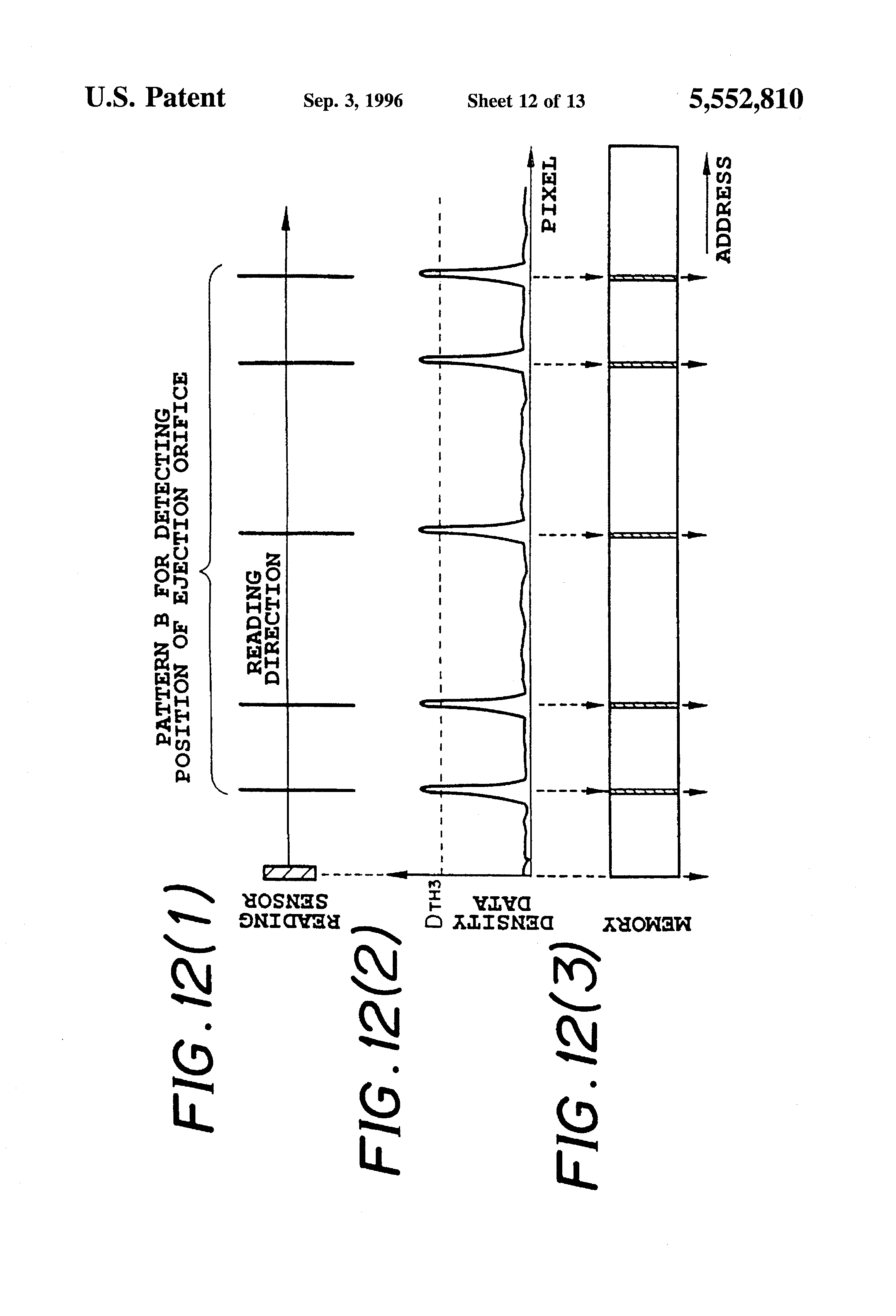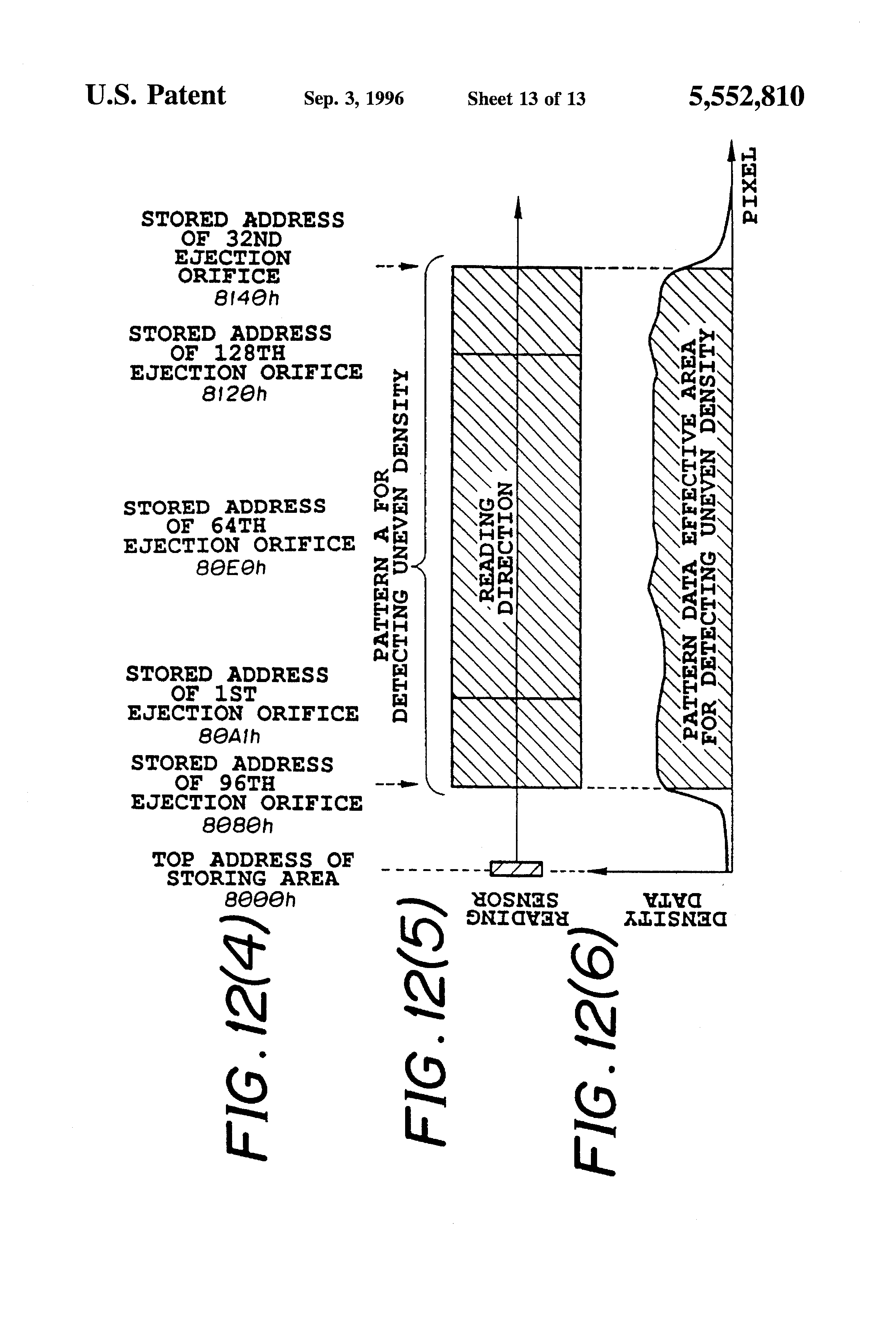 FIG. 7(c) is a plan view showing the direction in which the detection pattern of FIG. 6 is read read, and FIGS. 7(A) and 7(B) are graphs (A) (B) showing the relation between the level of density data on the uneven density pattern thus read or that of density data on the pattern of the ejection orifice position and an address over a memory;