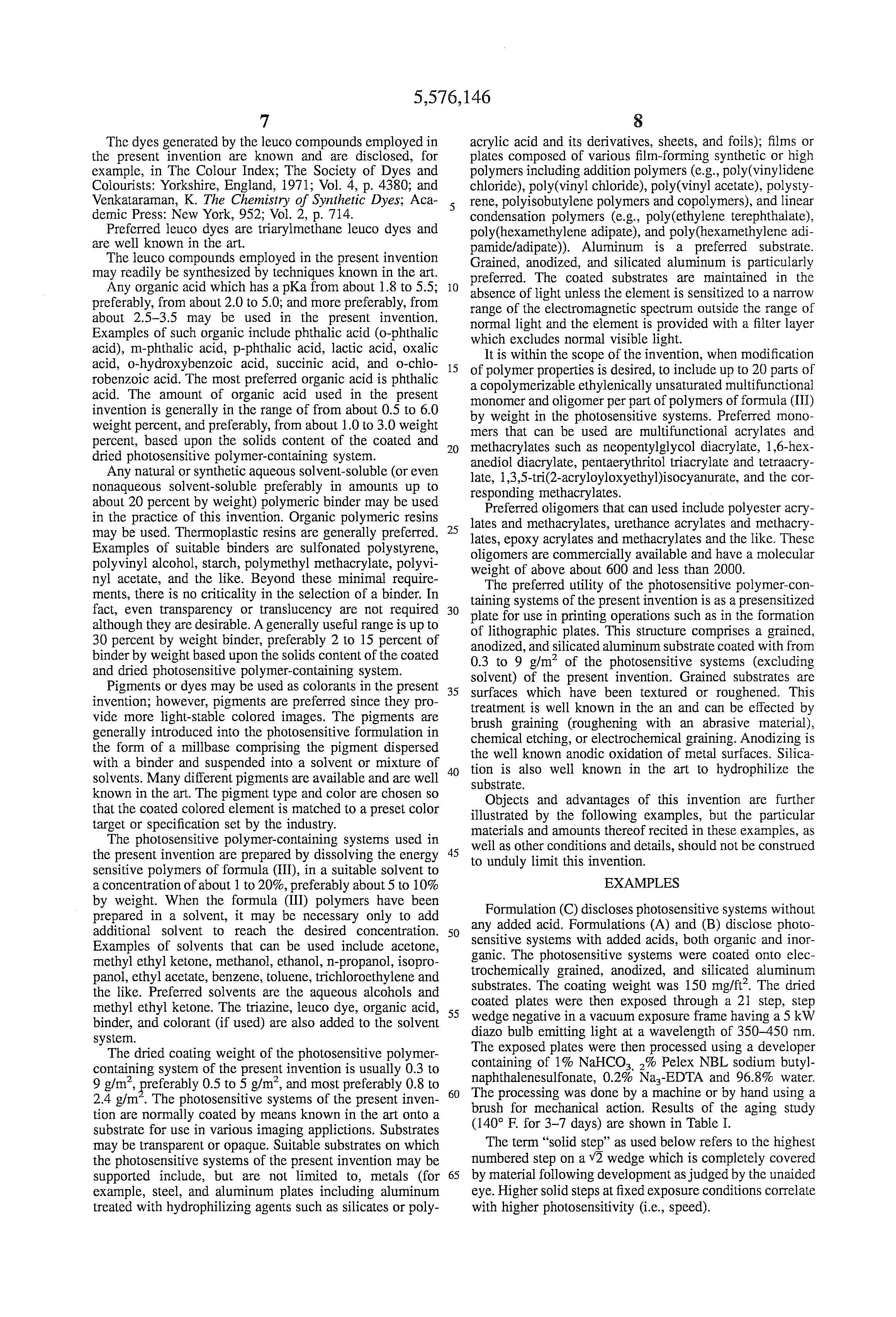 The dried coating weight of the photosensitive polymer-containing system of the present invention is usually 0.3 to 9 g/m2, preferably 0.5 to 5 g/m2, and most preferably 0.8 to 2.4 g/m2. The photosensitive systems of the present invention are normally coated by means known in the art onto a substrate for use in various imaging applictions. Substrates may be transparent or opaque. Suitable substrates on which the photosensitive systems of the present invention may be supported include, but are not limited to, metals (for example, steel, and aluminum plates including aluminum treated with hydrophilizing agents such as silicates or polyacrylic acid and its derivatives, sheets, and foils); films or plates composed of various film-forming synthetic or high polymers including addition polymers (e.g., poly(vinylidene chloride), poly(vinyl chloride), poly(vinyl acetate), polystyrene, polyisobutylene polymers and copolymers), and linear condensation polymers (e.g., poly(ethylene terephthalate), poly(hexamethylene adipate), and poly(hexamethylene adipamide/adipate)). Aluminum is a preferred substrate. Grained, anodized, and silicated aluminum is particularly preferred. The coated substrates are maintained in the absence of light unless the element is sensitized to a narrow range of the electromagnetic spectrum outside the range of normal light and the element is provided with a filter layer which excludes normal visible light.