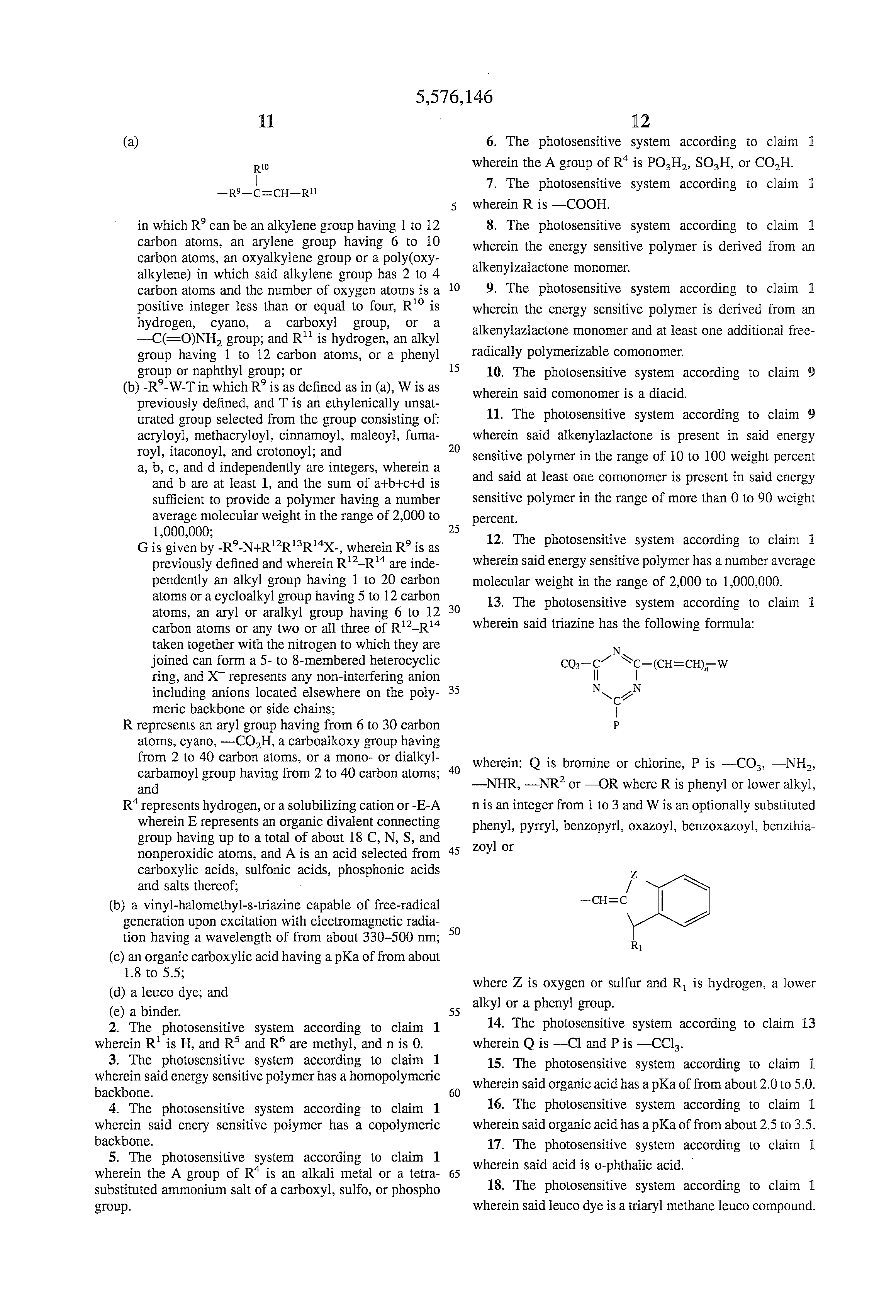 The s-triazine compounds as described above generate free radicals when irradiated with actinic radiation of a wavelength from about 330 to about 500 nm, preferably from about 350-450 nm, and most preferably at wavelengths of 365 and 410 nm. Such triazines are well known to those of ordinary skill in the art and are disclosed in U.S. Pat. No. 3,954,475. Suitable sources of radiation include, but are not limited to, mercury, xenon, carbon arc and tungsten filament lamps, lasers, sunlight, etc. Exposures may be from less than about 1 microsecond to 10 minutes or more depending upon the amounts of energy sensitive polymer and triazine being utilized and depending upon the radiation source and distance from the source and thickness of the coating to be cured. Electron beam may also be used. The triazine compound is used in an amount of from about 0.5 to 15.0 percent by weight, and preferably from about 3.0 to 10.0 weight percent, of the solids content of the coated and dried photosensitive polymer-containing system.