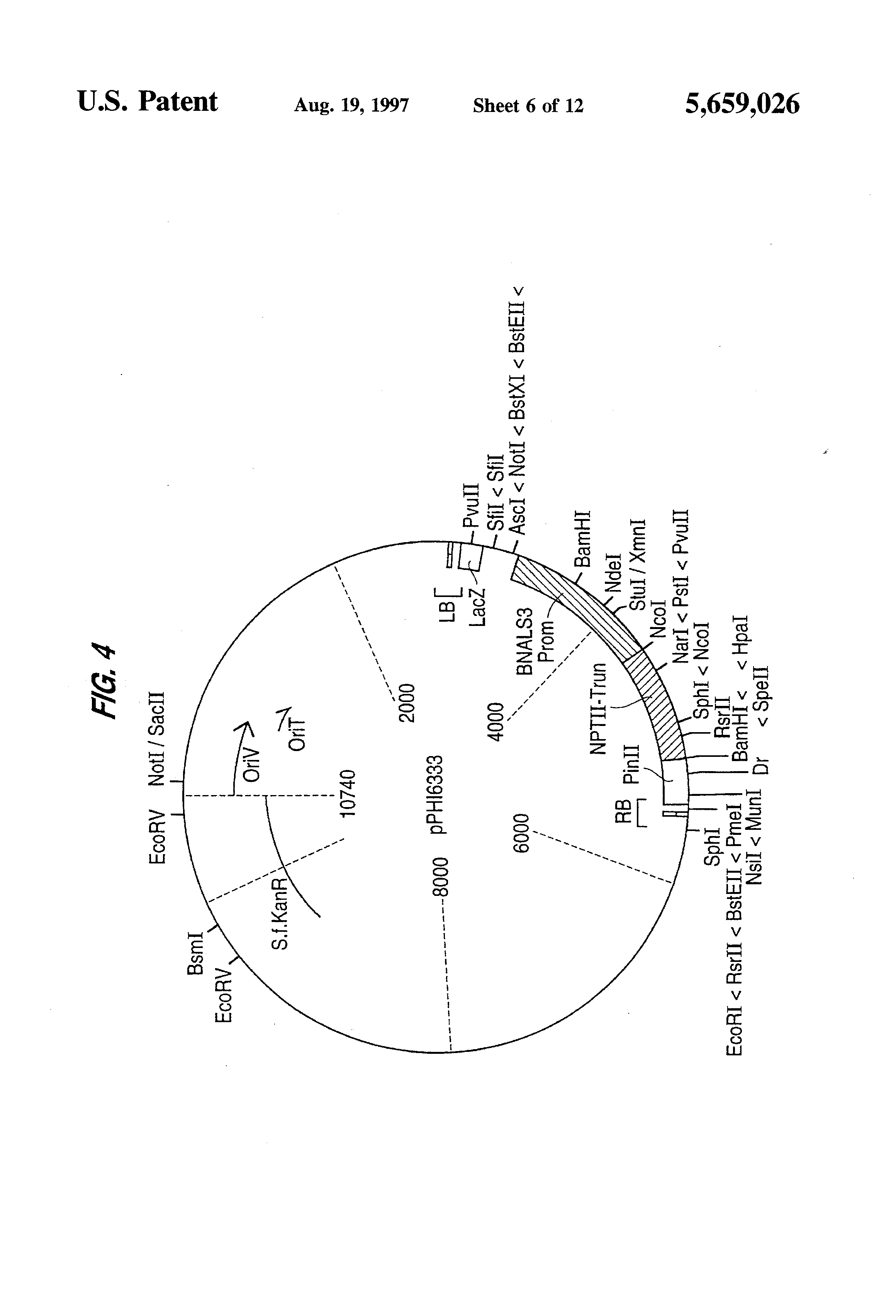 FIG. 4 presents a map of pPHI6333 which is a binary vector containing a cassette comprising the B. napus ALS3 promoter (BNALS3 PROM), NPTII gene and the 3-prime terminator sequence from the potato proteinase inhibitor gene (PINII). Plasmid pPHI6333 was used to transform sunflower to ascertain the suitability of this promoter for driving selectable marker expression. LB and RB represent the left and right borders, respectively, of the Agrobacterium Ti plasmid T-DNA region.