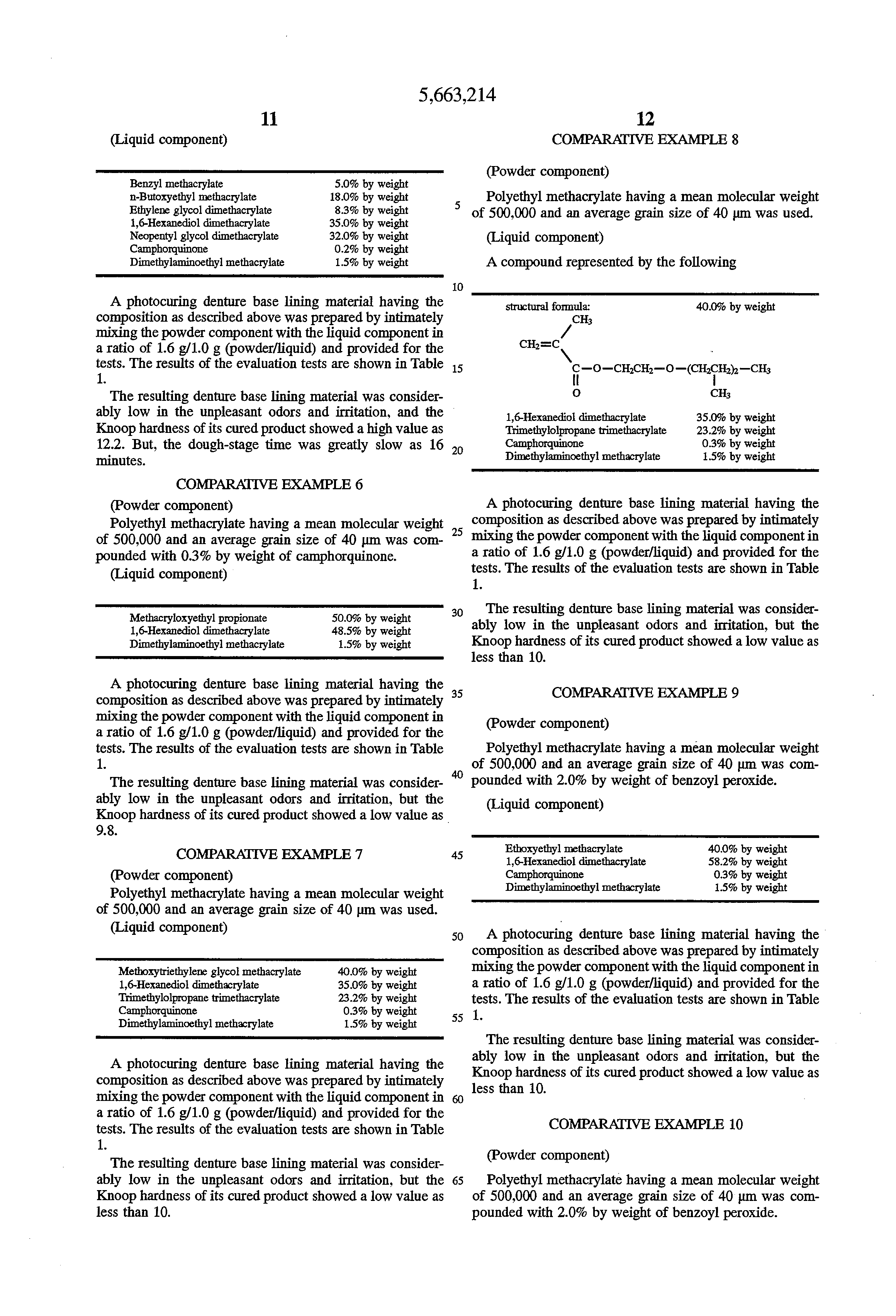 TABLE 1______________________________________ Dough-stage Knoop Time Hardness at 23° C. (K.H.N.) (min.) Odors Irritation______________________________________Example 1 10.9 8.5 ◯ ◯Example 2 11.5 7.6 ◯ ◯Example 3 11.0 8.2 ◯ ◯Example 4 11.6 8.9 ◯ ◯Example 5 10.6 9.5 ◯ ◯Example 6 10.8 9.8 ◯ ◯Example 7 11.8 8.0 ◯ ◯Comparative 9.5 10.5 ◯ ◯Example 1Comparative 11.8 9.1 Δ ◯Example 2Comparative 11.9 7.9 Δ ◯Example 3Comparative 9.1 7.8 ◯ ◯Example 4Comparative 12.2 16.0 ◯ ◯Example 5Comparative 9.8 8.5 ◯ ◯Example 6Comparative 9.7 9.8 ◯ ◯Example 7Comparative 9.5 9.5 ◯ ◯Example 8Comparative 9.5 9.1 ◯ ◯Example 9Comparative 10.3 16.5 ◯ ◯Example 10______________________________________