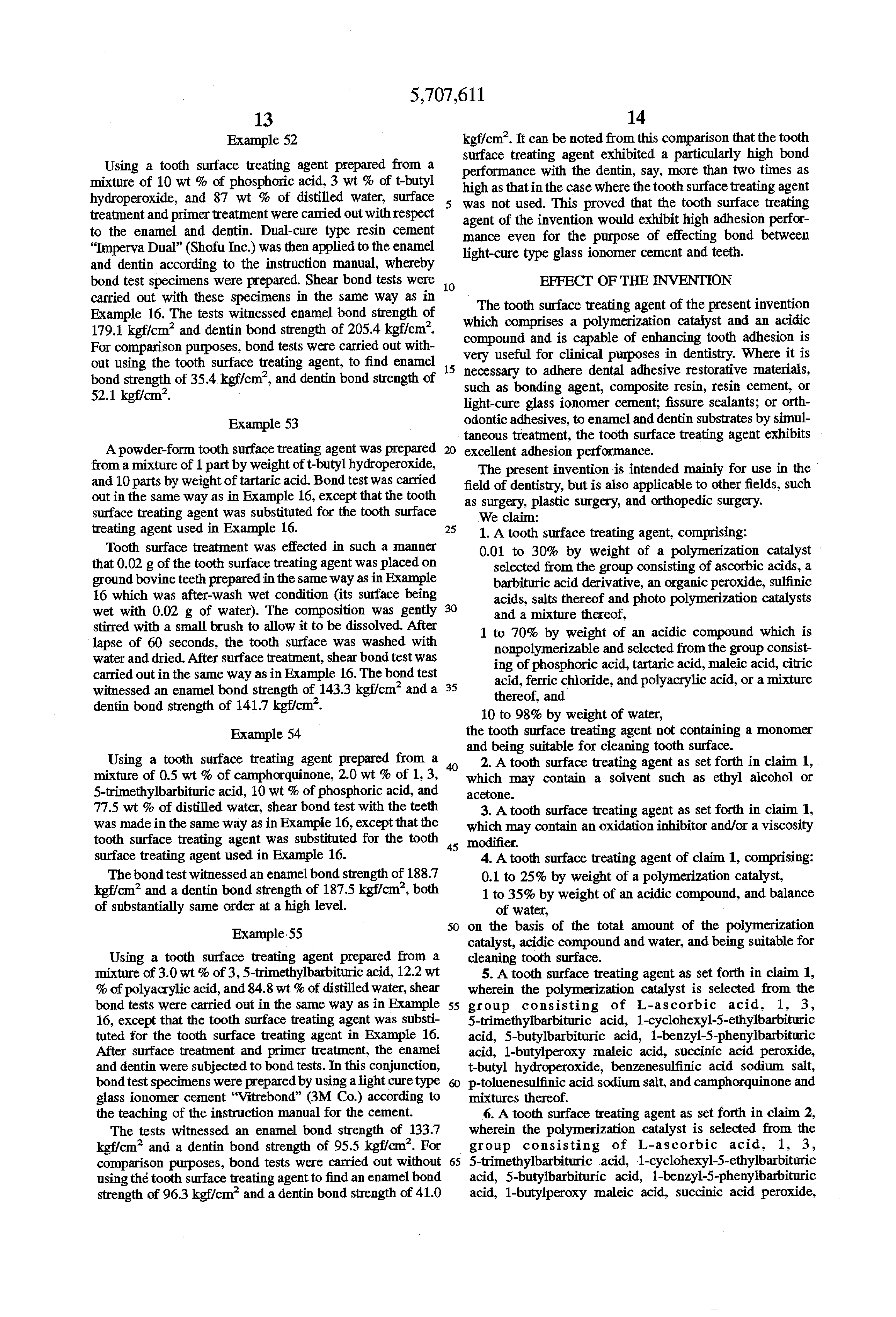 From Table 3 results, it is apparent that tooth surface treating agents which are composed of polymerization catalyst, acidic compound, and water as in Examples 8 to 11 can impart high bond effect to both the enamel and the dentin. The results indicate that they are effective for use as tooth surface treating agents for simultaneous treatment of the enamel and dentin. In contrast, compositions of Comparative Examples 6 and 7, wherein either polymerization catalyst or acidic compound was not present, could not provide any sufficient adhesion with respect to the adherends and were found unsatisfactory for tooth surface treating purposes.