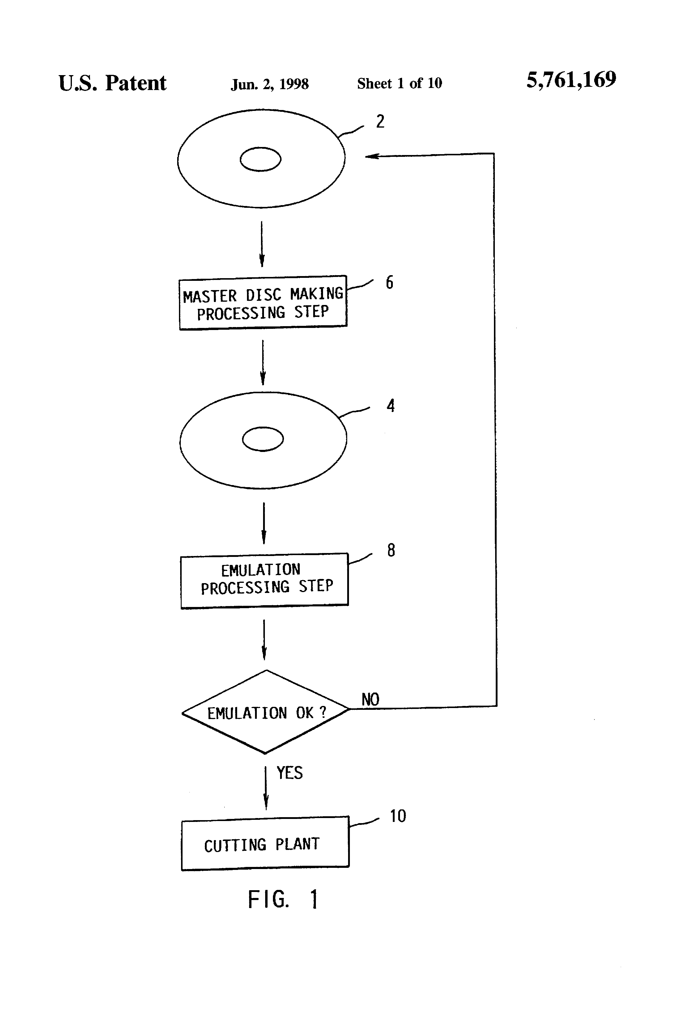 On the other hand, the master disc for emulation 4 comprises an optical magnetic disc which is capable of recording and reproducing, and in the course of this production, the master disc for emulation 4 processes the user data recorded on the user data disc 2 at the master disc production processing step 6 and this user data is recorded and formed with the prescribed format.
