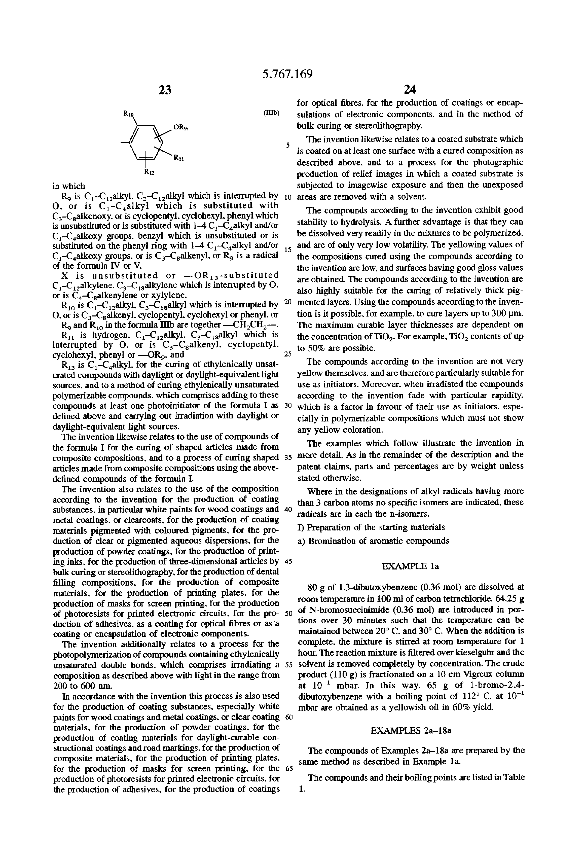 Portions of this composition are mixed with 0.4% or 1%, based on the overall quantity, of the photoinitiator according to the invention by stirring at 60° C. for one hour. All operations are carried out under red light. The initiator-treated samples are applied to 300 μm aluminium foil using a 100 μm doctor knife. The thickness of the dry film is 60-70 μm. A 76 μm thick polyester film is applied to this film, and on top of the polyester film is placed a standardized test negative with 21 steps of different optical density (Stauffer wedge). The sample is covered with a second UV-transparent film and pressed onto a metal plate by means of vacuum. Exposure takes place in a first test series for 5 seconds, in a second series for 10 seconds and then in a third series for 20 seconds, using an iron-doped Sylvania M061/5 kW lamp at a distance of 30 cm. After exposure, the films and the mask are removed and the exposed film is developed in ethanol for 10 seconds in an ultrasound bath at 23° C. Drying is then carried out in a convection oven at 40° C. for 5 minutes. The sensitivity of the initiator system used is characterized by indicating the last wedge step which is imaged without tackiness. The higher the number of steps, the more sensitive the system tested. The results are compiled in Table 10.
