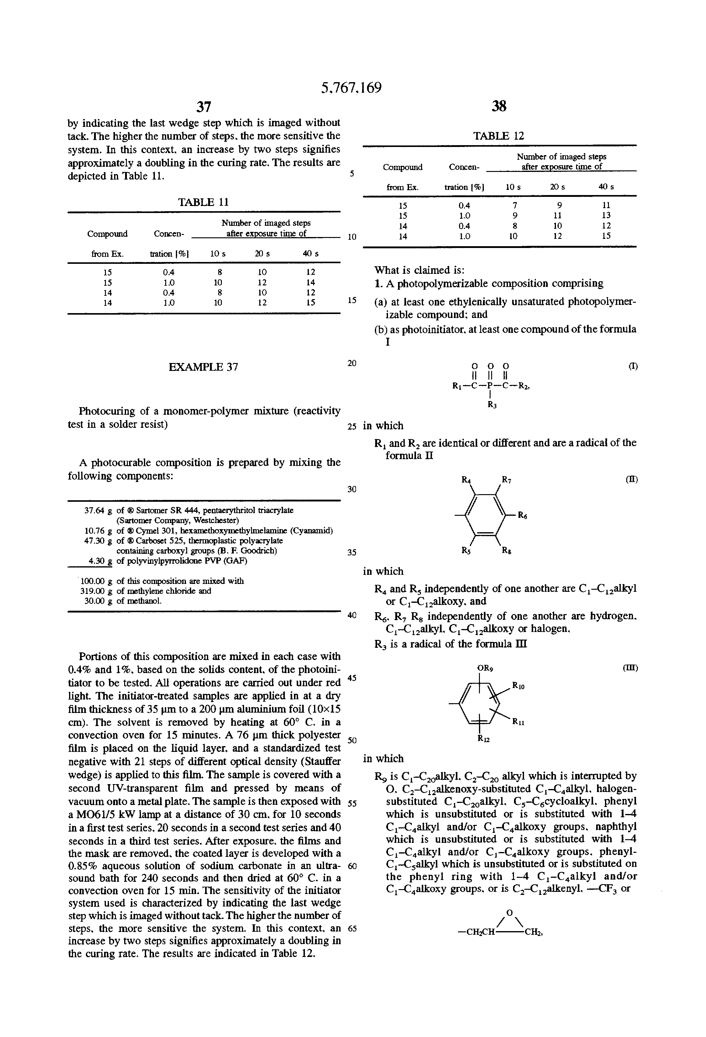 Portions of this composition are mixed in each case with 0.4% and 1%, based on the solids content, of the photoinitiator to be tested. All operations are carried out under red light. The initiator-treated samples are applied in at a dry film thickness of 35 μm to a 200 μm aluminium foil (10×15 cm). The solvent is removed by heating at 60° C. in a convection oven for 15 minutes. A 76 μm thick polyester film is placed on the liquid layer, and a standardized test negative with 21 steps of different optical density (Stauffer wedge) is applied to this film. The sample is covered with a second UV-transparent film and pressed by means of vacuum onto a metal plate. The sample is then exposed with a MO61/5 kW lamp at a distance of 30 cm, for 10 seconds in a first test series, 20 seconds in a second test series and 40 seconds in a third test series. After exposure, the films and the mask are removed, the coated layer is developed with a 0.85% aqueous solution of sodium carbonate in an ultrasound bath for 240 seconds and then dried at 60° C. in a convection oven for 15 min. The sensitivity of the initiator system used is characterized by indicating the last wedge step which is imaged without tack. The higher the number of steps, the more sensitive the system. In this context, an increase by two steps signifies approximately a doubling in the curing rate. The results are indicated in Table 12.