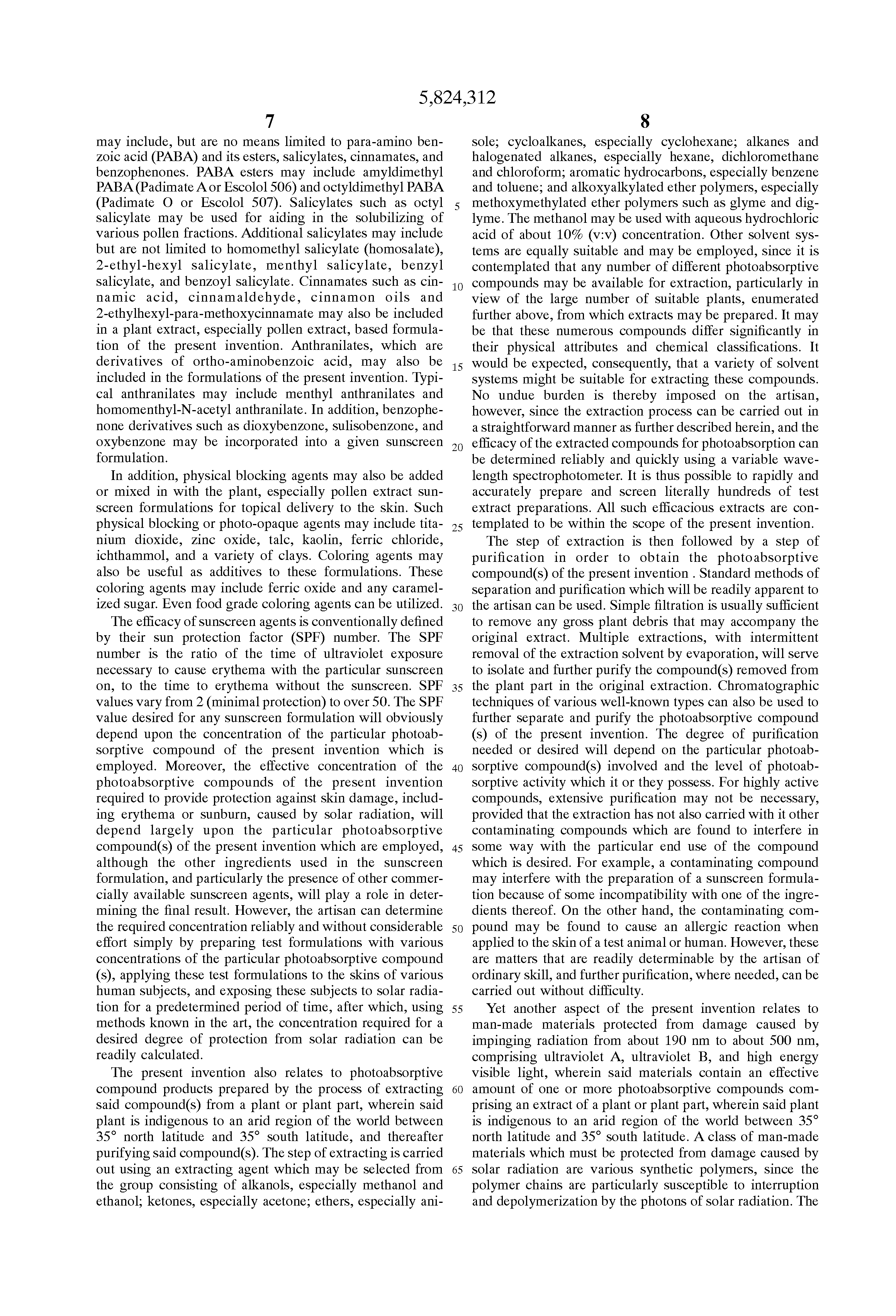 The step of extraction is then followed by a step of purification in order to obtain the photoabsorptive compound(s) of the present invention . Standard methods of separation and purification which will be readily apparent to the artisan can be used. Simple filtration is usually sufficient to remove any gross plant debris that may accompany the original extract. Multiple extractions, with intermittent removal of the extraction solvent by evaporation, will serve to isolate and further purify the compound(s) removed from the plant part in the original extraction. Chromatographic techniques of various well-known types can also be used to further separate and purify the photoabsorptive compound(s) of the present invention. The degree of purification needed or desired will depend on the particular photoabsorptive compound(s) involved and the level of photoabsorptive activity which it or they possess. For highly active compounds, extensive purification may not be necessary, provided that the extraction has not also carried with it other contaminating compounds which are found to interfere in some way with the particular end use of the compound which is desired. For example, a contaminating compound may interfere with the preparation of a sunscreen formulation because of some incompatibility with one of the ingredients thereof. On the other hand, the contaminating compound may be found to cause an allergic reaction when applied to the skin of a test animal or human. However, these are matters that are readily determinable by the artisan of ordinary skill, and further purification, where needed, can be carried out without difficulty.
