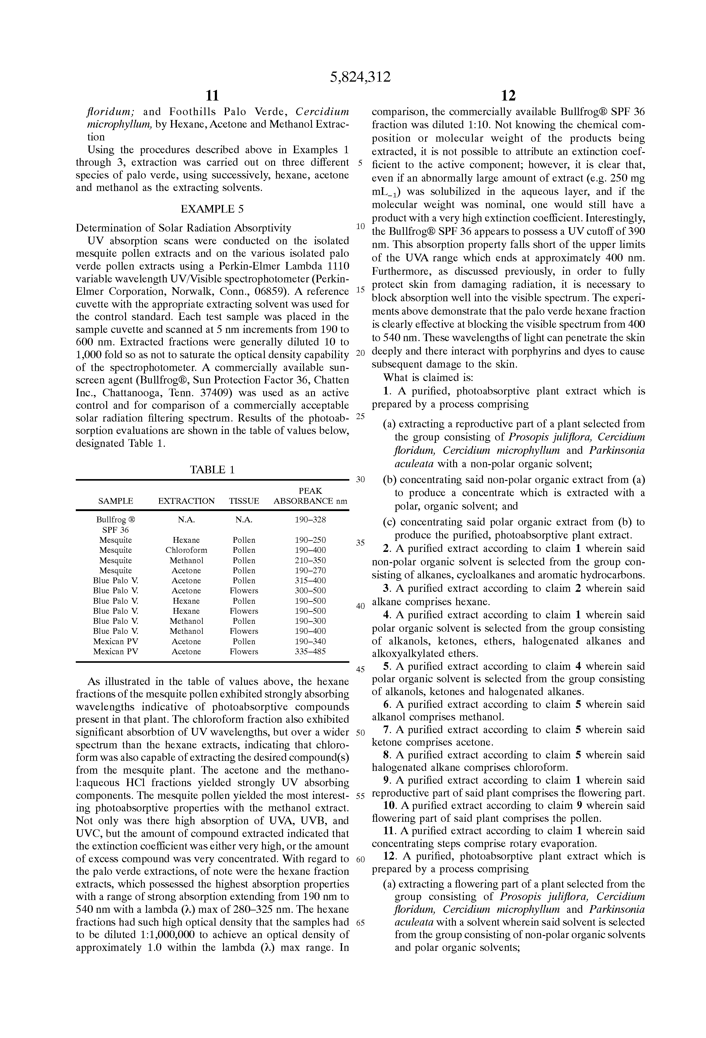 UV absorption scans were conducted on the isolated mesquite pollen extracts and on the various isolated palo verde pollen extracts using a Perkin-Elmer Lambda 1110 variable wavelength UV/Visible spectrophotometer (Perkin-Elmer Corporation, Norwalk, Conn., 06859). A reference cuvette with the appropriate extracting solvent was used for the control standard. Each test sample was placed in the sample cuvette and scanned at 5 nm increments from 190 to 600 nm. Extracted fractions were generally diluted 10 to 1,000 fold so as not to saturate the optical density capability of the spectrophotometer. A commercially available sunscreen agent (Bullfrog®, Sun Protection Factor 36, Chatten Inc., Chattanooga, Tenn. 37409) was used as an active control and for comparison of a commercially acceptable solar radiation filtering spectrum. Results of the photoabsorption evaluations are shown in the table of values below, designated Table 1.