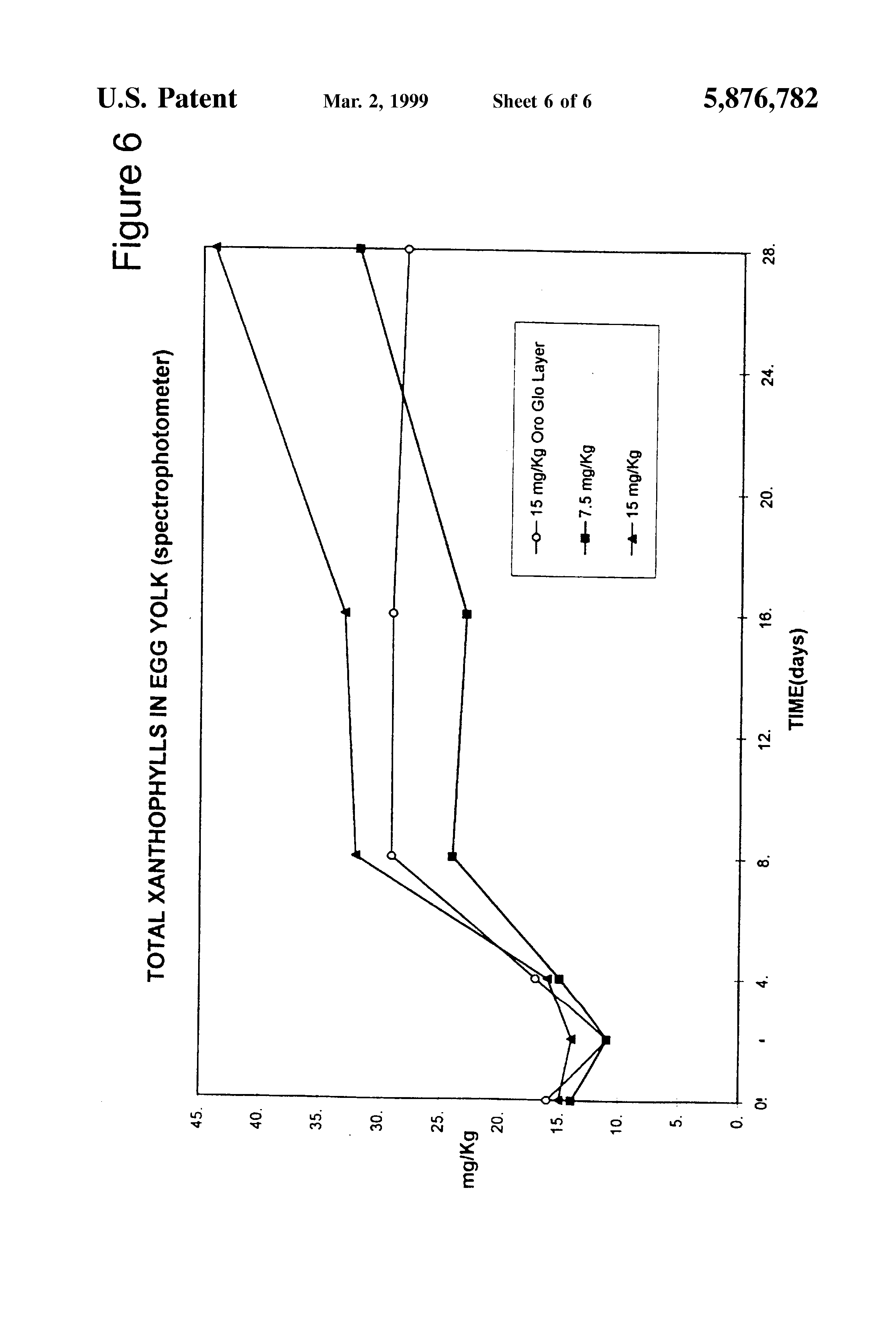 FIG. 6 shows the mg/Kg of xanthophylls in the egg yolks over days of the three treatments.