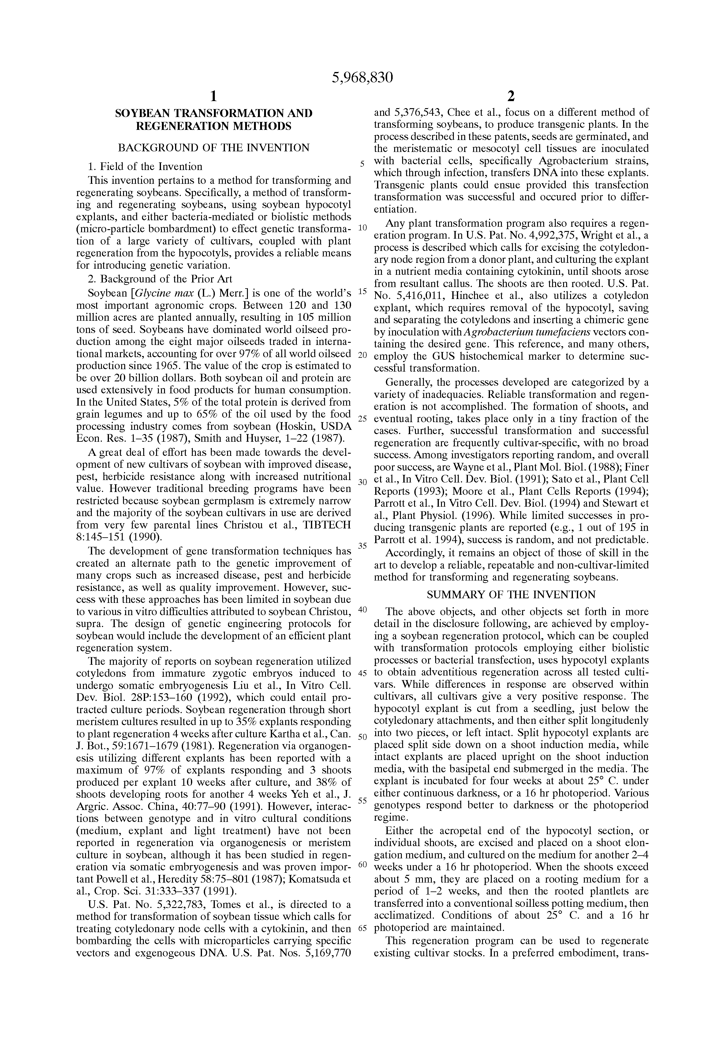 U.S. Pat. No. 5,322,783, Tomes et al., is directed to a method for transformation of soybean tissue which calls for treating cotyledonary node cells with a cytokinin, and then bombarding the cells with microparticles carrying specific vectors and exgenogeous DNA. U.S. Pat. Nos. 5,169,770 and 5,376,543, Chee et al., focus on a different method of transforming soybeans, to produce transgenic plants. In the process described in these patents, seeds are germinated, and the meristematic or mesocotyl cell tissues are inoculated with bacterial cells, specifically Agrobacterium strains, which through infection, transfers DNA into these explants. Transgenic plants could ensue provided this transfection transformation was successful and occured prior to differentiation.