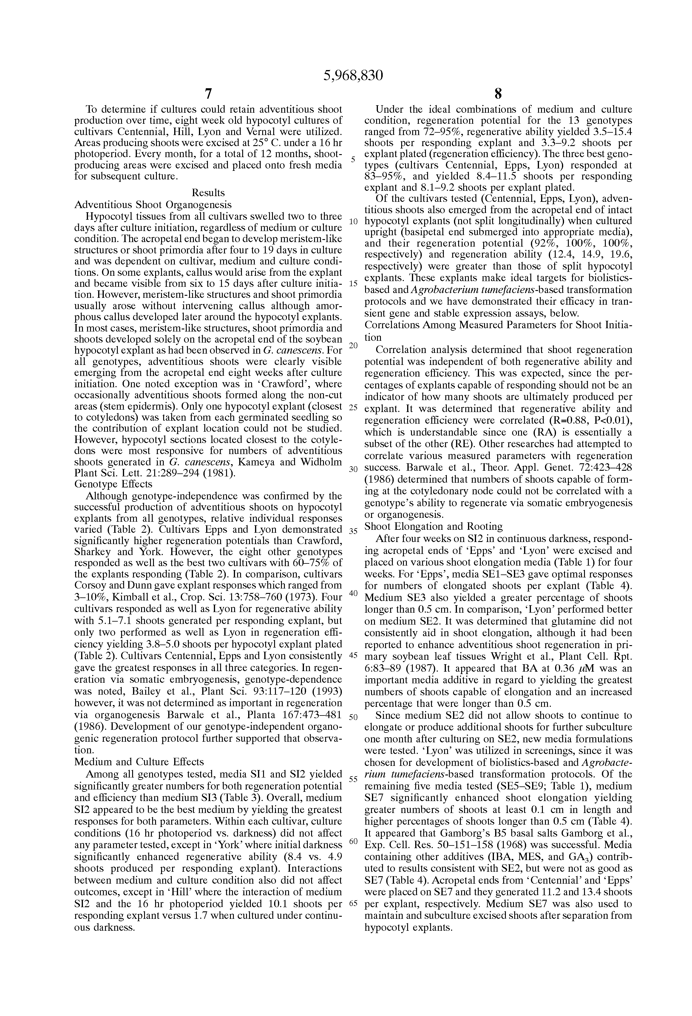 Correlation analysis determined that shoot regeneration potential was independent of both regenerative ability and regeneration efficiency. This was expected, since the percentages of explants capable of responding should not be an indicator of how many shoots are ultimately produced per explant. It was determined that regenerative ability and regeneration efficiency were correlated (R=0.88, P<0.01), which is understandable since one (RA) is essentially a subset of the other (RE). Other researches had attempted to correlate various measured parameters with regeneration success. Barwale et al., Theor. Appl. Genet. 72:423-428 (1986) determined that numbers of shoots capable of forming at the cotyledonary node could not be correlated with a genotype's ability to regenerate via somatic embryogenesis or organogenesis.