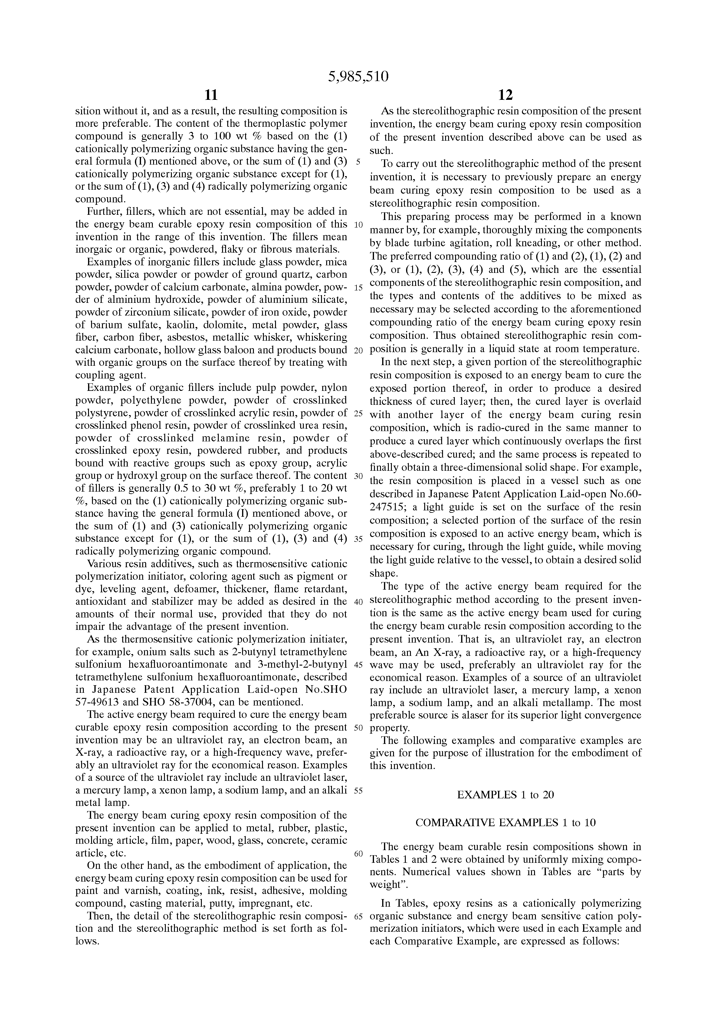 Furthermore, cationically curable stereolithographic resins as described in Japanese Patent Application Laid-open No.HEI 1-213304, No.HEI 2- 28261 and No.HEI 2-75618, have such superior charasteristic properties that the post cure process are not necessary and the deformation are little, as the curing proceeds through an active group even after the beam to be exposed are shut down, and it is also easy to obtain a molding with desirable dimension because of small shrinkage on curing. However, these resins have such disadvantages that they have insufficient sensitivity to an energy beam to be exposed, and the cured articles show the deformation by humidity-absorption because of its humidity-absorption.