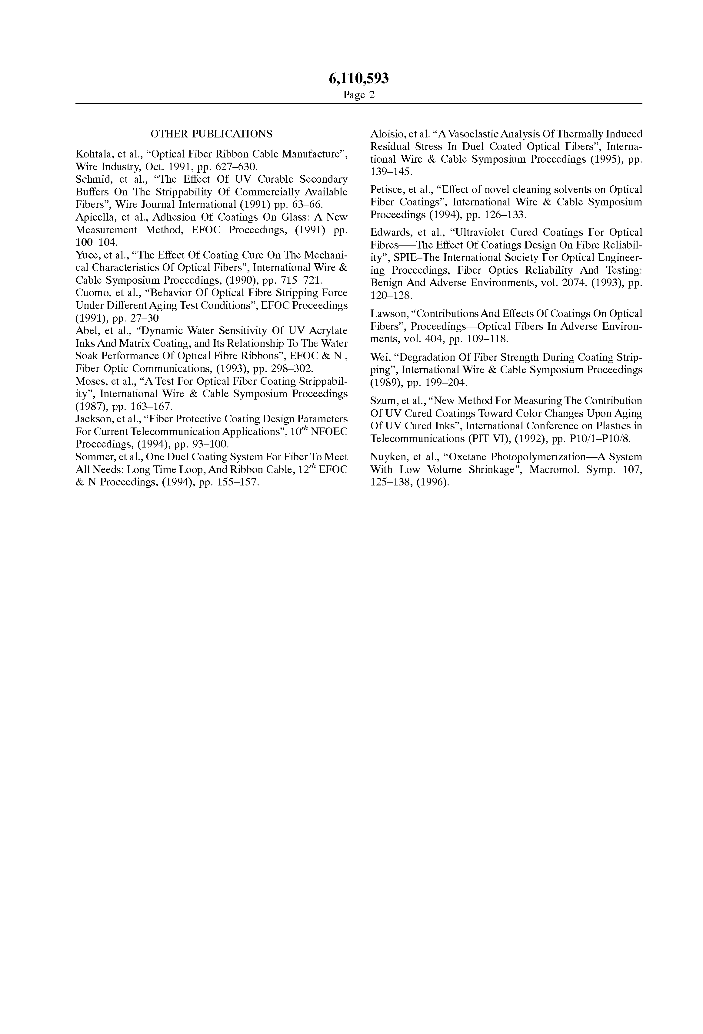 | 43 | * | Toler, et al., Factors Affecting Mechanical Stripping of Polymer Coatings From Optical Fibers , International Wire & Cable Symposium Proceedings (1989). |