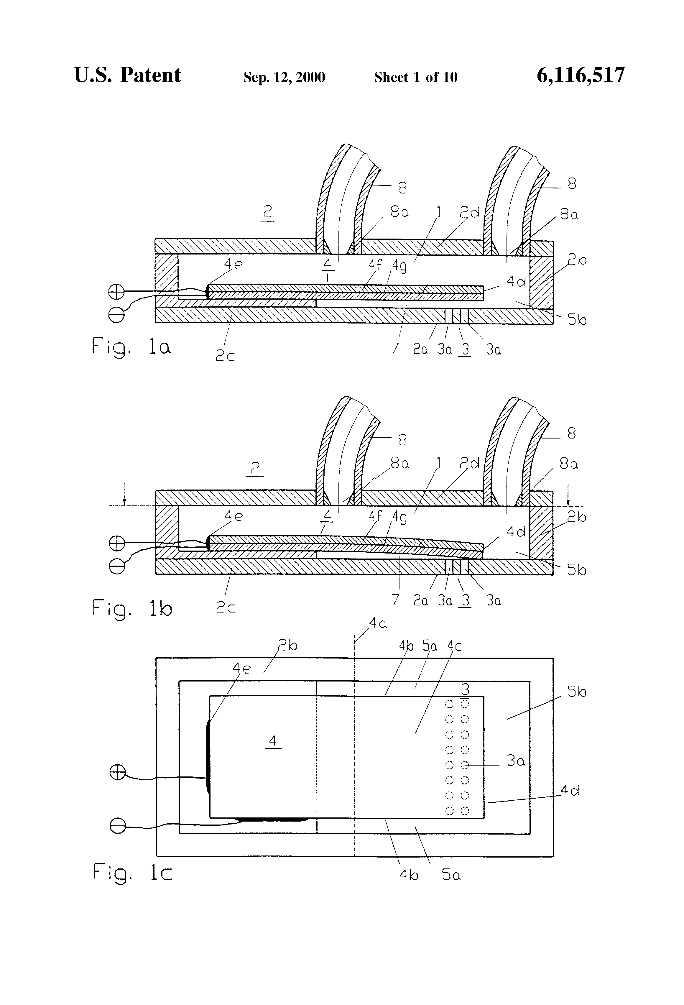 In FIGS. 10, 11, and 12 working forms can be seen in which the pump chamber 1 and the nozzles 3a are essentially designed as in the working forms of FIGS. 7, 8, and 9. But the piezoelectric flexural transducer 4 is not attached to only one casing component part 2c (as in FIGS. 7, 8, and 9), the piezoelectric flexural transducer 4 is attached to the casing between the casing base part 2c and the casing top part 2d.