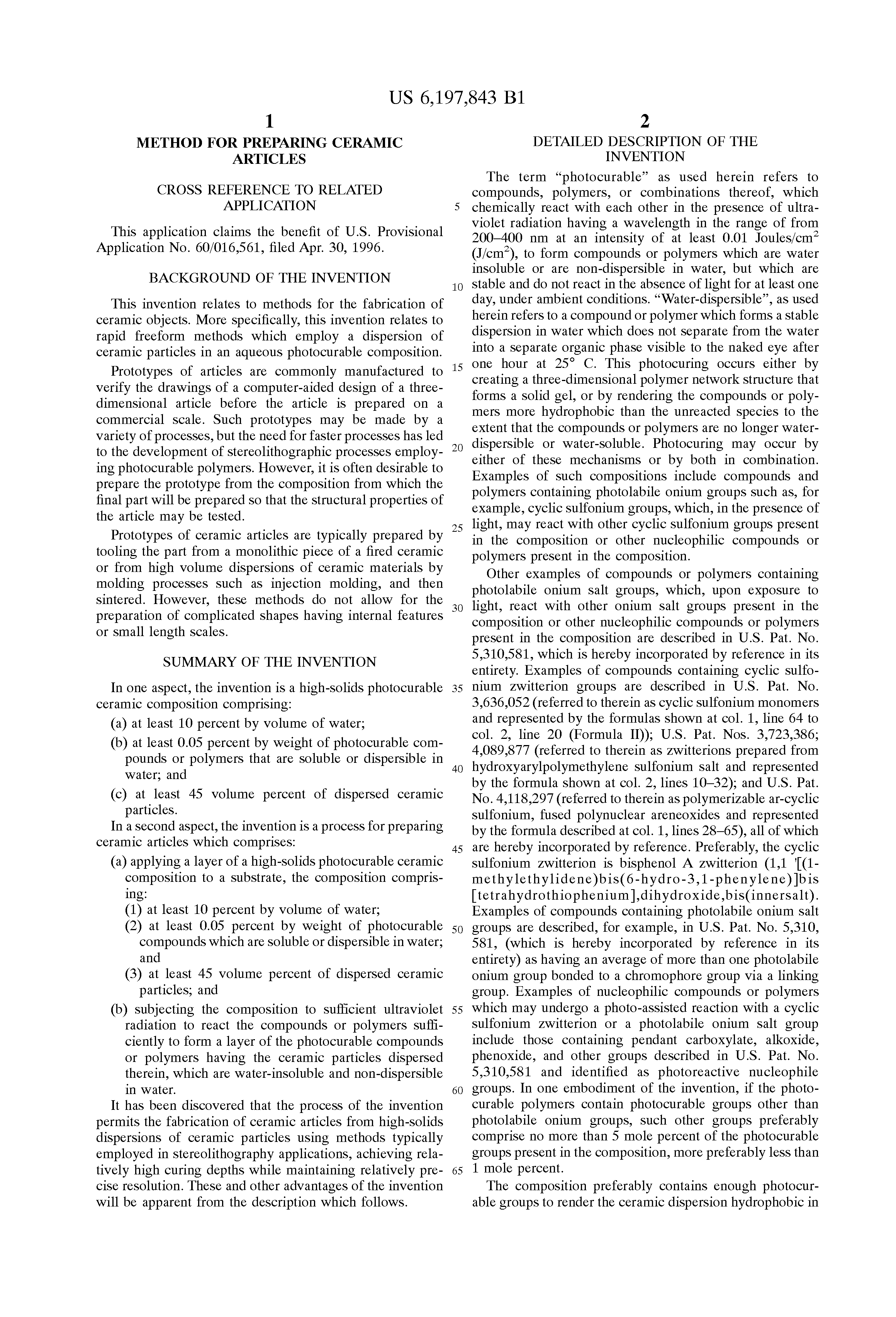 Curing is accomplished by using a 3-D Systems Inc. stereolithography machine with the standard He-Cd 35 mW laser. The laser has a wavelength of 325 nm. The curing dose is controlled by the computer program by varying the writing speed of the laser bean across the surface. The ceramic dispersions are coated onto a microscope slide using a blade coater. A glass-cover slip is placed on top of the coating. The laser beam cures the dispersion through the cover slip. After exposure, the cover slip is washed with water to remove the uncured dispersion and the cured ceramic is air dried. Thickness of the dry-cured section adhering to the cover slip is measured using a profilometer. A sharp pattern with a cured depth of 5 to 6 microns is obtained using a curing energy of 0.014 J/cm2.
