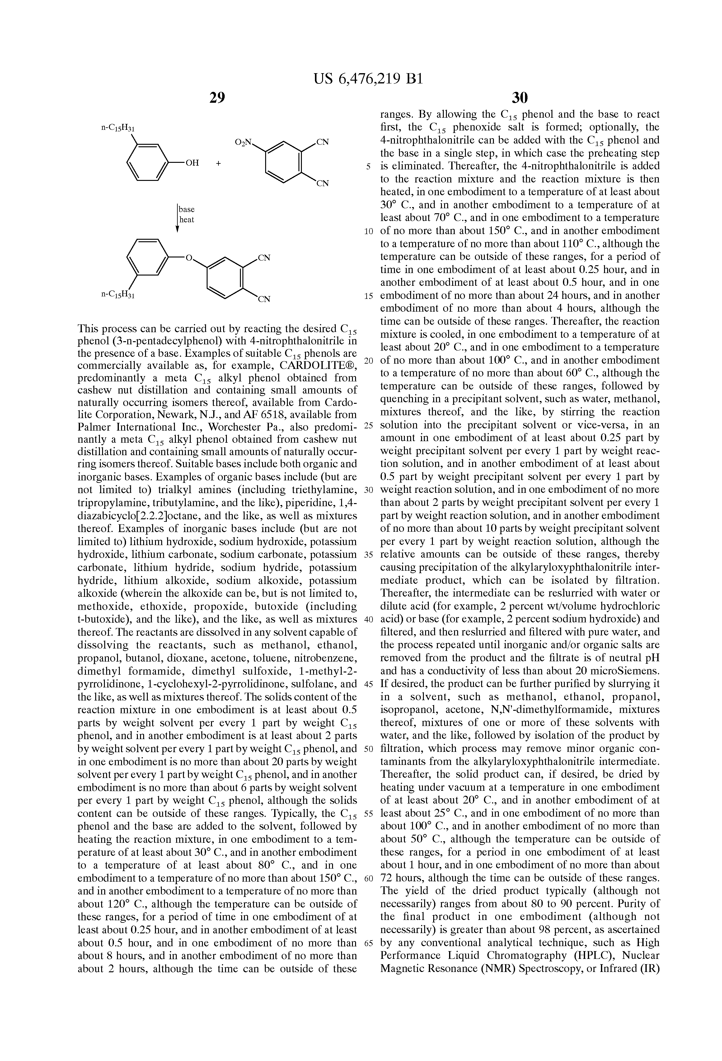 For the synthesis of the alkylarylether adduct of phthalonitrile, the molar ratio of C15 phenol to 4-nitrophthalonitrile in one embodiment is at least about 1:1, and in one embodiment is no more than about 3:1, and in another embodiment is no more than about 1.5:1, although the molar ratio can be outside of these ranges, and the molar ratio of C15 phenol to base in one embodiment is at least about 1:1, and in one embodiment is no more than about 3:1, and in another embodiment is no more than about 1:1 to about 1.5:1, although the molar ratio can be outside of these ranges.