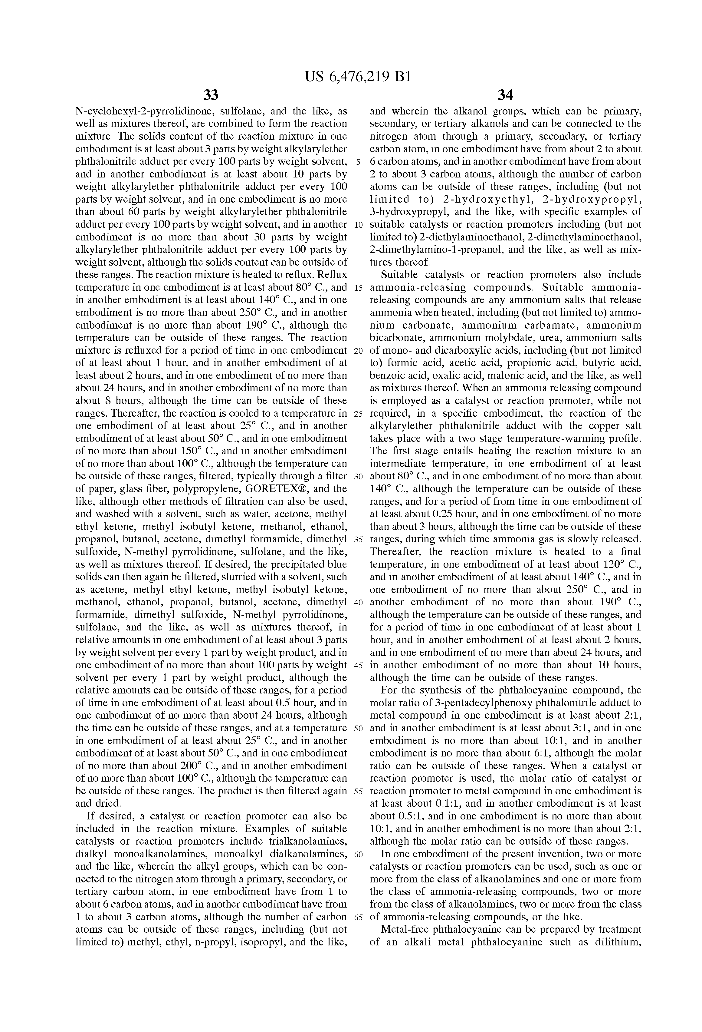 Suitable catalysts or reaction promoters also include ammonia-releasing compounds. Suitable ammonia-releasing compounds are any ammonium salts that release ammonia when heated, including (but not limited to) ammonium carbonate, ammonium carbamate, ammonium bicarbonate, ammonium molybdate, urea, ammonium salts of mono- and dicarboxylic acids, including (but not limited to) formic acid, acetic acid, propionic acid, butyric acid, benzoic acid, oxalic acid, malonic acid, and the like, as well as mixtures thereof. When an ammonia releasing compound is employed as a catalyst or reaction promoter, while not required, in a specific embodiment, the reaction of the alkylarylether phthalonitrile adduct with the copper salt takes place with a two stage temperature-warming profile. The first stage entails heating the reaction mixture to an intermediate temperature, in one embodiment of at least about 80° C., and in one embodiment of no more than about 140° C., although the temperature can be outside of these ranges, and for a period of from time in one embodiment of at least about 0.25 hour, and in one embodiment of no more than about 3 hours, although the time can be outside of these ranges, during which time ammonia gas is slowly released. Thereafter, the reaction mixture is heated to a final temperature, in one embodiment of at least about 120° C., and in another embodiment of at least about 140° C., and in one embodiment of no more than about 250° C., and in another embodiment of no more than about 190° C., although the temperature can be outside of these ranges, and for a period of time in one embodiment of at least about 1 hour, and in another embodiment of at least about 2 hours, and in one embodiment of no more than about 24 hours, and in another embodiment of no more than about 10 hours, although the time can be outside of these ranges.