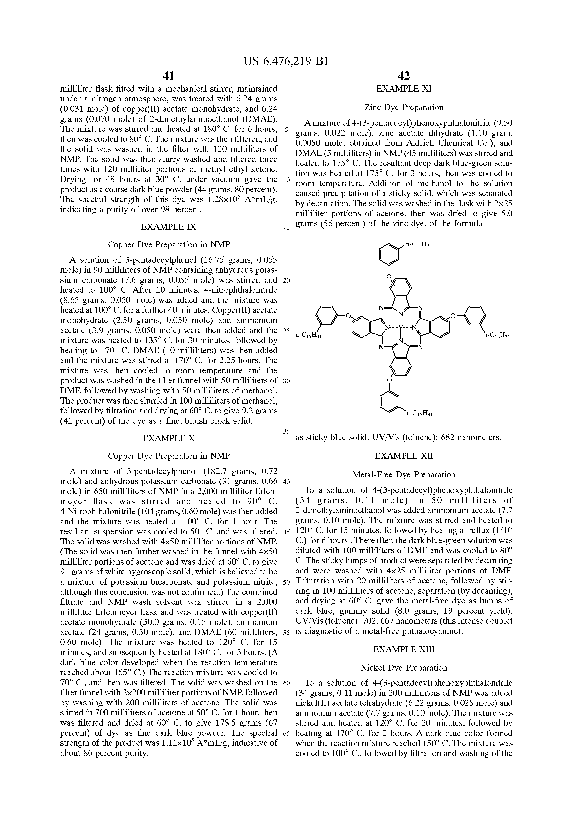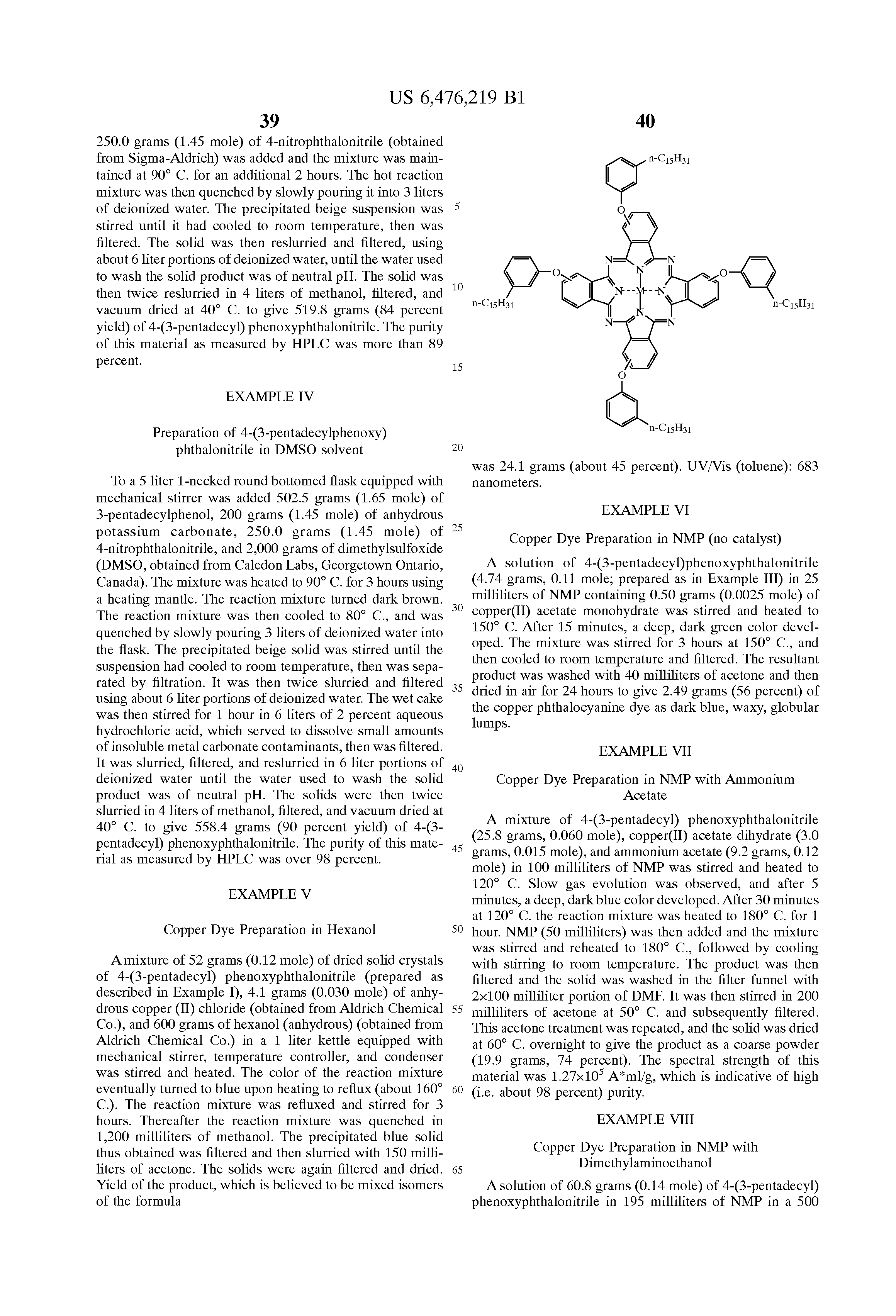 For the synthesis of the phthalocyanine compound, the molar ratio of 3-pentadecylphenoxy phthalonitrile adduct to metal compound in one embodiment is at least about 2:1, and in another embodiment is at least about 3:1, and in one embodiment is no more than about 10:1, and in another embodiment is no more than about 6:1, although the molar ratio can be outside of these ranges. When a catalyst or reaction promoter is used, the molar ratio of catalyst or reaction promoter to metal compound in one embodiment is at least about 0.1:1, and in another embodiment is at least about 0.5:1, and in one embodiment is no more than about 10:1, and in another embodiment is no more than about 2:1, although the molar ratio can be outside of these ranges.