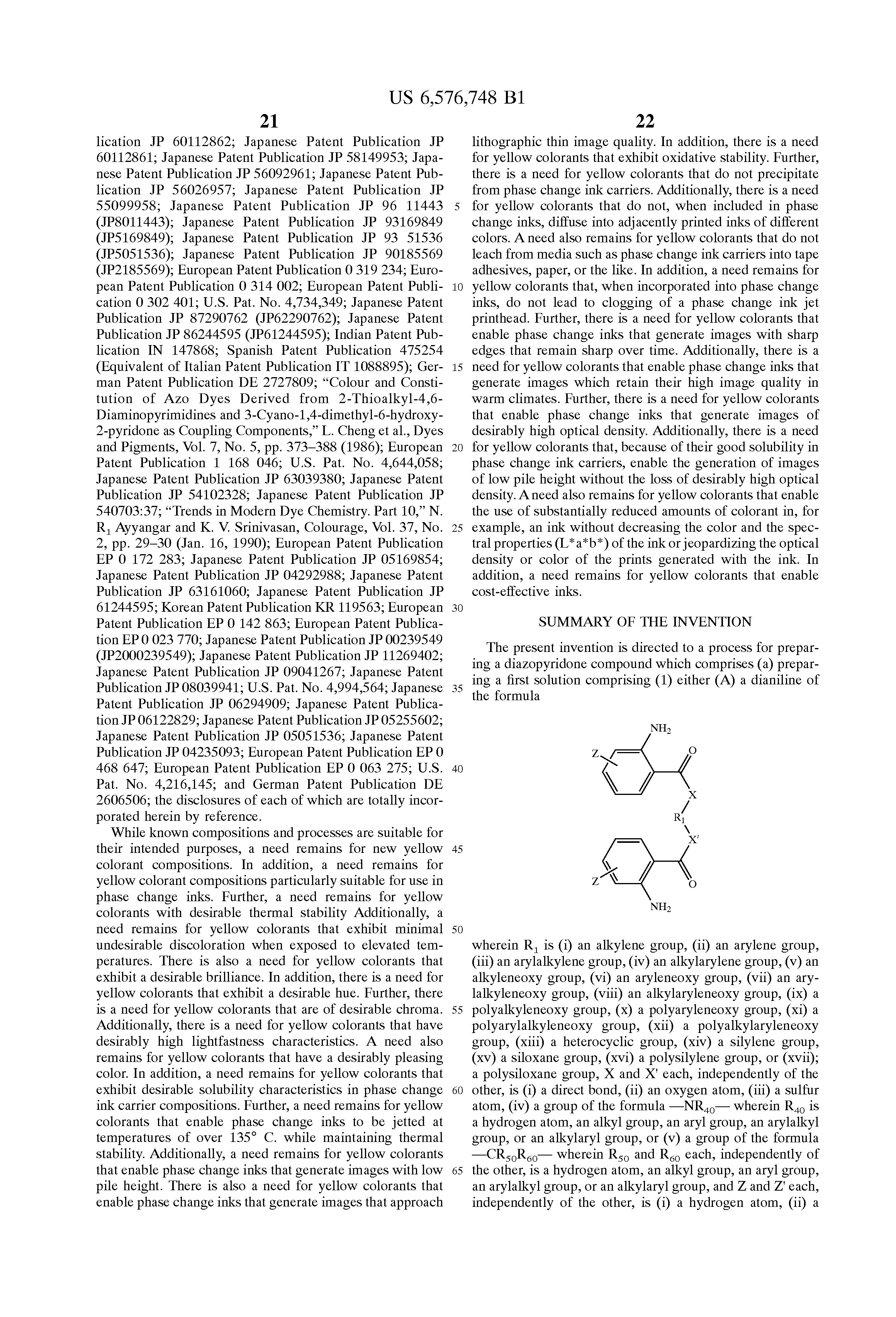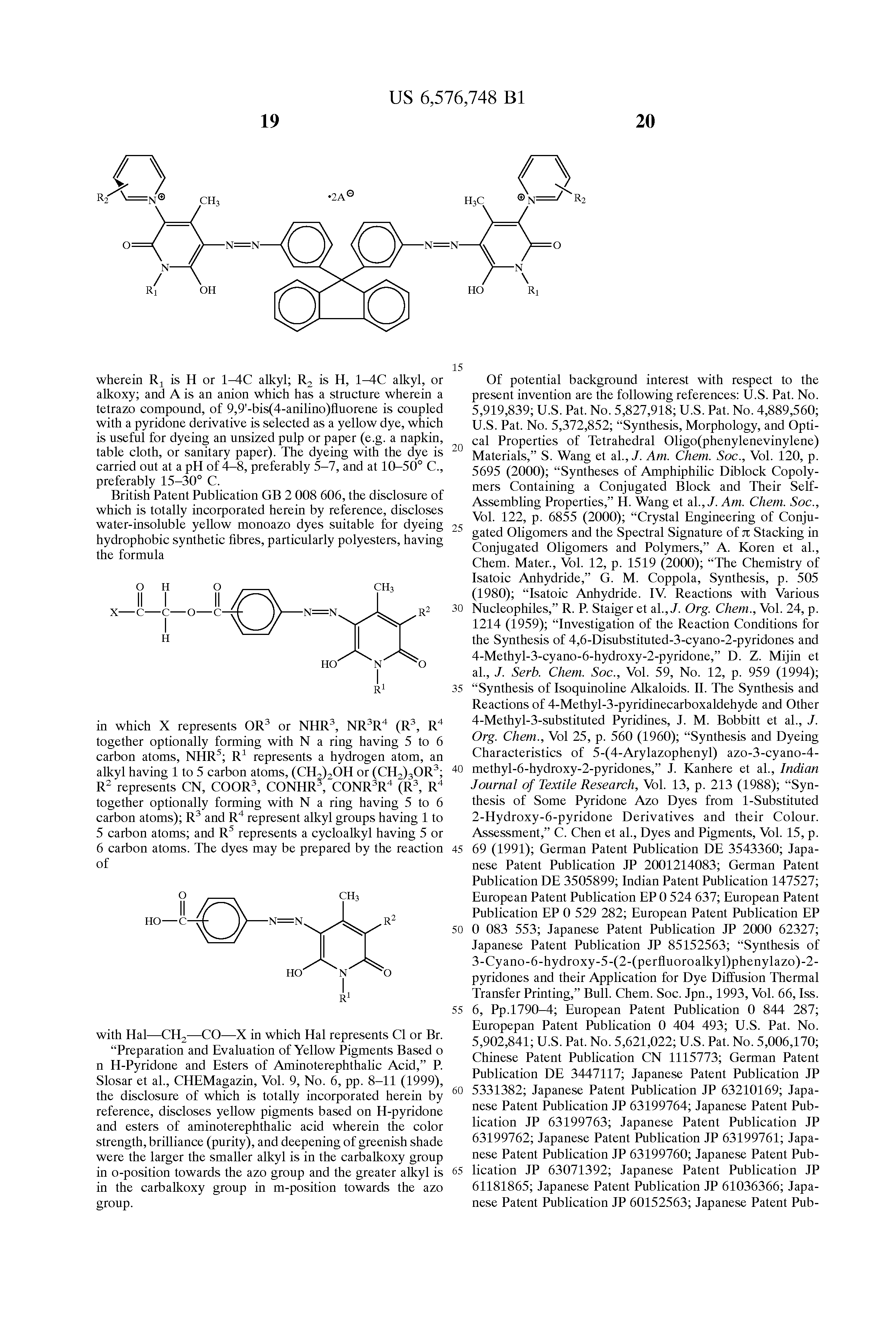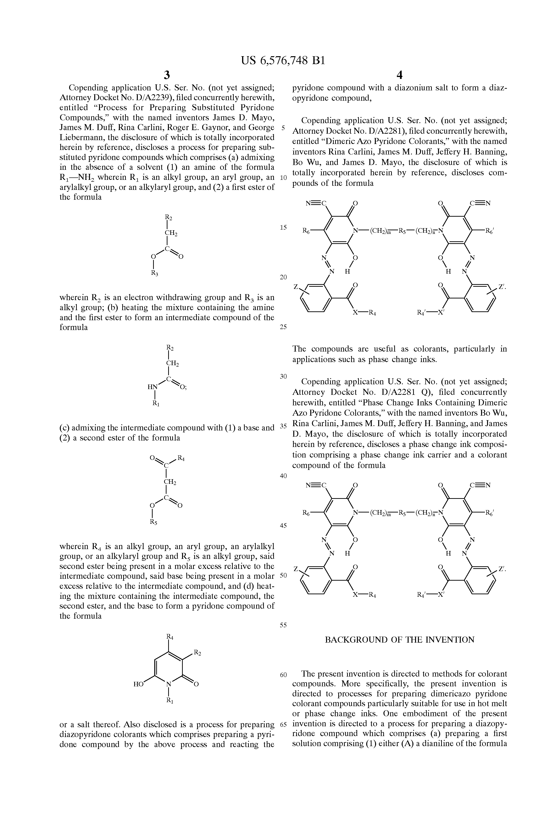 Of potential background interest with respect to the present invention are the following references: U.S. Pat. No. 5,919,839; U.S. Pat. No. 5,827,918; U.S. Pat. No. 4,889,560; U.S. Pat. No. 5,372,852; “Synthesis, Morphology, and Optical Properties of Tetrahedral Oligo(phenylenevinylene) Materials,” S. Wang et al., J. Am. Chem. Soc., Vol. 120, p. 5695 (2000); “Syntheses of Amphiphilic Diblock Copolymers Containing a Conjugated Block and Their Self-Assembling Properties,” H. Wang et al., J. Am. Chem. Soc., Vol. 122, p. 6855 (2000); “Crystal Engineering of Conjugated Oligomers and the Spectral Signature of π Stacking in Conjugated Oligomers and Polymers,” A. Koren et al., Chem. Mater., Vol. 12, p. 1519 (2000); “The Chemistry of Isatoic Anhydride,” G. M. Coppola, Synthesis, p. 505 (1980); “Isatoic Anhydride. IV. Reactions with Various Nucleophiles,” R. P. Staiger et al., J. Org. Chem., Vol. 24, p. 1214 (1959); “Investigation of the Reaction Conditions for the Synthesis of 4,6-Disubstituted-3-cyano-2-pyridones and 4-Methyl-3-cyano-6-hydroxy-2-pyridone,” D. Z. Mijin et al., J. Serb. Chem. Soc., Vol. 59, No. 12, p. 959 (1994); “Synthesis of Isoquinoline Alkaloids. II. The Synthesis and Reactions of 4-Methyl-3-pyridinecarboxaldehyde and Other 4-Methyl-3-substituted Pyridines, J. M. Bobbitt et al., J. Org. Chem., Vol 25, p. 560 (1960); “Synthesis and Dyeing Characteristics of 5-(4-Arylazophenyl) azo-3-cyano-4-methyl-6-hydroxy-2-pyridones,” J. Kanhere et al., Indian Journal of Textile Research, Vol. 13, p. 213 (1988); “Synthesis of Some Pyridone Azo Dyes from 1-Substituted 2-Hydroxy-6-pyridone Derivatives and their Colour. Assessment,” C. Chen et al., Dyes and Pigments, Vol. 15, p. 69 (1991); German Patent Publication DE 3543360; Japanese Patent Publication JP 2001214083; German Patent Publication DE 3505899; Indian Patent Publication 147527; European Patent Publication EP 0 524 637; European Patent Publication EP 0 529 282; European Patent Publication EP 0 083 553; Japanese Patent Publication JP 2000 62327; Japanese Patent Publication JP 85152563; “Synthesis of 3-Cyano-6-hydroxy-5-(2-(perfluoroalkyl)phenylazo)-2-pyridones and their Application for Dye Diffusion Thermal Transfer Printing,” Bull. Chem. Soc. Jpn., 1993, Vol. 66, Iss. 6, Pp.1790-4; European Patent Publication 0 844 287; Europepan Patent Publication 0 404 493; U.S. Pat. No. 5,902,841; U.S. Pat. No. 5,621,022; U.S. Pat. No. 5,006,170; Chinese Patent Publication CN 1115773; German Patent Publication DE 3447117; Japanese Patent Publication JP 5331382; Japanese Patent Publication JP 63210169; Japanese Patent Publication JP 63199764; Japanese Patent Publication JP 63199763; Japanese Patent Publication JP 63199762; Japanese Patent Publication JP 63199761; Japanese Patent Publication JP 63199760; Japanese Patent Publication JP 63071392; Japanese Patent Publication JP 61181865; Japanese Patent Publication JP 61036366; Japanese Patent Publication JP 60152563; Japanese Patent Publication JP 60112862; Japanese Patent Publication JP 60112861; Japanese Patent Publication JP 58149953; Japanese Patent Publication JP 56092961; Japanese Patent Publication JP 56026957; Japanese Patent Publication JP 55099958; Japanese Patent Publication JP 96 11443 (JP8011443); Japanese Patent Publication JP 93169849 (JP5169849); Japanese Patent Publication JP 93 51536 (JP5051536); Japanese Patent Publication JP 90185569 (JP2185569); European Patent Publication 0 319 234; European Patent Publication 0 314 002; European Patent Publication 0 302 401; U.S. Pat. No. 4,734,349; Japanese Patent Publication JP 87290762 (JP62290762); Japanese Patent Publication JP 86244595 (JP61244595); Indian Patent Publication IN 147868; Spanish Patent Publication 475254 (Equivalent of Italian Patent Publication IT 1088895); German Patent Publication DE 2727809; “Colour and Constitution of Azo Dyes Derived from 2-Thioalkyl-4,6-Diaminopyrimidines and 3-Cyano-1,4-dimethyl-6-hydroxy-2-pyridone as Coupling Components,” L. Cheng et al., Dyes and Pigments, Vol. 7, No. 5, pp. 373-388 (1986); European Patent Publication 1 168 046; U.S. Pat. No. 4,644,058; Japanese Patent Publication JP 63039380; Japanese Patent Publication JP 54102328; Japanese Patent Publication JP 540703:37; “Trends in Modern Dye Chemistry. Part 10,” N. R1 Ayyangar and K. V. Srinivasan, Colourage, Vol. 37, No. 2, pp. 29-30 (Jan. 16, 1990); European Patent Publication EP 0 172 283; Japanese Patent Publication JP 05169854; Japanese Patent Publication JP 04292988; Japanese Patent Publication JP 63161060; Japanese Patent Publication JP 61244595; Korean Patent Publication KR 119563; European Patent Publication EP 0 142 863; European Patent Publication EP 0 023 770; Japanese Patent Publication JP 00239549 (JP2000239549); Japanese Patent Publication JP 11269402; Japanese Patent Publication JP 09041267; Japanese Patent Publication JP 08039941; U.S. Pat. No. 4,994,564; Japanese Patent Publication JP 06294909; Japanese Patent Publication JP 06122829; Japanese Patent Publication JP 05255602; Japanese Patent Publication JP 05051536; Japanese Patent Publication JP 04235093; European Patent Publication EP 0 468 647; European Patent Publication EP 0 063 275; U.S. Pat. No. 4,216,145; and German Patent Publication DE 2606506; the disclosures of each of which are totally incorporated herein by reference.