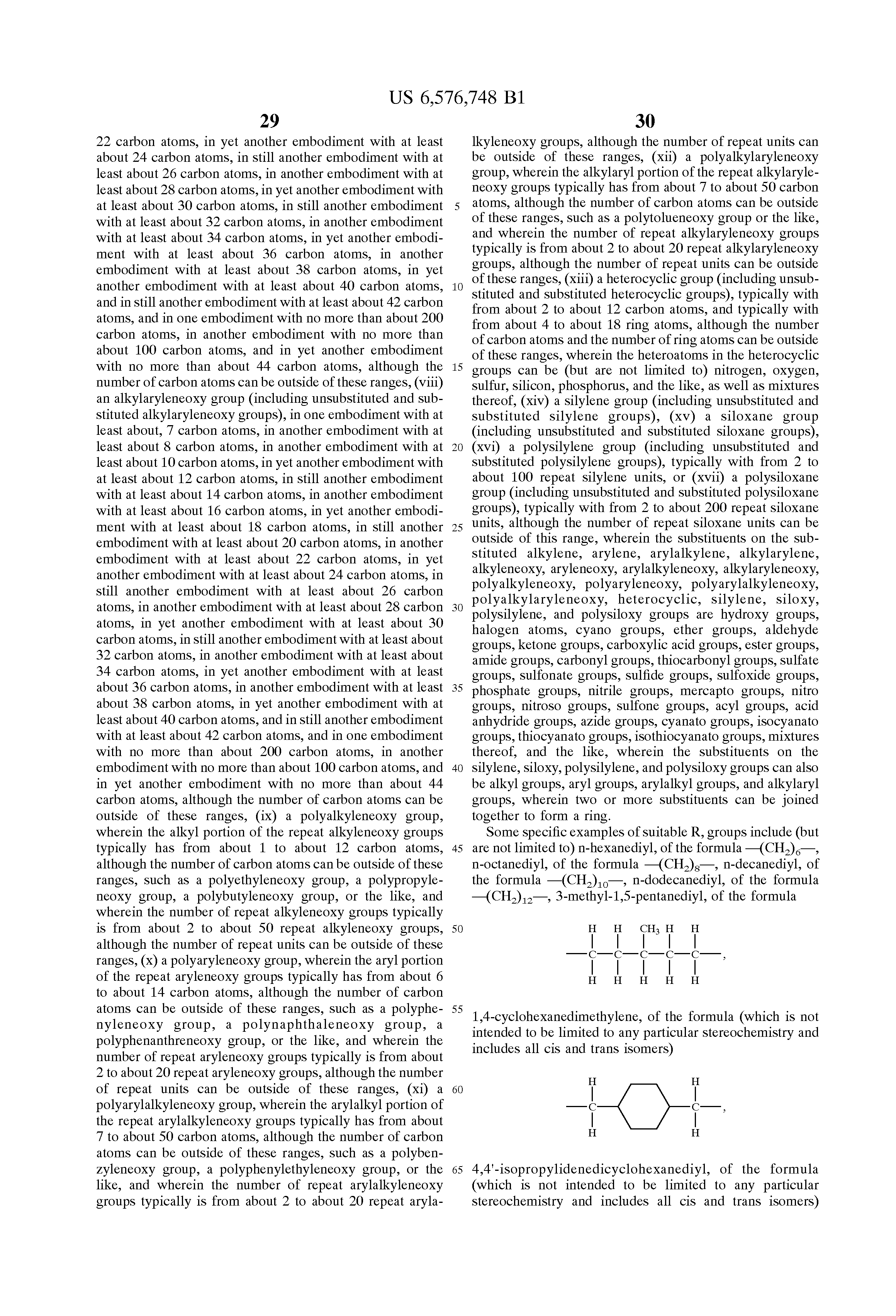 wherein R1 is (i) an alkylene group (including linear, branched, saturated, unsaturated, cyclic, unsubstituted, and substituted alkylene groups, and wherein hetero atoms, such as oxygen, nitrogen, sulfur, silicon, phosphorus, and the like either may or may not be present in the alkylene group), in one embodiment with at least 1carbon atom, in another embodiment with at least about 8 carbon atoms, in yet another embodiment with at least about 10 carbon atoms, in still another embodiment with at least about 12 carbon atoms, in another embodiment with at least about 14 carbon atoms, in yet another embodiment with at least about 16 carbon atoms, in still another embodiment with at least about 18 carbon atoms, in another embodiment with at least about 20 carbon atoms, in yet another embodiment with at least about 22 carbon atoms, in still another embodiment with at least about 24 carbon atoms, in another embodiment with at least about 26 carbon atoms, in yet another embodiment with at least about 28 carbon atoms, in still another embodiment with at least about 30 carbon atoms, in another embodiment with at least about 32 carbon atoms, in yet another embodiment with at least about 34 carbon atoms, and in still another embodiment with at least about 36 carbon atoms, and in one embodiment with no more than about 200 carbon atoms, in another embodiment with no more than about 200 carbon atoms, in yet another embodiment with no more than about 75 carbon atoms, in still another embodiment with no more than about 60 carbon atoms, in another embodiment with no more than about 50 carbon atoms, and in yet another embodiment with no more than about 40 carbon atoms, although the number of carbon atoms can be outside of these ranges, (ii) an arylene group (including unsubstituted and substituted arylene groups), in one embodiment with at least about 6 carbon atoms, in another embodiment with at least about 10 carbon atoms, in yet another embodiment with at least about 13 carbon atoms, in still another embodiment with at least about 14 carbon atoms, in another embodiment with at least about 16 carbon atoms, in yet another embodiment with at least about 17 carbon atoms, in still another embodiment with at least about 18 carbon atoms, in another embodiment with at least about 19 carbon atoms, in yet another embodiment with at least about 20 carbon atoms, in still another embodiment with at least about 21 carbon atoms, in another embodiment with at least about 22 carbon atoms, and in yet another embodiment with at least about 23 carbon atoms, and in one embodiment with no more than about 100 carbon atoms, in another embodiment with no more than about 75 carbon atoms, and in yet another embodiment with no more than about 50 carbon atoms, although the number of carbon atoms can be outside of these ranges, an (iii) arylalkylene group (including unsubstituted and substituted arylalkylene groups), in one embodiment with at least about 7 carbon atoms, in another embodiment with at least about 8 carbon atoms, in another embodiment with at least about 10 carbon atoms, in yet another embodiment with at least about 12 carbon atoms, in still another embodiment with at least about 14 carbon atoms, in another embodiment with at least about 16 carbon atoms, in yet another embodiment with at least about 18 carbon atoms, in still another embodiment with at least about 20 carbon atoms, in another embodiment with at least about 22 carbon atoms, in yet another embodiment with at least about 24 carbon atoms, in still another embodiment with at least about 26 carbon atoms, in another embodiment with at least about 28 carbon atoms, in yet another embodiment with at least about 30 carbon atoms, in still another embodiment with at least about 32 carbon atoms, in another embodiment with at least about 34 carbon atoms, in yet another embodiment with at least about 36 carbon atoms, in another embodiment with at least about 38 carbon atoms, in yet another embodiment with at least about 40 carbon atoms, and in still another embodiment with at least about 42 carbon atoms, and in one embodiment with no more than about 200 carbon atoms, in another embodiment with no more than about 100 carbon atoms, and in yet another embodiment with no more than about 44 carbon atoms, although the number of carbon atoms can be outside of these ranges, (iv) an alkylarylene group (including on substituted and substituted alkylarylene groups), in one embodiment with at least about 7 carbon atoms, in another embodiment with at least about 8 carbon atoms, in another embodiment with at least about 10 carbon atoms, in yet another embodiment with at least about 12 carbon atoms, in still another embodiment with at least about 14 carbon atoms, in another embodiment with at least about 16 carbon atoms, in yet another embodiment with at least about 18 carbon atoms, in still another embodiment with at least about 20 carbon atoms, in another embodiment with at least about 22 carbon atoms, in yet another embodiment with at least about 24 carbon atoms, in still another embodiment with at least about 26 carbon atoms, in another embodiment with at least about 28 carbon atoms, in yet another embodiment with at least about 30 carbon atoms, in still another embodiment with at least about 32 carbon atoms, in another embodiment with at least about 34 carbon atoms, in yet another embodiment with at least about 36 carbon atoms, in another embodiment with at least about 38 carbon atoms, in yet another embodiment with at least about 40 carbon atoms, and in still another embodiment with at least about 42 carbon atoms, and in one embodiment with no more than about 200 carbon atoms, in another embodiment with no more than about 100 carbon atoms, and in yet another embodiment with no more than about 44 carbon atoms, although the number of carbon atoms can be outside of these ranges, (v) an alkyleneoxy group (including linear, branched, saturated, unsaturated, cyclic, unsubstituted, and 
