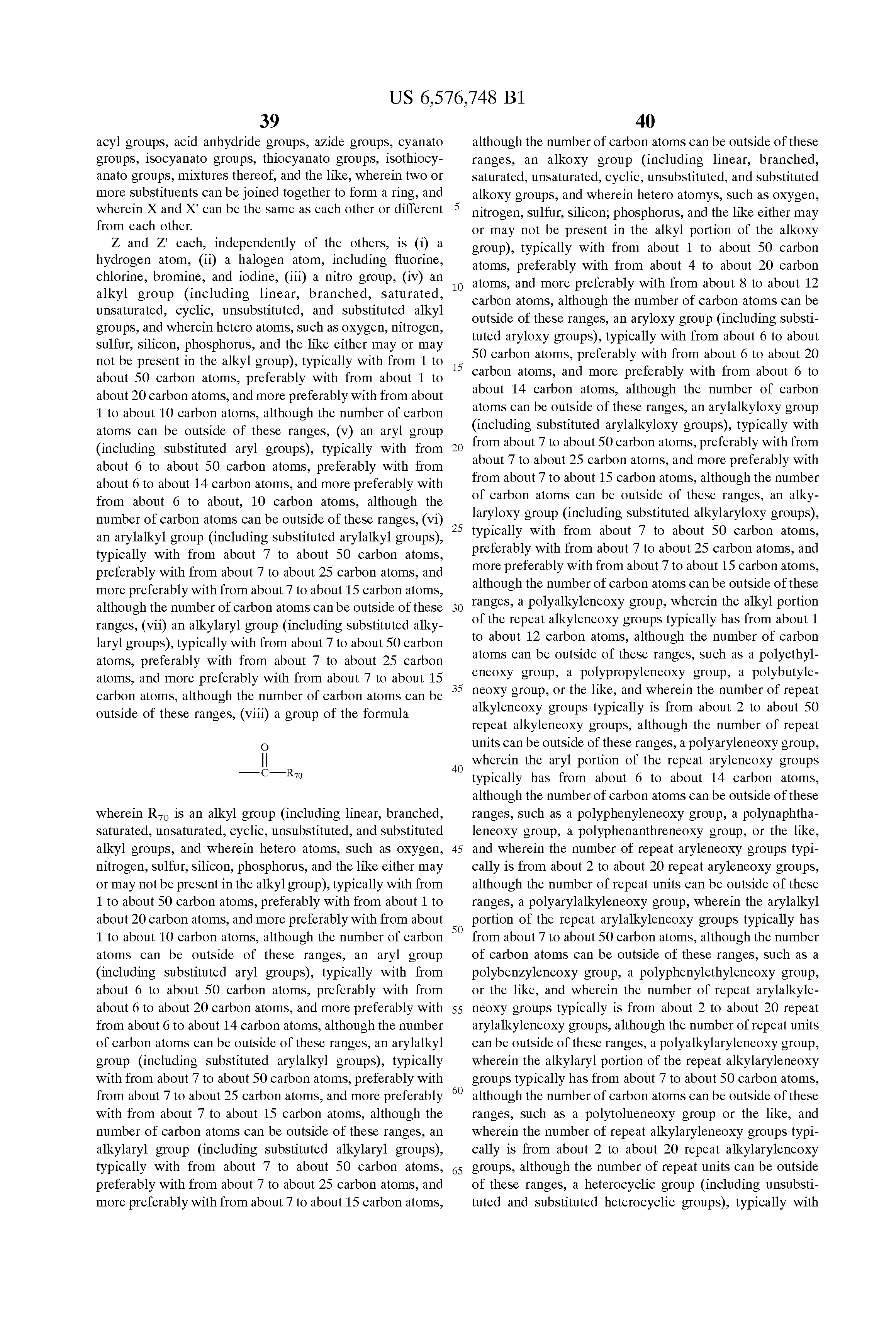 wherein R4 is (i) an alkyl group, (ii) an aryl group, (iii) an arylalkyl group, (iv) an alkylaryl group, (v) an alkoxy group, (vi) an aryloxy group, (vii) an group, (x) a polyaryleneoxy group, (xi) a polyarylalkyleneoxy group, (xii) a polyalkylaryleneoxy group, (xiii) a heterocyclic group, (xiv) a silly group, (xv) a siloxane group, (xvi) a polysilylene group, or (xvii) a polysiloxane group, X is (i) a direct bond, (ii) an oxygen atom, (iii) a sulfur atom, (iv) a group of the formula —NR40— wherein R40 is a hydrogen atom, an alkyl group, an aryl group, an arylalkyl group, or an alkylaryl group, or (v) a group of the formula —CR50R60— wherein R50 and R60 each, independently of the other, is a hydrogen atom, an alkyl group, an aryl group, an arylalkyl group, or an alkylaryl group, and Z is (i) a hydrogen atom, (ii) a halogen atom, (iii) a nitro group, (iv) an alkyl group, (v) an aryl group, (vi) an arylalkyl group, (vii) an alkylaryl group, (viii) a group of the formula
