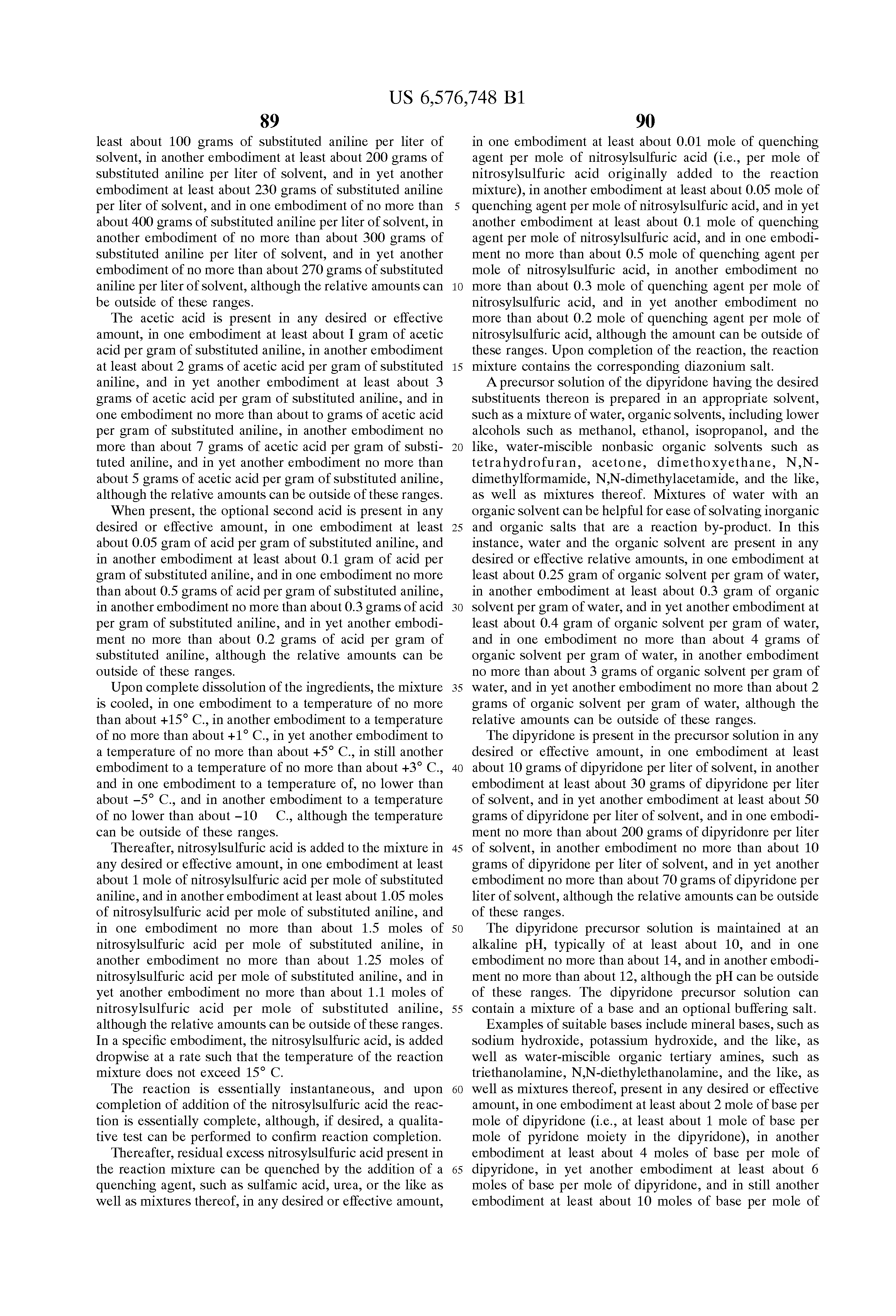 wherein R5 is (i) an alkylene group, (ii) an arylene group, (iii) an arylalkylene group, (iv) an alkylarylene group, (v) an alkyleneoxy group, (vi) an aryleneoxy group, (vii) an arylalkyleneoxy group, (viii) an alkylaryleneoxy group, (ix) a polyalkyleneoxy group, (x) a polyaryleneoxy group, (xi) a polyarylalkyleneoxy group, (xii) a polyalkylaryleneoxy group, (xiii) a heterocyclic group, (xiv) a silylene group, (xv) a siloxane group, (xvi) a polysilylene group, or (xvii) a polysiloxane group, R6 and R6′ each, independently of the other, is (i) an alkyl group, (ii) an aryl group, (iii) an arylalkyl group, or (iv) an alkylaryl group, n is an integer representing the number of repeat —CH2— units, and m is an integer representing the number of repeat —CH2— units, (3) a base present in an amount of at least about 3 molar equivalents of base per mole of pyridone moiety, and (4) an optional buffer salt, and (d) combining either (A) the second solution containing the dianiline and the first solution containing the pyridone, or (B) the second solution containing the aniline and the first solution containing the dipyridone to form a third solution and effect a coupling reaction to form a diazopyridone compound either (A) of the formula