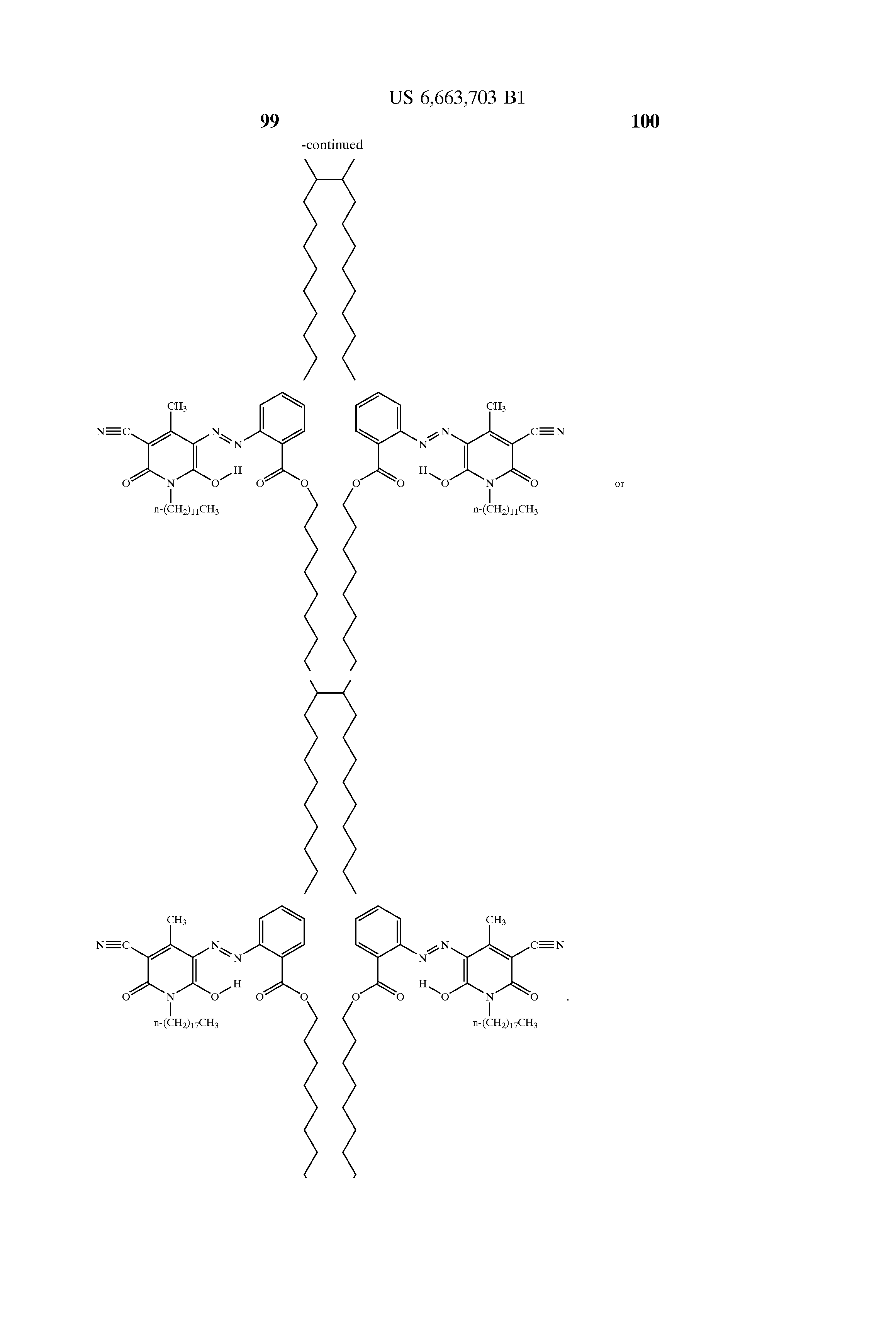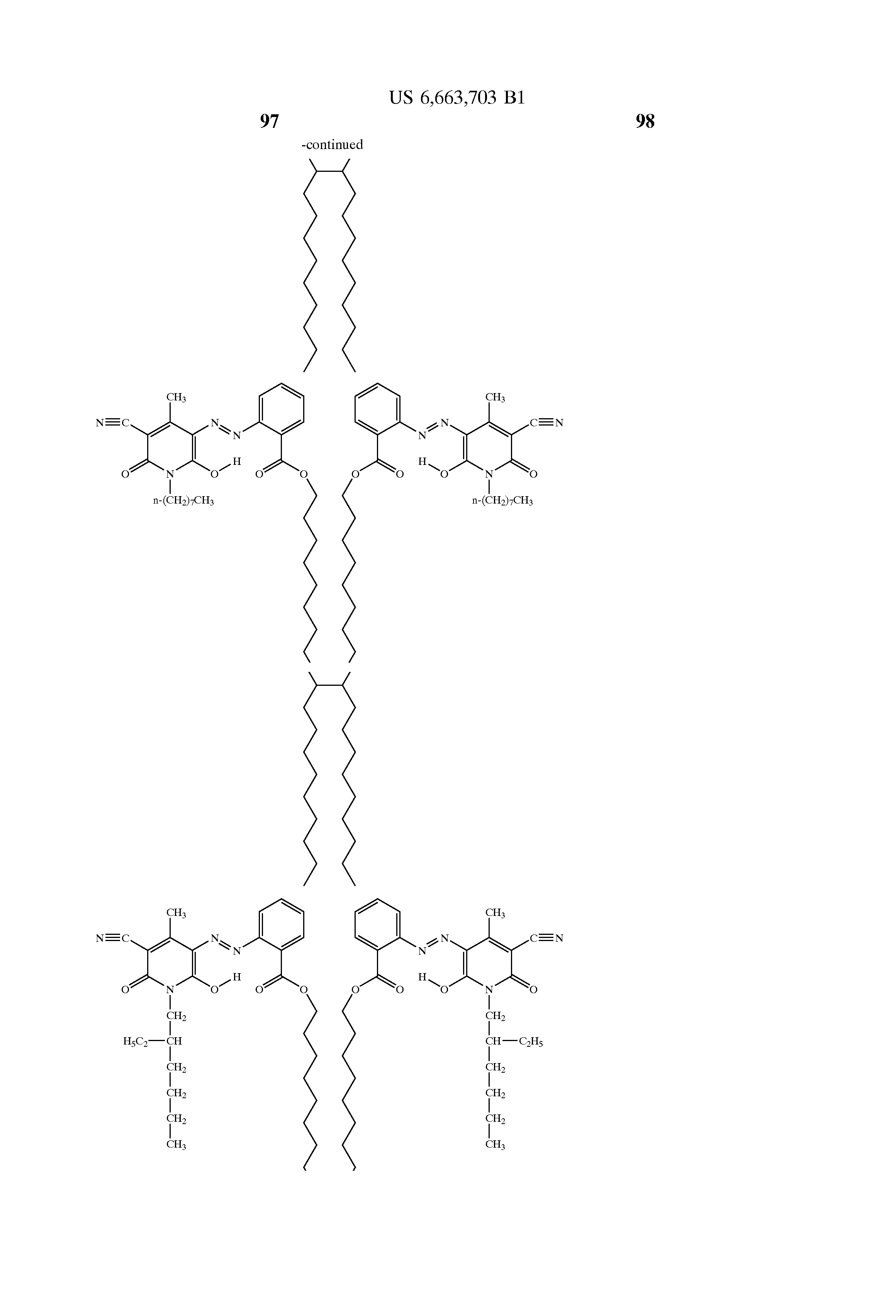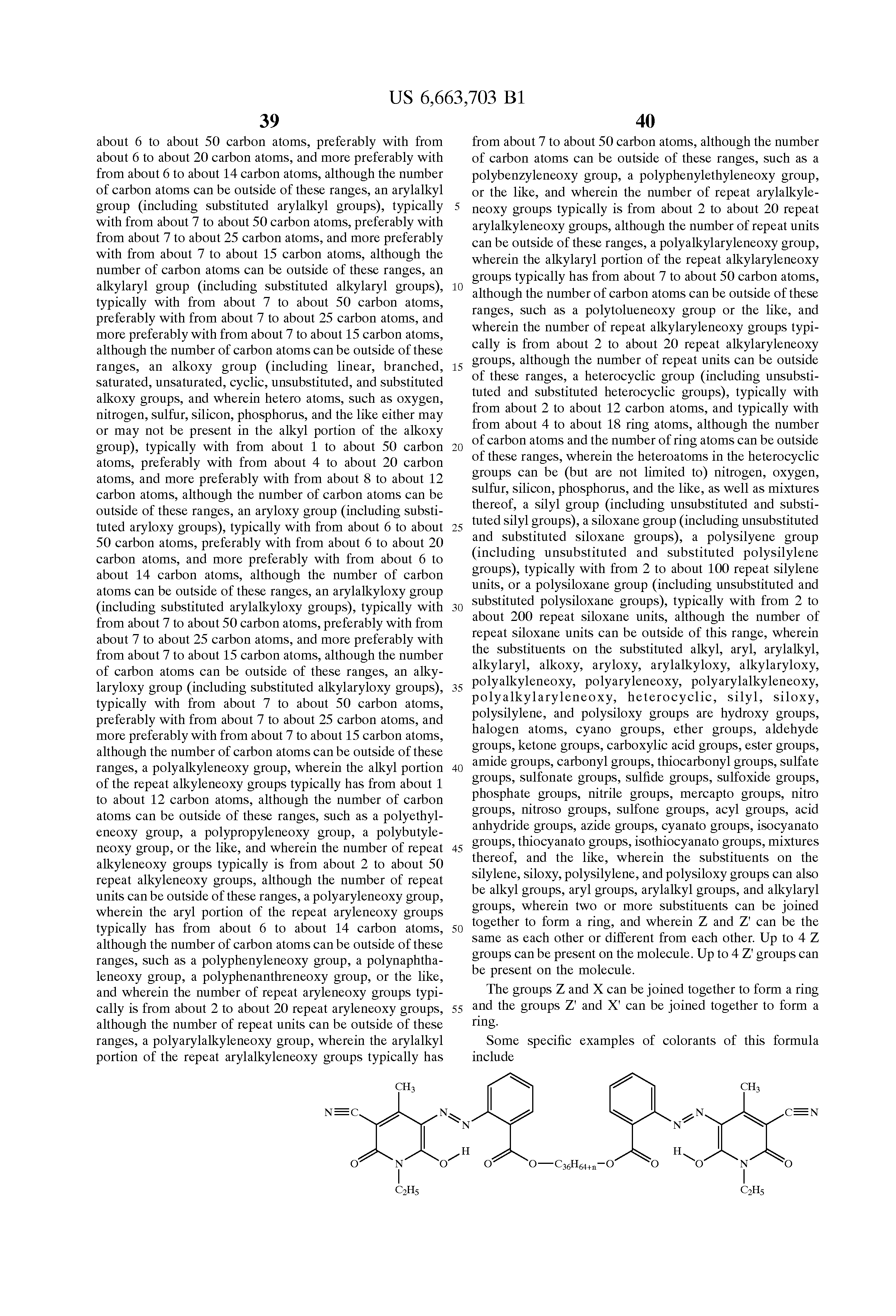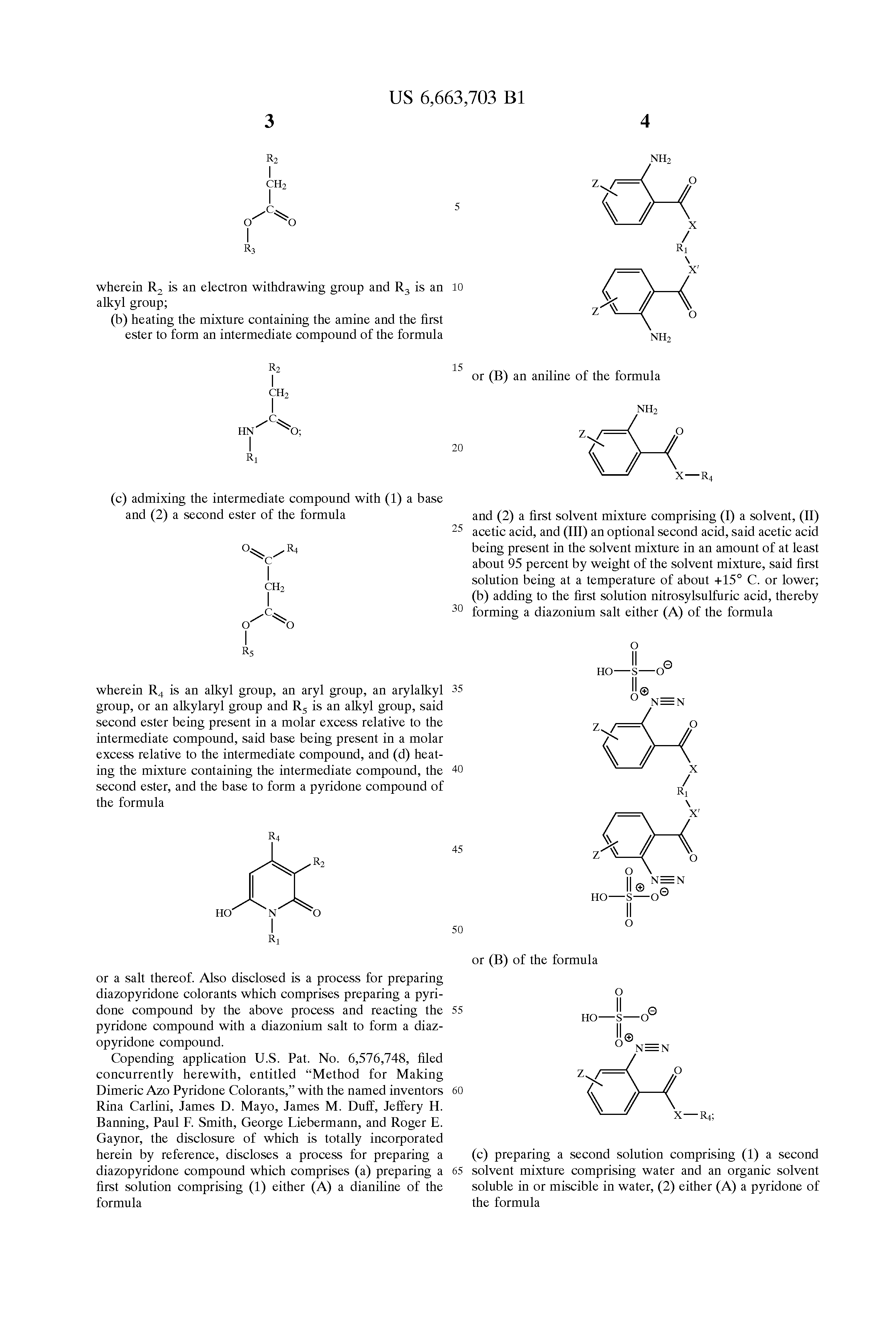 Of potential background interest with respect to the present invention are the following references: U.S. Pat. No. 5,919,839; U.S. Pat. No. 5,827,918; U.S. Pat. No. 4,889,560; U.S. Pat. No. 5,372,852; “Synthesis, Morphology, and Optical Properties of Tetrahedral Oligo(phenylenevinylene) Materials,” S. Wang et al., J. Am. Chem. Soc., Vol. 120, p. 5695 (2000); “Syntheses of Amphiphilic Diblock Copolymers Containing a Conjugated Block and Their Self-Assembling Properties,” H. Wang et al., J. Am. Chem. Soc., Vol. 122, p. 6855 (2000); “Crystal Engineering of Conjugated Oligomers and the Spectral Signature of π Stacking in Conjugated Oligomers and Polymers,” A. Koren et al., Chem. Mater., Vol. 12, p. 1519 (2000); “The Chemistry of Isatoic Anhydride,” G. M. Coppola, Synthesis, p. 505 (1980); “Isatoic Anhydride. IV. Reactions with Various Nucleophiles,” R. P. Staiger et al., J. Org. Chem., Vol. 24, p. 1214 (1959); “Investigation of the Reaction Conditions for the Synthesis of 4,6-Disubstituted-3-cyano-2-pyridones and 4-Methyl-3-cyano-6-hydroxy-2-pyridone,” D. Z. Mijin et al., J. Serb. Chem. Soc., Vol. 59, No. 12, p. 959 (1994); “Synthesis of Isoquinoline Alkaloids. II. The Synthesis and Reactions of 4-Methyl-3-pyridinecarboxaldehyde and Other 4-Methyl-3-substituted Pyridines, J. M. Bobbitt et al., J. Org. Chem., Vol 25, p. 560 (1960); “Synthesis and Dyeing Characteristics of 5-(4-Arylazophenyl) azo-3-cyano-4-methyl-6-hydroxy-2-pyridones,” J. Kanhere et al., Indian Journal of Textile Research, Vol. 13, p. 213 (1988); “Synthesis of Some Pyridone Azo Dyes from 1-Substituted 2-Hydroxy-6-pyridone Derivatives and their Colour Assessment,” C. Chen et al., Dyes and Pigments, Vol. 15, p. 69 (1991); German Patent Publication DE 3543360; Japanese Patent Publication JP 2001214083; German Patent Publication DE 3505899; Indian Patent Publication 147527; European Patent Publication EP 0 524 637; European Patent Publication EP 0 529 282; European Patent Publication EP 0 083 553; Japanese Patent Publication JP 2000 62327; Japanese Patent Publication JP 85152563; “Synthesis of 3-Cyano-6-hydroxy-5-(2-(perfluoroalkyl)phenylazo)-2-pyridones and their Application for Dye Diffusion Thermal Transfer Printing,” Bull. Chem. Soc. Jpn., 1993, Vol. 66, Iss. 6, Pp.1790-4; European Patent Publication 0 844 287; European Patent Publication 0 404 493; U.S. Pat. No. 5,902,841; U.S. Pat. No. 5,621,022; U.S. Pat. No. 5,006,170; Chinese Patent Publication CN 1115773; German Patent Publication DE 3447117; Japanese Patent Publication JP 5331382; Japanese Patent Publication JP 63210169; Japanese Patent Publication JP 63199764; Japanese Patent Publication JP 63199763; Japanese Patent Publication JP 63199762; Japanese Patent Publication JP 63199761; Japanese Patent Publication JP 63199760; Japanese Patent Publication JP 63071392; Japanese Patent Publication JP 61181865; Japanese Patent Publication JP 61036366; Japanese Patent Publication JP 60152563; Japanese Patent Publication JP 60112862; Japanese Patent Publication JP 60112861; Japanese Patent Publication JP 58149953; Japanese Patent Publication JP 56092961; Japanese Patent Publication JP 56026957; Japanese Patent Publication JP 55099958; Japanese Patent Publication JP 96 11443 (JP8011443); Japanese Patent Publication JP 93169849 (JP5169849); Japanese Patent Publication JP 93 51536 (JP5051536); Japanese Patent Publication JP 90185569 (JP2185569); European Patent Publication 0 319 234; European Patent Publication 0 314 002; European Patent Publication 0 302 401; U.S. Pat. No. 4,734,349; Japanese Patent Publication JP 87290762 (JP62290762); Japanese Patent Publication JP 86244595 (JP61244595); Indian Patent Publication IN 147868; Spanish Patent Publication 475254 (Equivalent of Italian Patent Publication IT 1088895); German Patent Publication DE 2727809; “Colour and Constitution of Azo Dyes Derived from 2-Thioalkyl-4,6-Diaminopyrimidines and 3-Cyano-1,4-dimethyl-6-hydroxy-2-pyridone as Coupling Components,” L. Cheng et al., Dyes and Pigments, Vol. 7, No. 5, pp. 373-388 (1986); European Patent Publication 1 168046; U.S. Pat. No. 4,644,058; Japanese Patent Publication JP 63039380; Japanese Patent Publication JP 54102328; Japanese Patent Publication JP 54070337; “Trends in Modern Dye Chemistry. Part 10,” N. R. Ayyangar and K. V. Srinivasan, Colourage, Vol. 37, No. 2, pp. 29-30 (Jan. 16, 1990); European Patent Publication EP 0 172 283; Japanese Patent Publication JP 05169854; Japanese Patent Publication JP 04292988; Japanese Patent Publication JP 63161060; Japanese Patent Publication JP 61244595; Korean Patent Publication KR 119563; European Patent Publication EP 0 142 863; European Patent Publication EP 0 023 770; Japanese Patent Publication JP 00239549 (JP2000239549); Japanese Patent Publication JP 11269402; Japanese Patent Publication JP 09041267; Japanese Patent Publication JP 08039941; U.S. Pat. No. 4,994,564; Japanese Patent Publication JP 06294909; Japanese Patent Publication JP 06122829; Japanese Patent Publication JP 05255602; Japanese Patent Publication JP 05051536; Japanese Patent Publication JP 04235093; European Patent Publication EP 0 468 647; European Patent Publication EP 0063275; U.S. Pat. No. 4,216,145; and German Patent Publication DE 2606506; the disclosures of each of which are totally incorporated herein by reference.