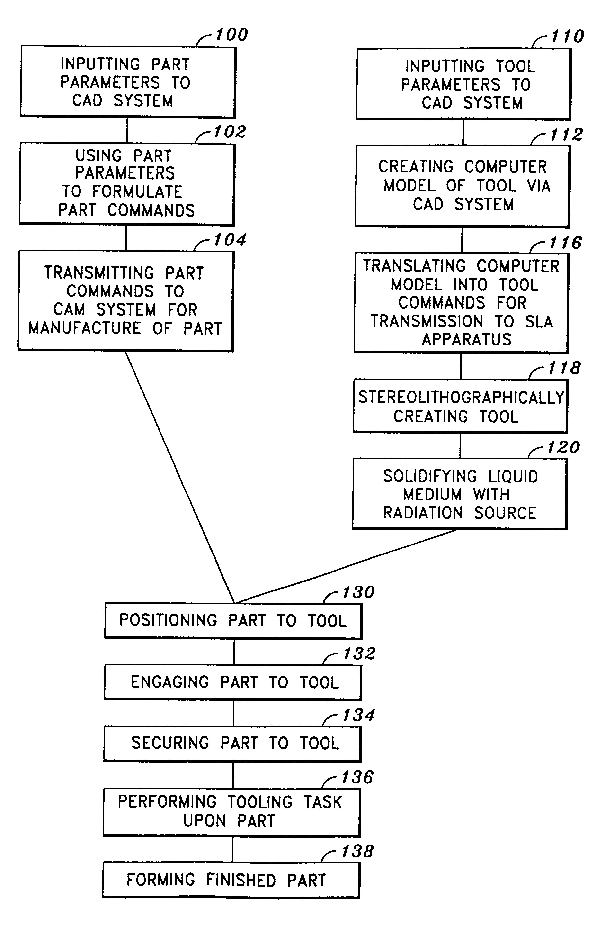 More specifically, the irradiation source may be positionable over the liquid medium. The irradiation source may be operative to respond to the transmitted tool commands from the computer aided design system by being movable in relation to the liquid medium. Such medium may selectively transform from a substantial liquid state to a substantial physical state, or solid state, upon exposure to the irradiation source. Simply put, the irradiation source may selectively and strategically solidify 120 the liquid medium to form the tool 30. Thereafter, the tool 30 maybe dried to conclude its solidifying 120 process. However, the tool 30 may omit the drying thereof. It will be contemplated by those of ordinary skill in the art that the irradiation source may output different types of lights, but an ultraviolet light may be preferable. However, as stated before, any omitted specific details in regards to the stereolithography technology may be found in the above incorporated U.S. Pat. No. '330, and only general concepts are disclosed herein in reference to the present invention.