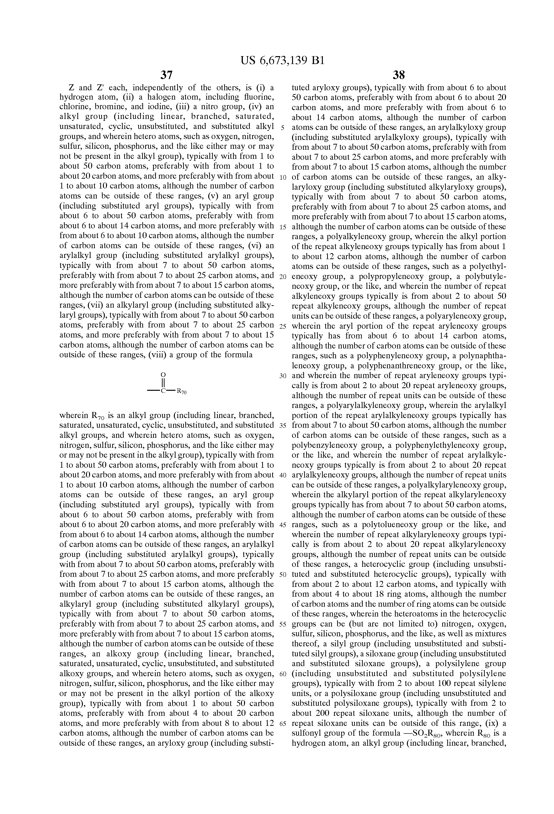 Some specific examples of suitable R4 and R4′ groups include (but are not limited to) methyl, of the formula —CH3, ethyl, of the formula —C2H5, n-octyl, of the formula —(CH2)7CH3, stearyl, of the formula —(CH2)17CH3, menthyl, of the formula