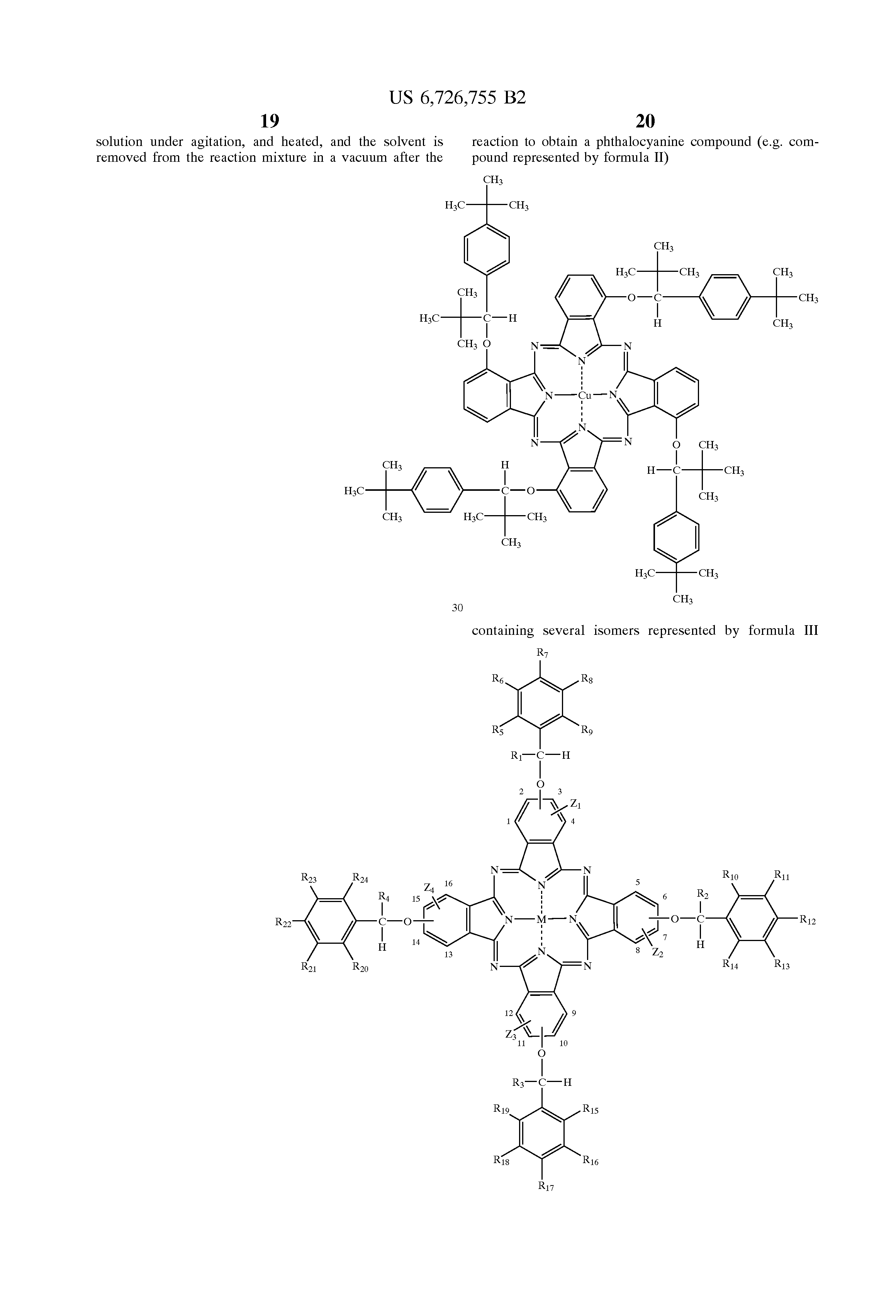 Some reported examples of R-groups conferring solubility are tert-butyl (“Phthalocyanines and related compounds IX. Synthesis and electronic absorption spectra of tetra-t-butylphthalocyanines,” S. A. Mikhalenko, S. V. Barknova, O. L. Lebedev, and E. A. Luk'yanets, Zhur. Obschei Khimii, 41 (1971), 2375, the disclosure of which is totally incorporated herein by reference), neopentyloxy (“Binuclear phthalocyanines covalently linked through two-atom and four-atom bridges,” S. M. Marcuccio, P. I. Svirskaya, S. Greenberg, A. B. P. Lever, C. C. Leznoff, and K. B. Tomer, Can. J. Chem., 63 (1985), 3957, the disclosure of which is totally incorporated herein by reference), 4-cumylphenoxy (“Molecular association and monolayer formation of soluble phthalocyanine compounds,” A. W. Snow and N. L. Jarvis, J. Am. Chem. Soc., 106 (1984), 4706, the disclosure of which is totally incorporated herein by reference), oligo(ethyleneoxy) (“Lyotropic and thermotropic mesophase formation of novel tetra[oligo(ethyleneoxy)]-substituted phthalocyanines,” N. B. McKeown and J. Painter, J. Materials Chem., 4 (1994), 1153, the disclosure of which is totally incorporated herein by reference), long-chain alkysulfamoyl, RNHSO2— (R. E Wyant, German Offenlegungsschrift, 2,224,063 (1973), the disclosure of which is totally incorporated herein by reference), long-chain alkyl carboxylate, ROCO— (“Highly ordered monolayer assemblies of phthalocyanine derivatives,” K. Ogawa, S. Kinoshita, H. Yonehara, H. Nakahara, and F. Fukuda, J. Am. Chem. Soc. Chem. Comm., (1989), 477, the disclosure of which is totally incorporated herein by reference), and long-chain alkyl carboxamide, RNHCO— (“Self-assembling features of soluble nickel phthalocyanines,” M. Fujiki, H. Tobei, and T. Kurihara, J. Phys. Chem. 9 (1988), 1281, the disclosure of which is totally incorporated herein by reference).
