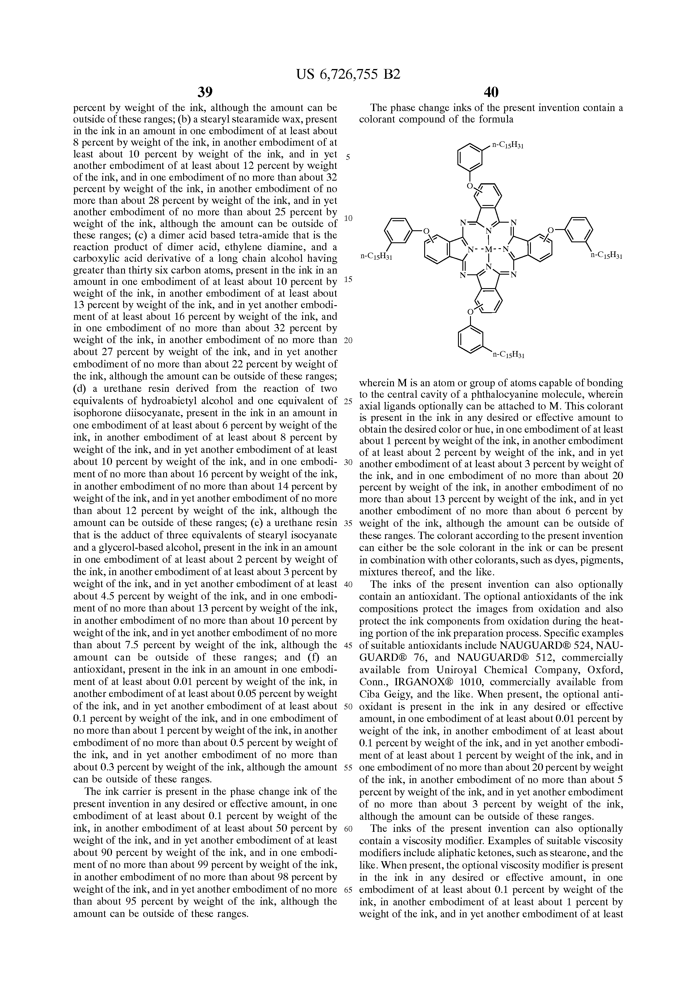 wherein M is an atom or group of atoms capable of bonding to the central cavity of a phthalocyanine molecule, wherein axial ligands optionally can be attached to M. About seventy atoms or groups are known to bond in the central cavity of a phthalocyanine molecule, as disclosed in, for example, Phthalocyonine Materials, N. B. McKeown, Cambridge University Press (1998), Chapter 1, Table 1.1, the disclosure of which is totally incorporated herein by reference, including, but not limited to, two hydrogen, lithium, sodium, or potassium atoms; a divalent metal atom, such as beryllium, magnesium, calcium, strontium, barium, chromium, manganese, iron, cobalt, nickel, copper, zinc, tin, lead, cadmium, and the like; a divalent halometal or -metalloid group, such as chloroiron(III), chlorotitanium(III), chlorochromium(III), chloroaluminum, chlorogallium, chloroindium, chlorophosphorus(III), dichlorotitanium(IV), dichlorosilicon, dichlorogermanium, dichlorotin, and the like, as well as the corresponding fluorides, bromides, and iodides; a divalent hydroxy metal group, such as hydroxyaluminum, hydroxygallium, dihydroxysilicon, dihydroxygermanium, dihydroxytin, and the like; a divalent oxo-metal group, such as oxo-molybdenum(IV), oxo-vanadium(IV), oxo-titanium(IV), and the like; a divalent metal- or metalloidal-oxyhydrocarbon group, such as alkoxyaluminum, alkoxygallium, dialkoxysilicon, diaryloxygermanium, and the like, wherein the oxyhydrocarbon group is an oxyalkyl group, an oxyaryl group, an oxyalkylaryl group, an oxyarylalkyl group, an oxyheterocyclic group, or mixtures thereof, and typically (although not necessarily) contains from one to about twenty carbon atoms; and the like, as well as mixtures thereof.