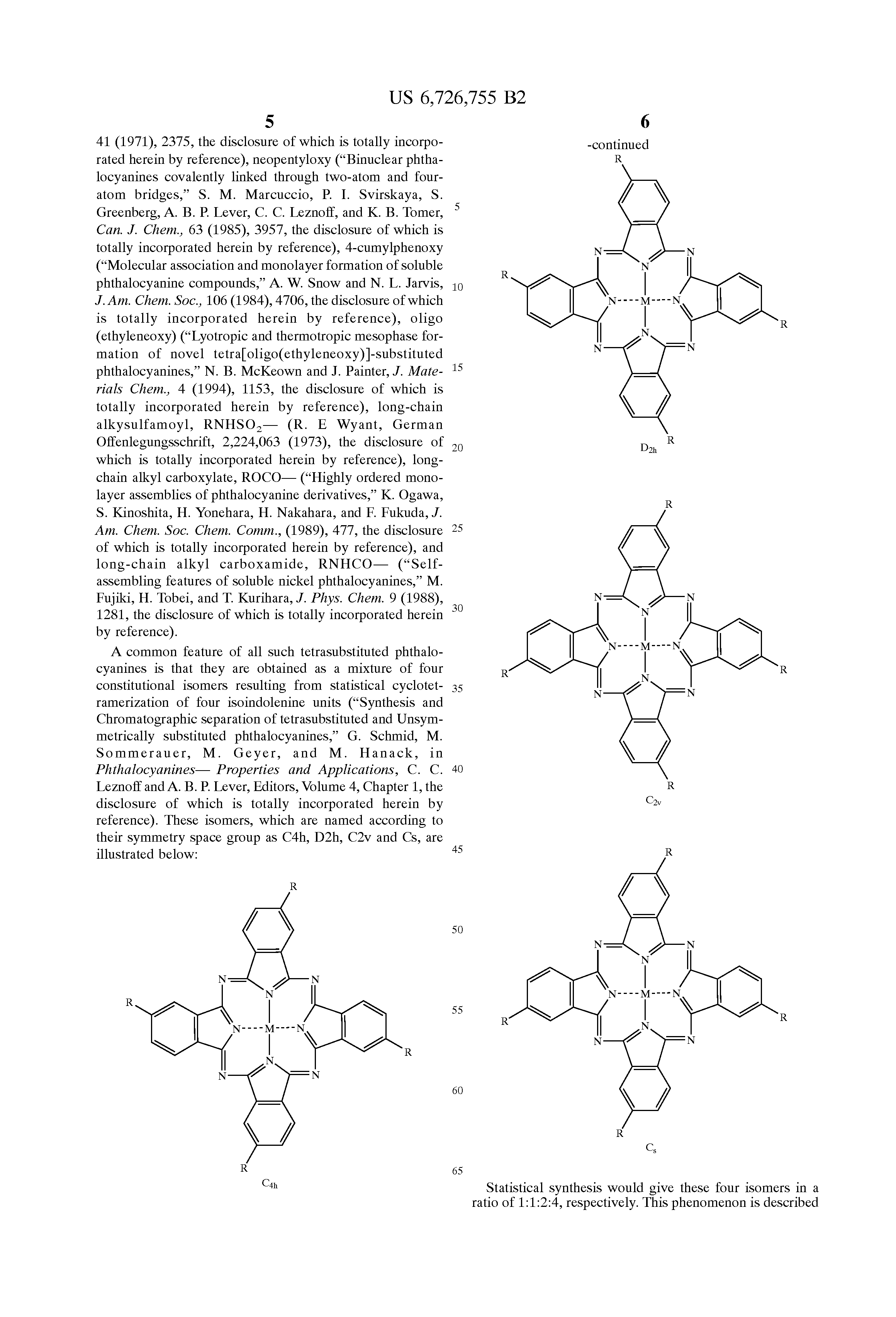 Statistical synthesis would give these four isomers in a ratio of 1:1:2:4, respectively. This phenomenon is described in more detail in “Separation of 2(3),9(10),16(17),23(24)-Tetrasubstituted Phthalocyanines with Newly Developed HPLC Phases,” M. Sommerauer, C. Rager, and M. Hanack, J. Am. Chem. Soc., Vol. 118, No. 42, p. 10085 (1996), the disclosure of which is totally incorporated herein by reference, which discloses the synthesis of 2(3),9(10),16(17),23(24)-tetrasubstituted phthalocyanines from 1,2-dicyano-4-alkoxybenzenes or the corresponding isoindolines. In each case, four isomers with D2h, C4h, C2v, and Cs symmetry were obtained in the statistically expected yield. The separation of the C4h and the D2h isomers was achieved successfully for the first time from the other two isomers with newly developed HPLC phases based on π-π interactions. In one case, a particular phthalocyanine could be separated into four different isomers and characterized by UV/VIS and 1H-NMR spectroscopy.