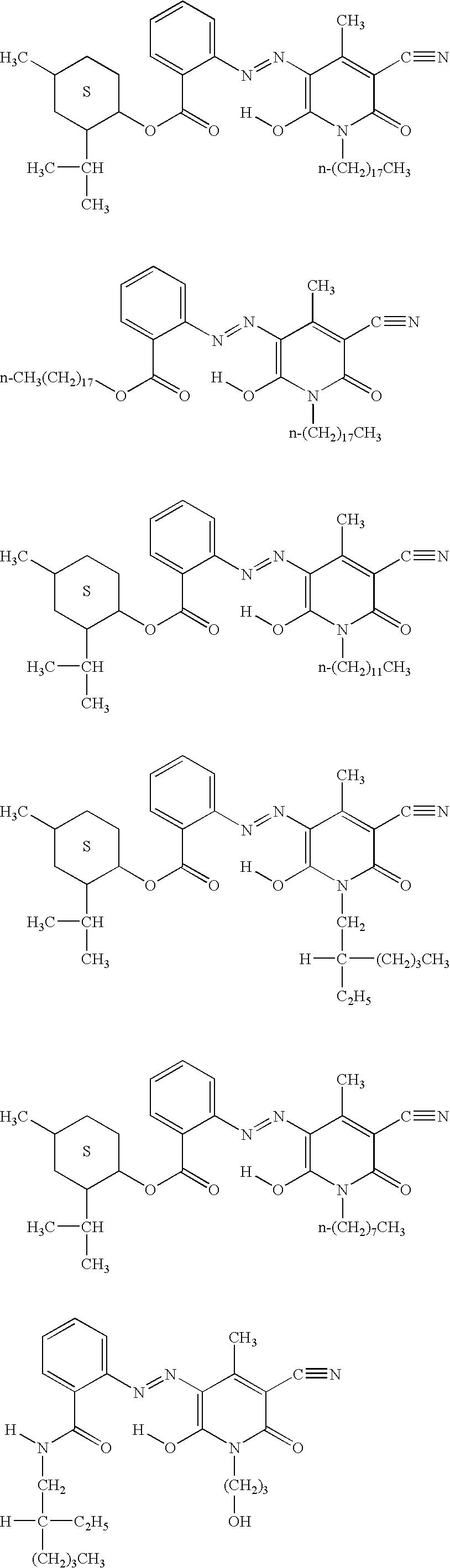 wherein Ring A is unsubstituted or carries, in the 2- or 4-position with respect to the azo link, at least one group selected from —CX3, X1, CN, NO2, —OCO.Y, —CO.Y, —CO.H, —OSO2.Y, and —SO2.Y, provided that A is substituted when Z is CH3 and R is C2-4-alkyl; X and X1 are each independently halogen; Y is selected from R1, —OR1, SR1, and —NR1R2; R1 is selected from C1-12-alkyl, C1-12-alkyl interrupted by one or two groups selected from —O—, —CO—, O.CO—, and —CO.O—, C3-7-cycloalkyl, mono- or bi-cyclic aryl, and C1-3-alkylene attached to an adjacent carbon atom on Ring A; R2 is selected from H, C1-12-alkyl, C3-7-cycloalkyl, and mono- or bi-cyclic aryl; Z is C1-12-alkyl or phenyl; and R is selected from C2-12-alkyl unbranched in the alpha-position, C2-12-alkyl unbranched in alpha-position and interrupted by one or two groups selected from —O—, —CO—, O.CO—, and —CO.O—, phenyl, C1-4-alkylphenyl, biphenyl, and biphenyl interrupted by a group selected from —O—, —CO—, O.CO—, and —CO.O—, each of which is free from hydrogen atoms capable of intermolecular hydrogen bonding.