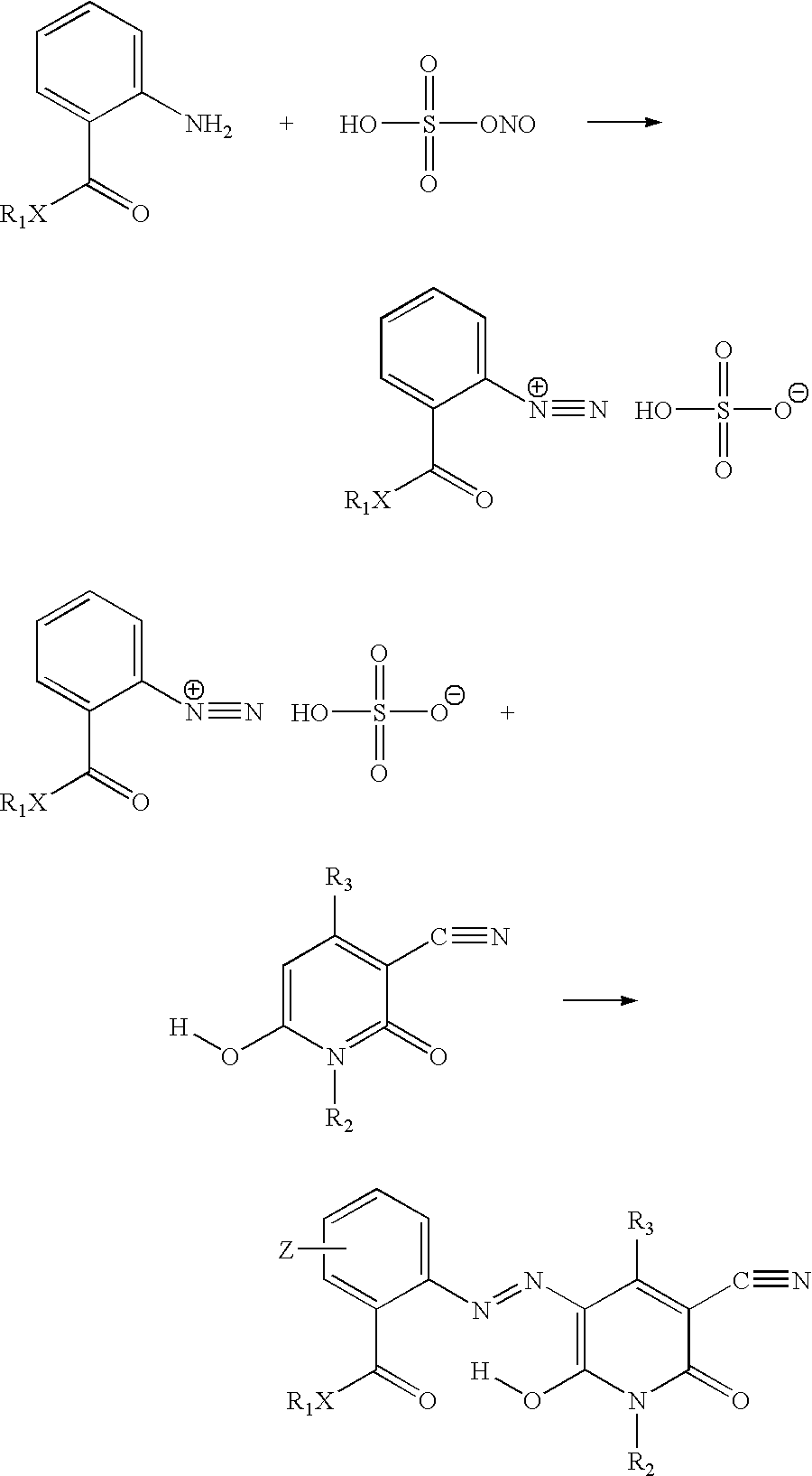 Of potential background interest with respect to the present invention are the following references: U.S. Pat. Nos. 5,919,839; 5,827,918; 4,889,560; 5,372,852; “Synthesis, Morphology, and Optical Properties of Tetrahedral Oligo(phenylenevinylene) Materials,” S. Wang et al., J. Am. Chem. Soc., Vol. 120, p. 5695 (2000); “Syntheses of Amphiphilic Diblock Copolymers Containing a Conjugated Block and Their Self-Assembling Properties,” H. Wang et al., J. Am. Chem. Soc., Vol. 122, p. 6855 (2000); “Crystal Engineering of Conjugated Oligomers and the Spectral Signature of π Stacking in Conjugated Oligomers and Polymers,” A. Koren et al., Chem. Mater., Vol. 12, p. 1519 (2000); “The Chemistry of Isatoic Anhydride,” G. M. Coppola, Synthesis, p. 505 (1980); “Isatoic Anhydride. IV. Reactions with Various Nucleophiles,” R. P. Staiger et al., J. Org. Chem., Vol. 24, p. 1214 (1959); “Investigation of the Reaction Conditions for the Synthesis of 4,6-Disubstituted-3-cyano-2-pyridones and 4-Methyl-3-cyano-6-hydroxy-2-pyridone,” D. Z. Mijin et al., J. Serb. Chem. Soc., Vol. 59, No. 12, p. 959 (1994); “Synthesis of Isoquinoline Alkaloids. II. The Synthesis and Reactions of 4-Methyl-3-pyridinecarboxaldehyde and Other 4-Methyl-3-substituted Pyridines, J. M. Bobbitt et al., J. Org. Chem., Vol 25, p. 560 (1960); “Synthesis and Dyeing Characteristics of 5-(4-Arylazophenyl) azo-3-cyano-4-methyl-6-hydroxy-2-pyridones,” J. Kanhere et al., Indian Journal of Textile Research, Vol. 13, p. 213 (1988); “Synthesis of Some Pyridone Azo Dyes from 1-Substituted 2-Hydroxy-6-pyridone Derivatives and their Colour Assessment,” C. Chen et al., Dyes and Pigments, Vol. 15, p. 69 (1991); German Patent Publication DE 3543360; Japanese Patent Publication JP 2001214083; German Patent Publication DE 3505899; Indian Patent Publication 147527; European Patent Publication EP 0 524 637; European Patent Publication EP 0 529 282; European Patent Publication EP 0 083 553; Japanese Patent Publication JP 2000 62327; Japanese Patent Publication JP 85152563; “Synthesis of 3-Cyano-6-hydroxy-5-(2-(perfluoroalkyl)phenylazo)-2-pyridones and their Application for Dye Diffusion Thermal Transfer Printing,” Bull. Chem. Soc. Jpn., 1993, Vol. 66, Iss. 6, Pp.1790-4; European Patent Publication 0 844 287; European Patent Publication 0 404 493; U.S. Pat. No. 5,902,841; U.S. Pat. No. 5,621,022; U.S. Pat. No. 5,006,170; Chinese Patent Publication CN 1115773; German Patent Publication DE 3447117; Japanese Patent Publication JP 5331382; Japanese Patent Publication JP 63210169; Japanese Patent Publication JP 63199764; Japanese Patent Publication JP 63199763; Japanese Patent Publication JP 63199762; Japanese Patent Publication JP 63199761; Japanese Patent Publication JP 63199760; Japanese Patent Publication JP 63071392; Japanese Patent Publication JP 61181865; Japanese Patent Publication JP 61036366; Japanese Patent Publication JP 60152563; Japanese Patent Publication JP 60112862; Japanese Patent Publication JP 60112861; Japanese Patent Publication JP 58149953; Japanese Patent Publication JP 56092961; Japanese Patent Publication JP 56026957; Japanese Patent Publication JP 55099958; Japanese Patent Publication JP 96 11443 (JP8011443); Japanese Patent Publication JP 93169849 (JP5169849); Japanese Patent Publication JP 93 51536 (JP5051536); Japanese Patent Publication JP 90185569 (JP2185569); European Patent Publication 0 319 234; European Patent Publication 0 314 002; European Patent Publication 0 302 401; U.S. Pat. No. 4,734,349; Japanese Patent Publication JP 87290762 (JP62290762); Japanese Patent Publication JP 86244595 (JP61244595); Indian Patent Publication IN 147868; Spanish Patent Publication 475254 (Equivalent of Italian Patent Publication IT 1088895); German Patent Publication DE 2727809; “Colour and Constitution of Azo Dyes Derived from 2-Thioalkyl-4,6-Diaminopyrimidines and 3-Cyano-1,4-dimethyl-6-hydroxy-2-pyridone as Coupling Components,” L. Cheng et al., Dyes and Pigments, Vol. 7, No. 5, pp. 373-388 (1986); European Patent Publication 1 168 046; U.S. Pat. No. 4,644,058; Japanese Patent Publication JP 63039380; Japanese Patent Publication JP 54102328; Japanese Patent Publication JP 54070337; “Trends in Modern Dye Chemistry. Part 10,” N. R. Ayyangar and K. V. Srinivasan, Colourage, Vol. 37, No. 2, pp. 29-30 (Jan. 16, 1990); European Patent Publication EP 0 172 283; Japanese Patent Publication JP 05169854; Japanese Patent Publication JP 04292988; Japanese Patent Publication JP 63161060; Japanese Patent Publication JP 61244595; Korean Patent Publication KR 119563; European Patent Publication EP 0 142 863; European Patent Publication EP 0 023 770; Japanese Patent Publication JP 00239549 (JP2000239549); Japanese Patent Publication JP 11269402; Japanese Patent Publication JP 09041267; Japanese Patent Publication JP 08039941; U.S. Pat. No. 4,994,564; Japanese Patent Publication JP 06294909; Japanese Patent Publication JP 06122829; Japanese Patent Publication JP 05255602; Japanese Patent Publication JP 05051536; Japanese Patent Publication JP 04235093; European Patent Publication EP 0 468 647; European Patent Publication EP 0 063 275; U.S. Pat. No. 4,216,145; and German Patent Publication DE 2606506; the disclosures of each of which are totally incorporated herein by reference.