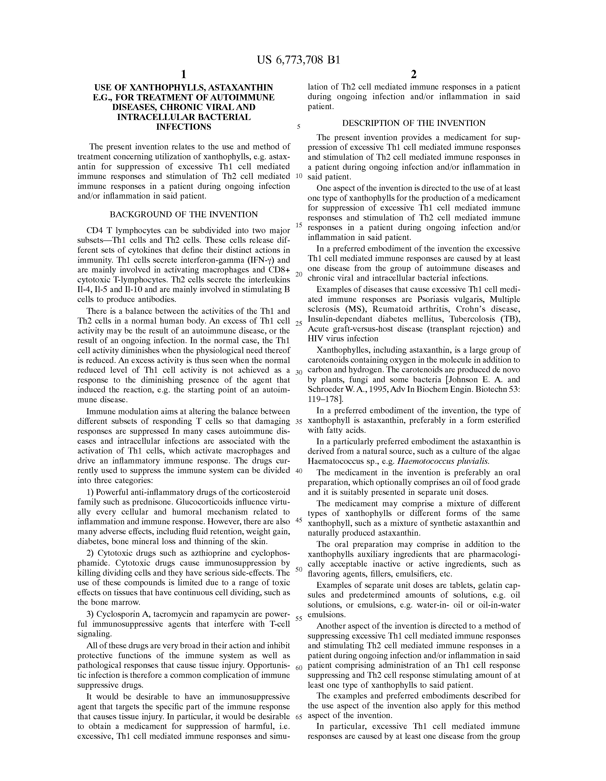 The daily doses of the active ingredient of the invention will normally be in the range of 0.01 to 10 mg per kg body weight for a human calculated on the amount of astaxanthin, but the actual dose will depend on the immune response of the individual human patient, the reason for suppression of the excessive Th1 cell mediated immune response, such as the type of disease causing the enhanced pathological Th1 cell response, and the recommendations of the manufacturer.