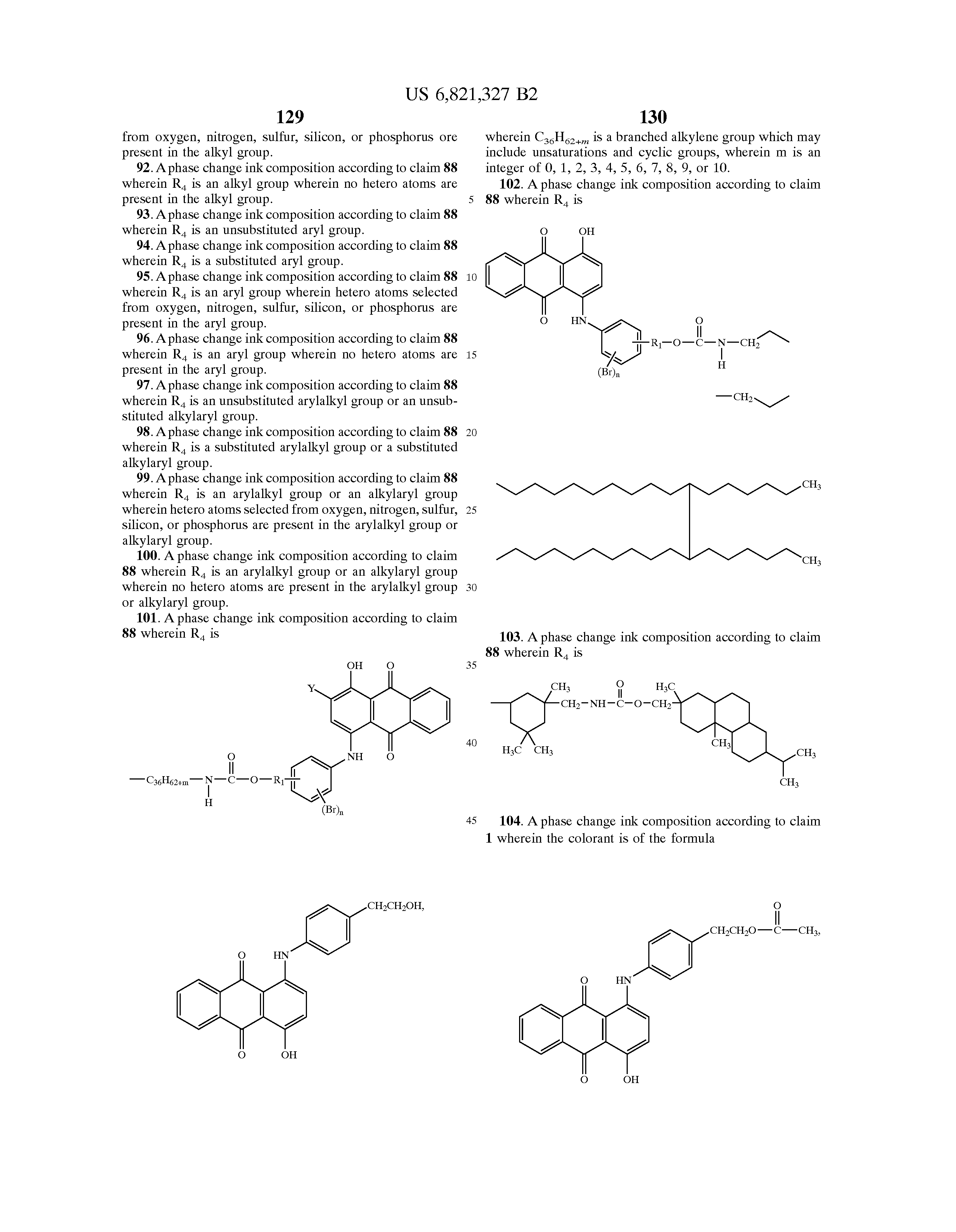 wherein R4 is an alkyl group (including linear, branched, saturated, unsaturated, cyclic, unsubstituted, and substituted alkyl groups, and wherein hetero atoms, such as oxygen, nitrogen, sulfur, silicon, phosphorus, and the like either may or may not be present in the alkyl group), in one embodiment with at least about 1 carbon atom, in another embodiment with at least about 2 carbon atoms, in another embodiment with at least about 4 carbon atoms, in yet another embodiment with at least about 6 carbon atoms, in still another embodiment with at least about 8 carbon atoms, in another embodiment with at least about 10 carbon atoms, in yet another embodiment with at least about 12 carbon atoms, in still another embodiment with at least about 14 carbon atoms, in another embodiment with at least about 16 carbon atoms, in yet another embodiment with at least about 18 carbon atoms, in still another embodiment with at least about 20 carbon atoms, in another embodiment with at least about 22 carbon atoms, in yet another embodiment with at least about 24 carbon atoms, in still another embodiment with at least about 26 carbon atoms, in another embodiment with at least about 28 carbon atoms, in yet another embodiment with at least about 30 carbon atoms, in still another embodiment with at least about 32 carbon atoms, in another embodiment with at least about 34 carbon atoms, in yet another embodiment with at least about 36 carbon atoms, in still another embodiment with at least about 38 carbon atoms, in another embodiment with at least about 40 carbon atoms, in yet another embodiment with at least about 42 carbon atoms, in still another embodiment with at least about 44 carbon atoms, in another embodiment with at least about 46 carbon atoms, in yet another embodiment with at least about 48 carbon atoms, and in still another embodiment with a t least about 50 carbon atoms, and in one embodiment with no more than about 100 carbon atoms, in another embodiment with no more than about 70 carbon atoms, in yet another embodiment with no more than about 60 carbon atoms, and in still another embodiment with no more than about 50 carbon atoms, although the number of carbon atoms can be outside of these ranges, an aryl group (including unsubstituted and substituted aryl groups, and wherein hetero atoms, such as oxygen, nitrogen, sulfur, silicon, phosphorus, and the like either may or may not be present in the aryl group), in one embodiment with at least about 6 carbon atoms, in another embodiment with at least about 10 carbon atoms, in yet another embodiment with at least about 13 carbon atoms, in still another embodiment with at least about 14 carbon atoms, in another embodiment with at least about 16 carbon atoms, in yet another embodiment with at least about 18 carbon atoms, in still another embodiment with at least about 20 carbon atoms, in another embodiment with at least about 22 carbon atoms, in yet another embodiment with at least about 24 carbon atoms, in still another embodiment with at least about 26 carbon atoms, in another embodiment with at least about 28 carbon atoms, in yet another embodiment with at least about 30 carbon atoms, in still another embodiment with at least about 32 carbon atoms, in another embodiment with at least about 34 carbon atoms, in yet another embodiment with at least about 36 carbon atoms, in still another embodiment with at least about 38 carbon atoms, in another embodiment with at least about 40 carbon atoms, in yet another embodiment with at least about 42 carbon atoms, in still another embodiment with at least about 44 carbon atoms, in another embodiment with at least about 46 carbon atoms, in yet another embodiment with at least about 48 carbon atoms, and in still another embodiment with at least about 50 carbon atoms, and in one embodiment with no more than about 100 carbon atoms, in another embodiment with no more than about 75 carbon atoms, in yet another embodiment with no more than about 60 carbon atoms, and in still another embodiment with no more than about 50 carbon atoms, although the number of carbon atoms can be outside of these ranges, an arylalkyl group (including unsubstituted and substituted arylalkyl groups, and wherein hetero atoms, such as oxygen, nitrogen, sulfur, silicon, phosphorus, and the like either may or may not be present in either or both of the alkyl portion and the aryl portion of the arylalkyl group), in one embodiment with at least about 6 carbon atoms, in another embodiment with at least about 7 carbon atoms, in yet another embodiment with at least about 8 carbon atoms, in another embodiment with at least about 10 carbon atoms, in yet another embodiment with at least about 12 carbon atoms, in still another embodiment with at least about 14 carbon atoms, in another embodiment with at least about 16 carbon atoms, in yet another embodiment with at least about 18 carbon atoms, in still another embodiment with at least about 20 carbon atoms, in another embodiment with at least about 22 carbon atoms, in yet another embodiment with at least about 24 carbon atoms, in still another embodiment with at least about 26 carbon atoms, in another embodiment with at least about 28 carbon atoms, in yet another embodiment with at least about 30 carbon atoms, in still another embodiment with at least about 32 carbon atoms, in another embodiment with at least about 34 carbon atoms, in yet another embodiment with at least about 36 carbon atoms, in another embodiment with at least about 38 carbon atoms, in yet another embodiment with at least about 40 carbon atoms, in still another embodiment with at least about 42 carbon atoms, in another embodiment with at least about 44 carbon atoms, in yet another embodiment with at least about 46 carbon atoms, in still another embodiment with at least about 48 carbon atoms, and in another embodiment with at least about 50 carbon atoms, and in one embodiment with no more than about 200 carbon atoms, in another embodiment