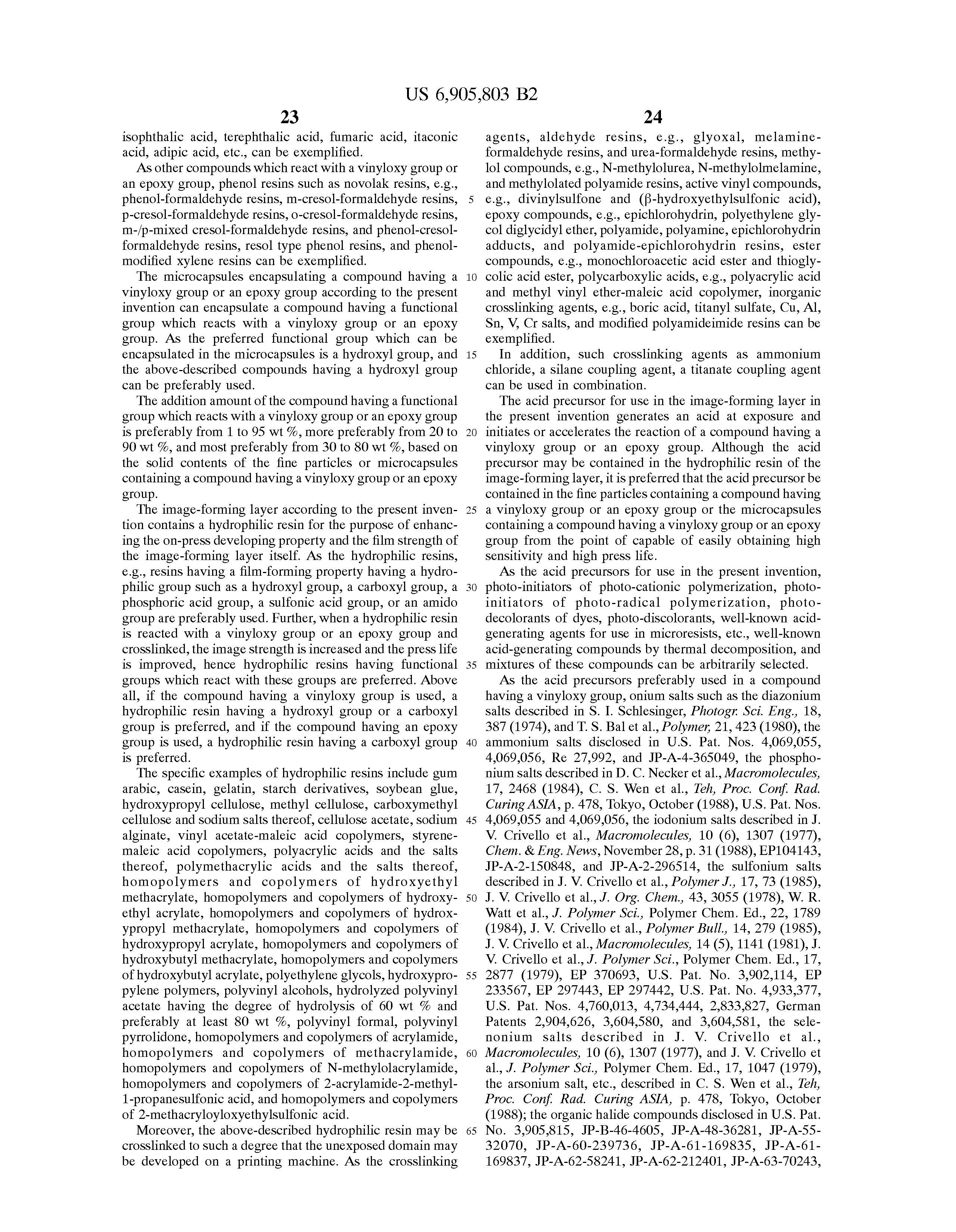The compound having a vinyloxy group or an epoxy group can be micro-encapsulated by well-known methods. For example, as the manufacturing method of the microcapsules, the method making use of coacervation as disclosed in U.S. Pat. Nos. 2,800,457 and 2,800,458, the interfacial polymerization method as disclosed in British Patent 990,443, U.S. Pat. No. 3,287,154, JP-B-38-19574 (the term “JP-B” as used herein means an “examined Japanese patent publication”), JP-B-42-446, and JP-B-42-711, the method by the deposition of a polymer as disclosed in U.S. Pat. Nos. 3,418,250 and 3,660,304, the method using isocyanate polyol wall materials as disclosed in U.S. Pat. No. 3,796,669, the method using isocyanate wall materials as disclosed in U.S. Pat. No. 3,914,511, the method using urea-formaldehyde series or urea-formaldehyde-resorcinol series wall materials as disclosed in U.S. Pat. Nos. 4,001,140, 4,087,376 and 4,089,802, the method using wall materials, such as melamine-formaldehyde resins and hydroxy cellulose, as disclosed in U.S. Pat. No. 4,025,445, the monomer polymerization in situ method as disclosed in JP-B-36-9163 and JP-B-51-9079, the spray drying method as disclosed in British Patent 930,422 and U.S. Pat. No. 3,111,407, and the electrolytic dispersion cooling method as disclosed in British Patents 952,807 and 967,074 can be exemplified, but the present invention is not limited thereto.