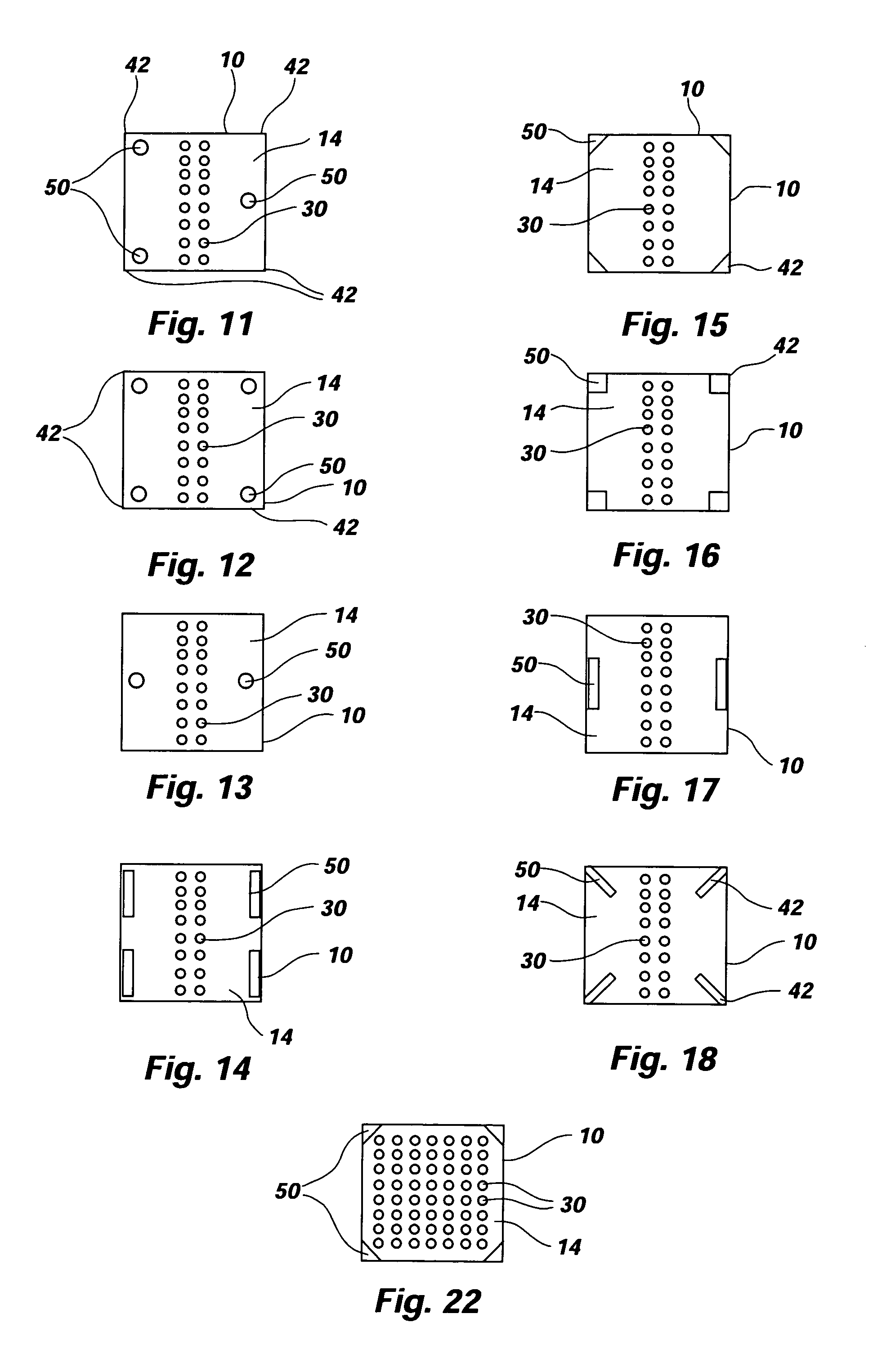 In addition, stabilizers 50 are configured to have sufficient strength and rigidity to maintain a substantially uniform minimum distance 28 between semiconductor device 10 and substrate 20 during the bonding of bond pads 12 of semiconductor device 10 to contact pads 40 of substrate 20. Stabilizers are also preferably configured to substantially maintain their configurations, dimensions, strength, and rigidity during any subsequent processing of the assembly of semiconductor device 10 and substrate 20, such as during the introduction of an underfill material therebetween, as well as during testing and normal operation of semiconductor device 10. Stabilizers 50 are also preferably configured to prevent tipping or tilting of semiconductor device 10 relative to substrate 20.