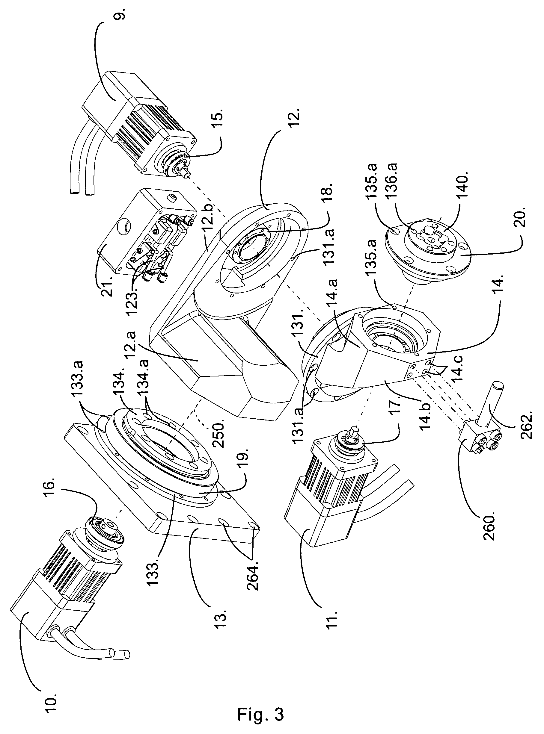 The yaw plate has an opening through which the drive shaft of the yaw or y rotary motor projects to engage and rotate the pitch plate 12 about the y axis 250. The y motor 10 is fixed to the yaw plate by screws using mounting holes 10 c (see