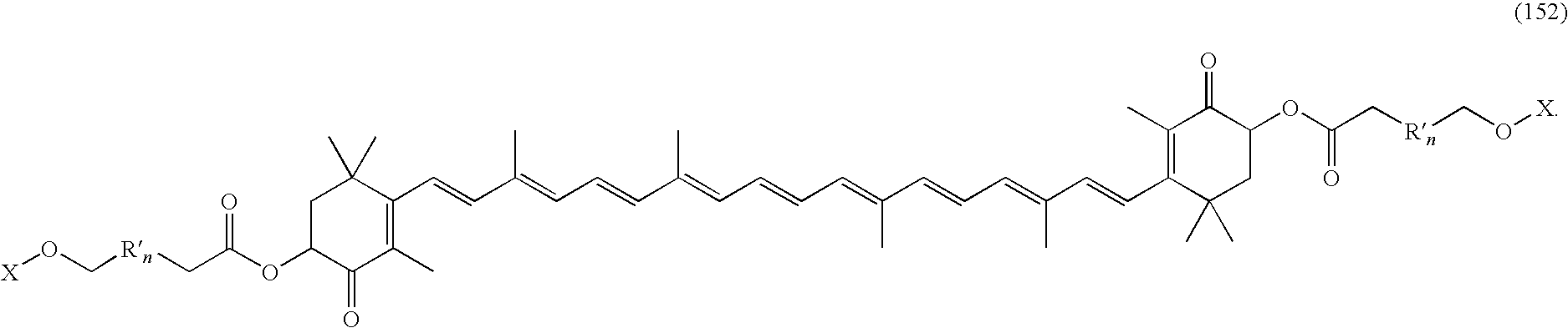 As used herein, terms such as “carotenoid analog” and “carotenoid derivative” generally refer to chemical compounds or compositions derived from a naturally occurring or synthetic carotenoid. Terms such as carotenoid analog and carotenoid derivative may also generally refer to chemical compounds or compositions that are synthetically derived from non-carotenoid based parent compounds; however, which ultimately substantially resemble a carotenoid derived analog. Non-limiting examples of carotenoid analogs and derivatives that may be used according to some of the embodiments described herein are depicted schematically in