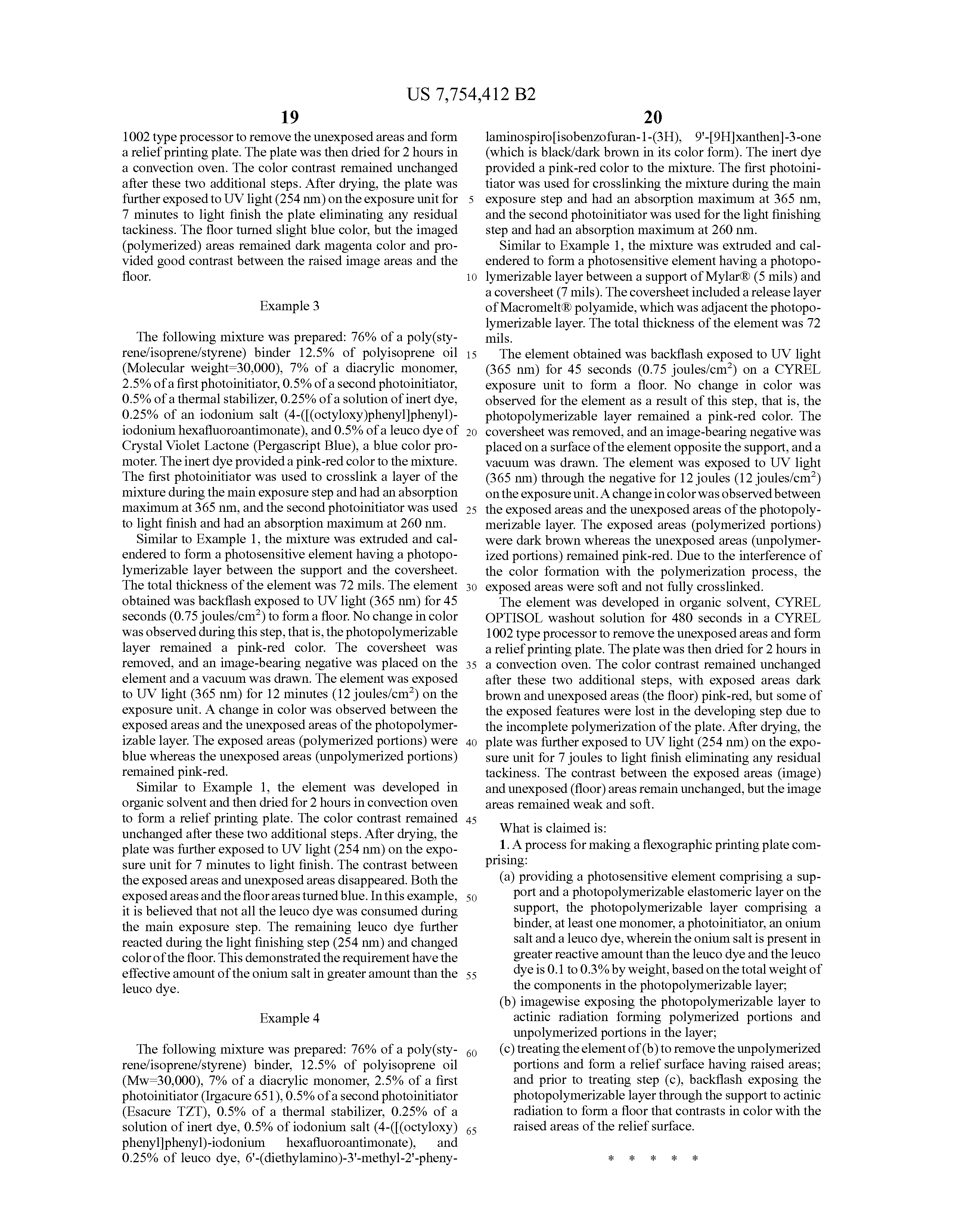 Similar to Example 1, the element was developed in organic solvent and then dried for 2 hours in convection oven to form a relief printing plate. The color contrast remained unchanged after these two additional steps. After drying, the plate was further exposed to UV light (254 nm) on the exposure unit for 7 minutes to light finish. The contrast between the exposed areas and unexposed areas disappeared. Both the exposed areas and the floor areas turned blue. In this example, it is believed that not all the leuco dye was consumed during the main exposure step. The remaining leuco dye further reacted during the light finishing step (254 nm) and changed color of the floor. This demonstrated the requirement have the effective amount of the onium salt in greater amount than the leuco dye.