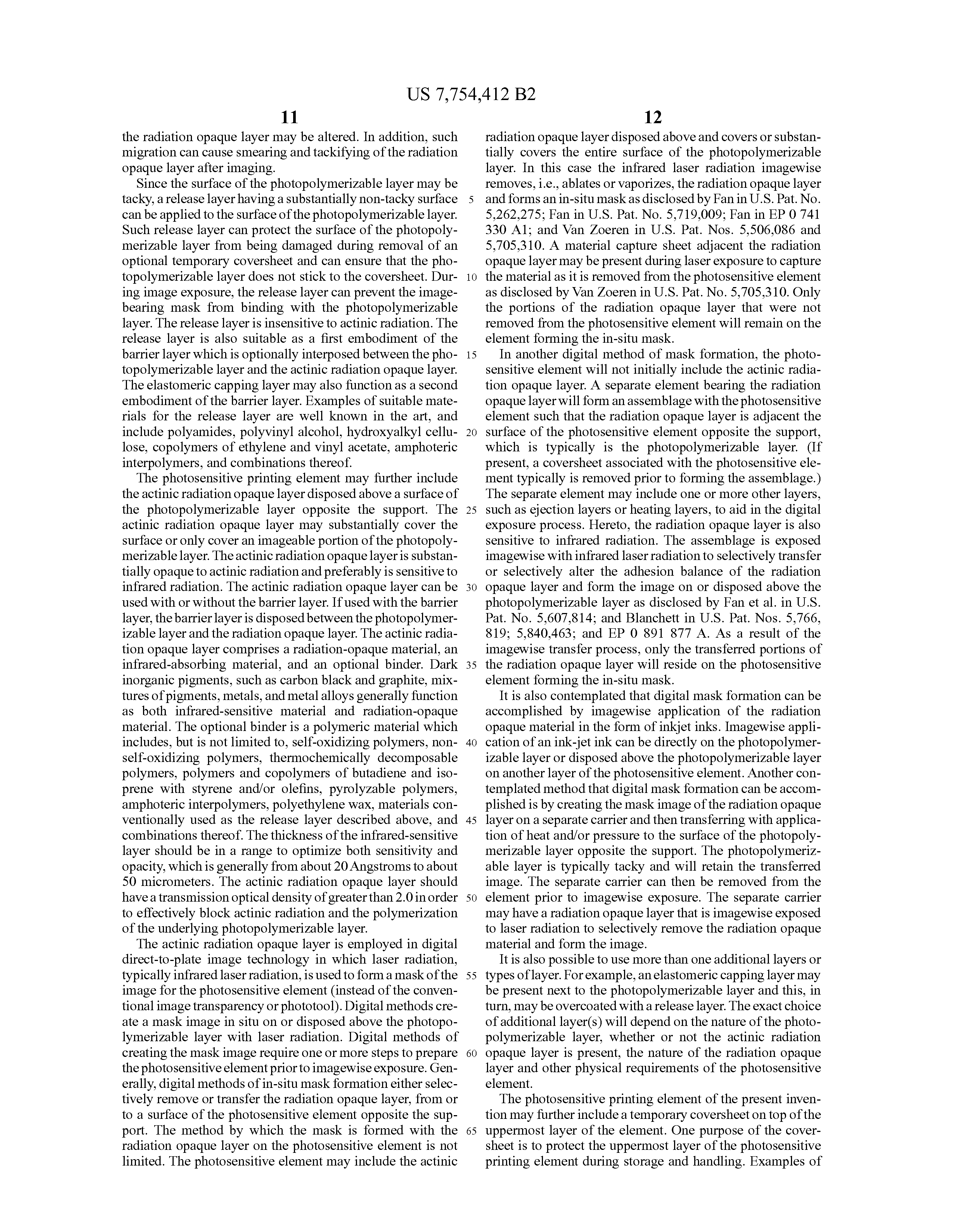 In another digital method of mask formation, the photosensitive element will not initially include the actinic radiation opaque layer. A separate element bearing the radiation opaque layer will form an assemblage with the photosensitive element such that the radiation opaque layer is adjacent the surface of the photosensitive element opposite the support, which is typically is the photopolymerizable layer. (If present, a coversheet associated with the photosensitive element typically is removed prior to forming the assemblage.) The separate element may include one or more other layers, such as ejection layers or heating layers, to aid in the digital exposure process. Hereto, the radiation opaque layer is also sensitive to infrared radiation. The assemblage is exposed imagewise with infrared laser radiation to selectively transfer or selectively alter the adhesion balance of the radiation opaque layer and form the image on or disposed above the photopolymerizable layer as disclosed by Fan et al. in U.S. Pat. No. 5,607,814; and Blanchett in U.S. Pat. Nos. 5,766,819; 5,840,463; and EP 0 891 877 A. As a result of the imagewise transfer process, only the transferred portions of the radiation opaque layer will reside on the photosensitive element forming the in-situ mask.