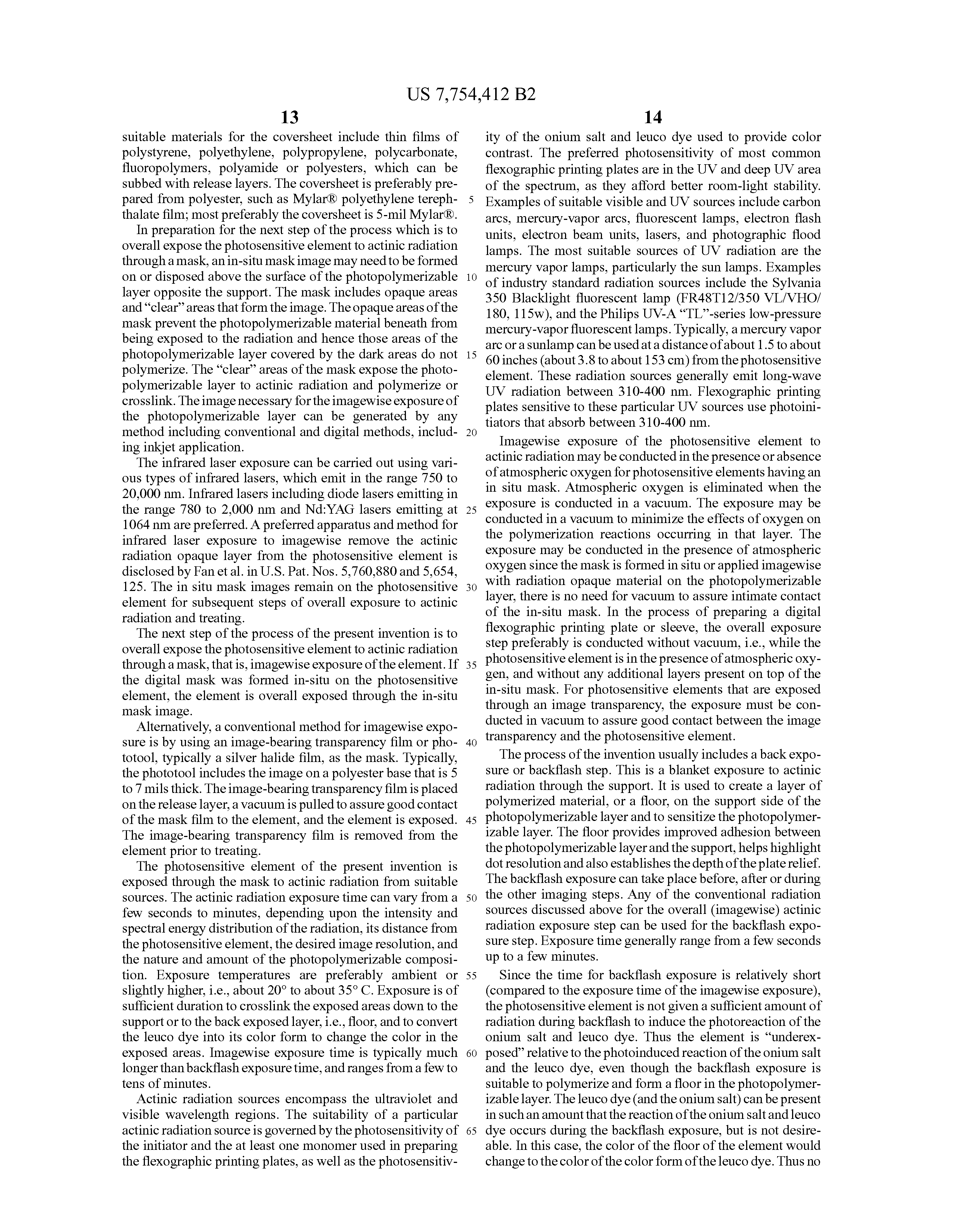 The infrared laser exposure can be carried out using various types of infrared lasers, which emit in the range 750 to 20,000 nm. Infrared lasers including diode lasers emitting in the range 780 to 2,000 nm and Nd:YAG lasers emitting at 1064 nm are preferred. A preferred apparatus and method for infrared laser exposure to imagewise remove the actinic radiation opaque layer from the photosensitive element is disclosed by Fan et al. in U.S. Pat. Nos. 5,760,880 and 5,654,125. The in situ mask images remain on the photosensitive element for subsequent steps of overall exposure to actinic radiation and treating.