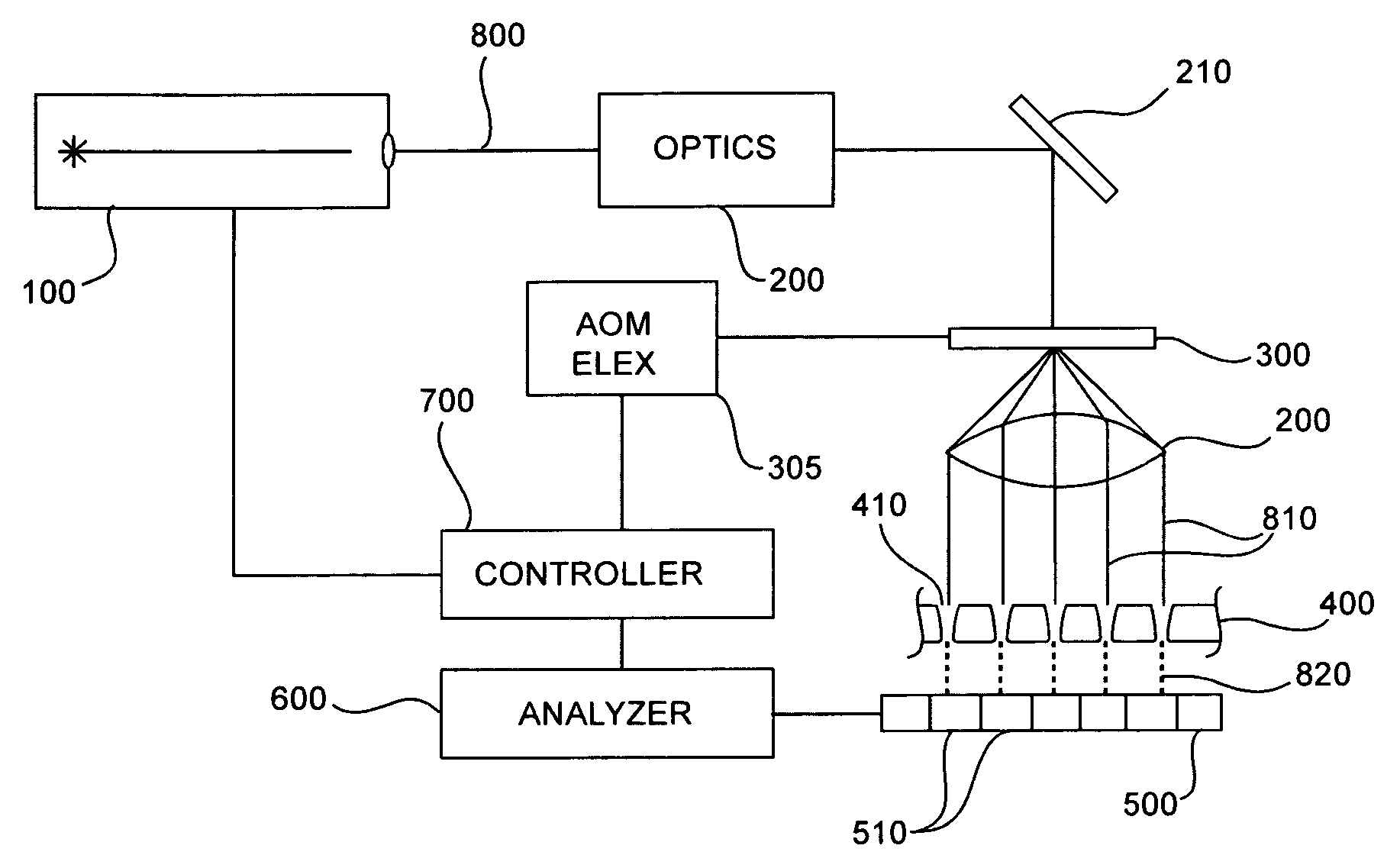 In this embodiment of the invention the beam splitter (300) may be implemented as an acousto-optic modulator driven at a multiplicity of frequencies to split the beam. This may be implemented to create an either one or two dimensional array. Two dimensional arrays are achieved by driving the acousto-optic element in two dimensions, or by using two separate acousto-optic elements, one rotated, preferably by 90°, relative to the other. The detector (500) may be a charge-coupled-device or similar imaging detector. The analyzer (600) may be a hardwired analog processor, a hardwired digital processor, or a programmable processor (including a computer). The synchronizing controller (700) may similarly be hardwired or a programmable processor.